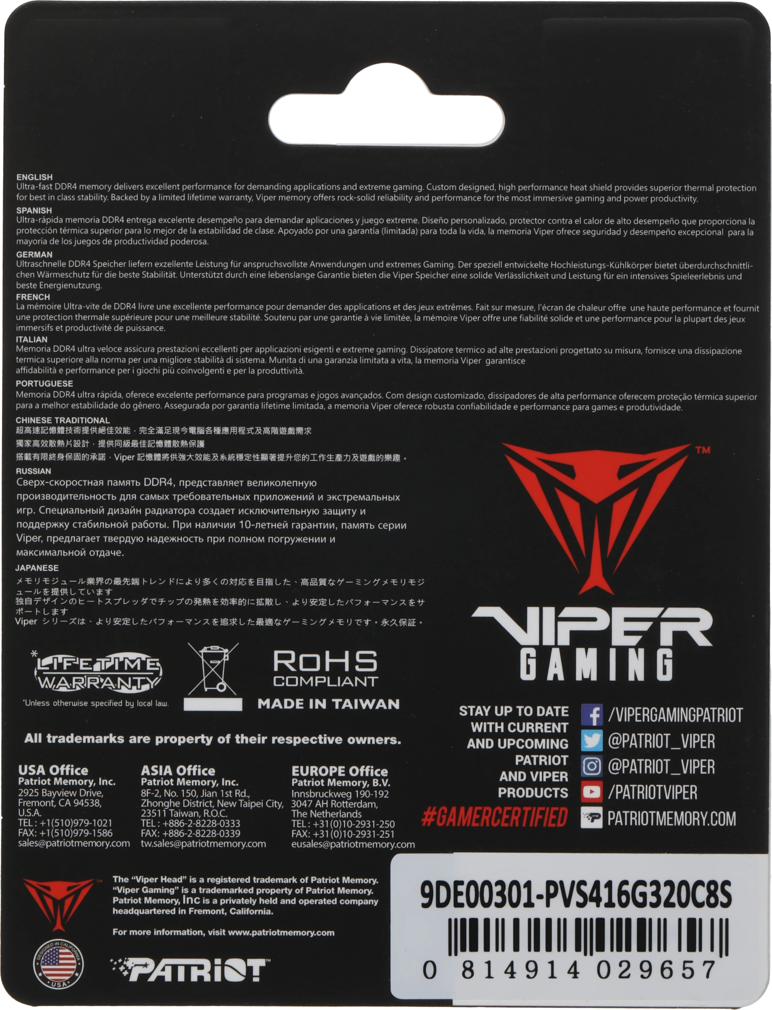 Память DDR4 16GB 3200MHz Patriot PVS416G320C8S