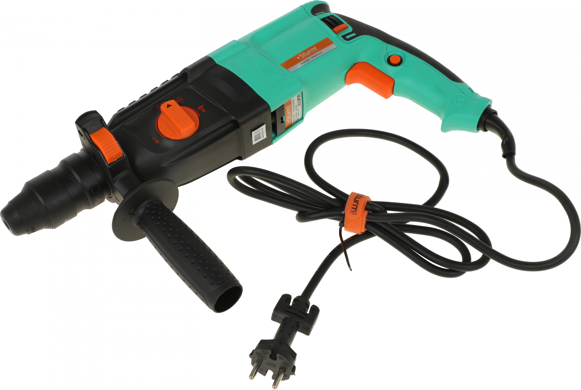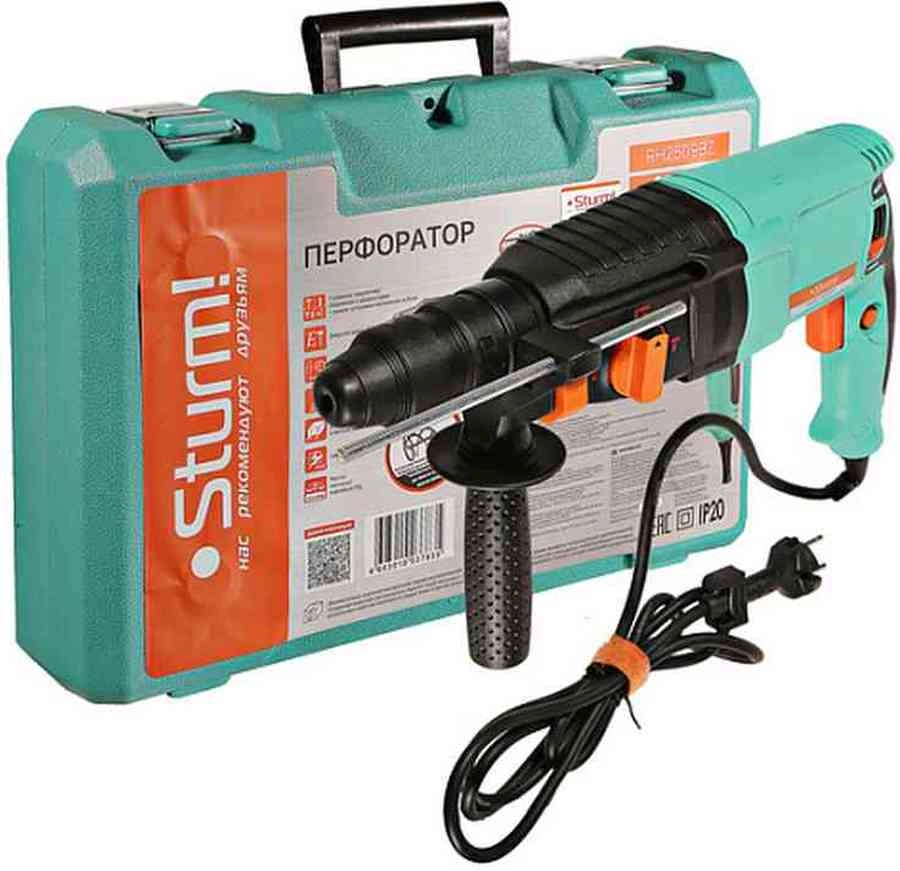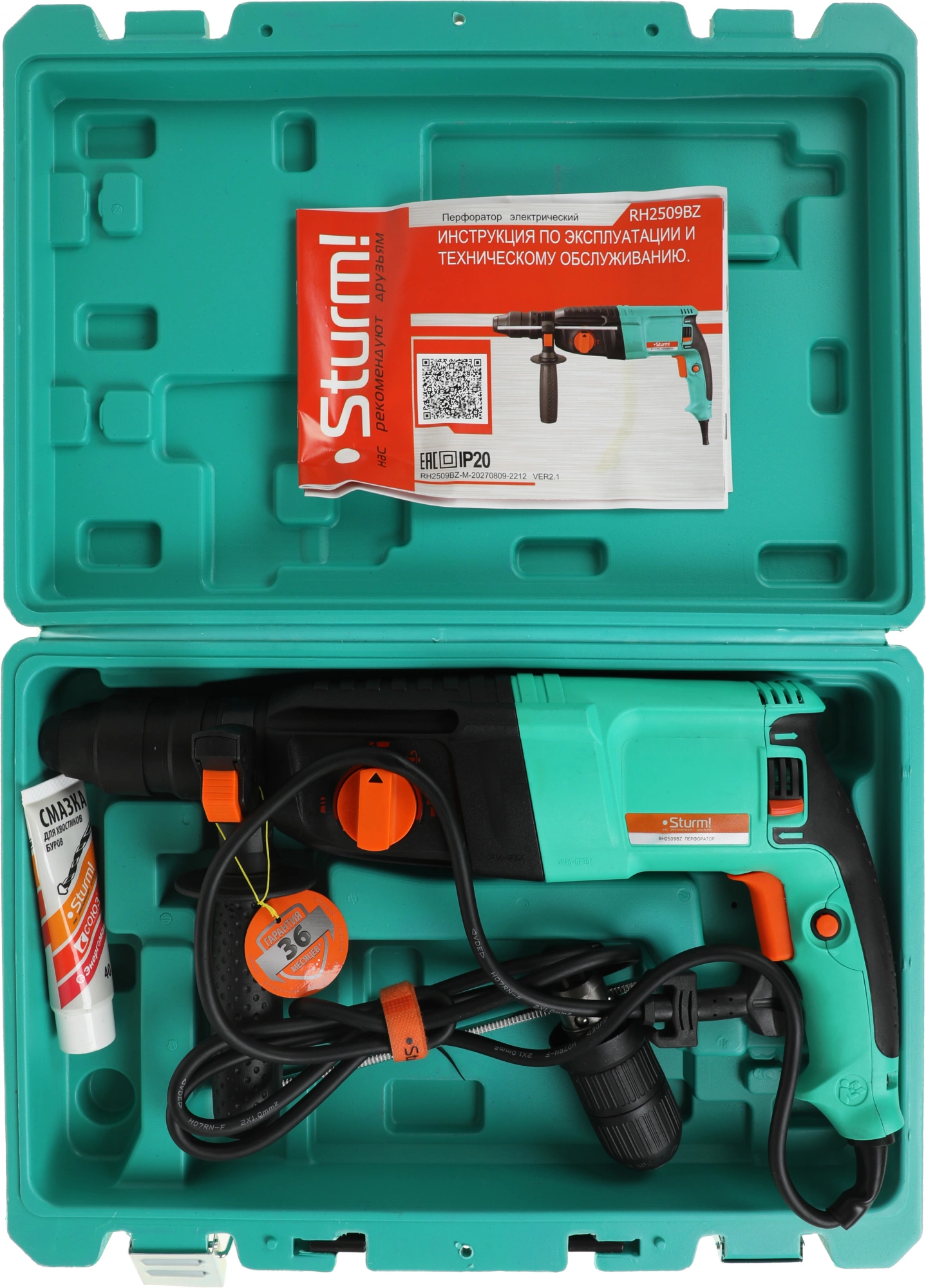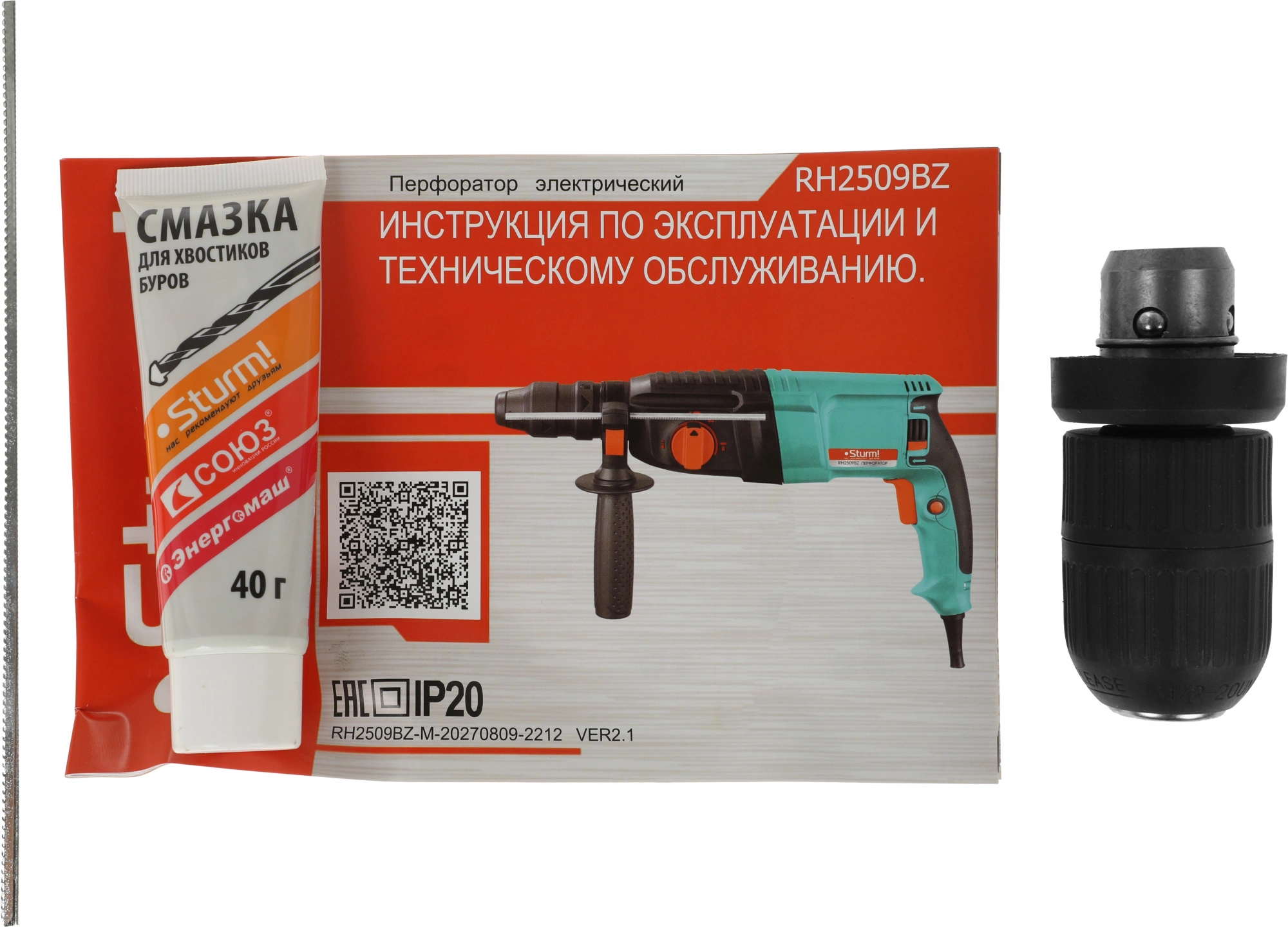 Перфоратор, дополнительный быстрозажимной патрон, вспомогательная рукоятка, ограничитель глубины сверления, смазка для хвостовиков буров, дополнительные графитовые щетки (комплект -2 шт.), инструкция по эксплуатации, кейс.