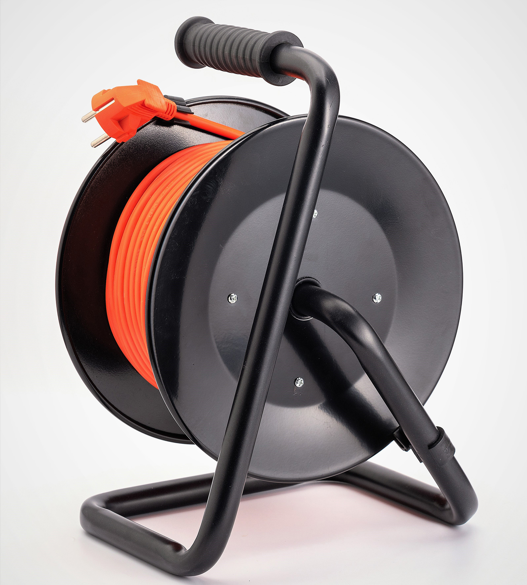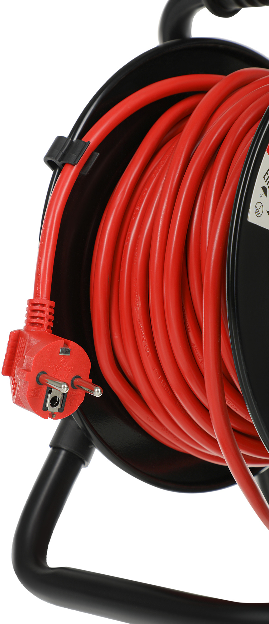 Кабель прибора выполнен из яркого материала, его хорошо видно на любом фоне. Внешний материал, который оплетает три заизолированных медных жилы, выдерживает широкий диапазон температур и устойчив к образованию плесени и грибка. Общая длина провода — 30 м. Сматывать и разматывать его очень легко благодаря форме катушки с подставкой, в виде которой изготовлена данная модель. На верхней части силового удлинителя находится удобная ручка с резиновым покрытием, она не скользит в руке и обеспечивает эргономичную переноску.