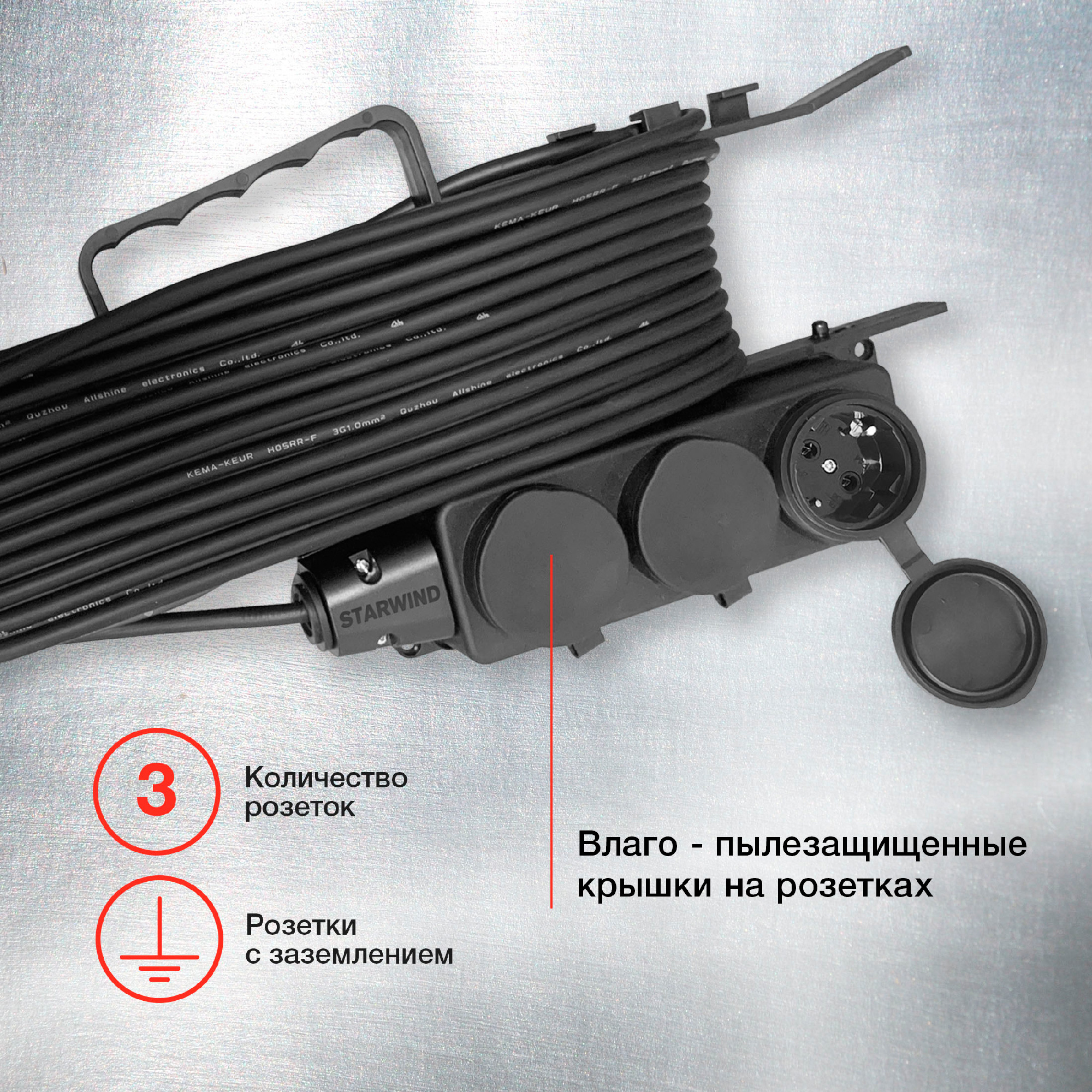 Всего данная модель предлагает три розетки. Она выдерживает силу тока до 16 А и мощность до 3500 Вт. Этого достаточно даже для энергоёмких девайсов или для организации разветвления на несколько устройств. Каждый из слотов прибора надежно защищен от проникновения влаги и пыли. Кабель Starwind ST-PS3.20/FRB-16 изготовлен из материала, устойчивого к низким температурам, внутри него находится медный проводник. Сечение кабеля - 3х1.0 мм2. Каждая из жил отдельно заизолирована.