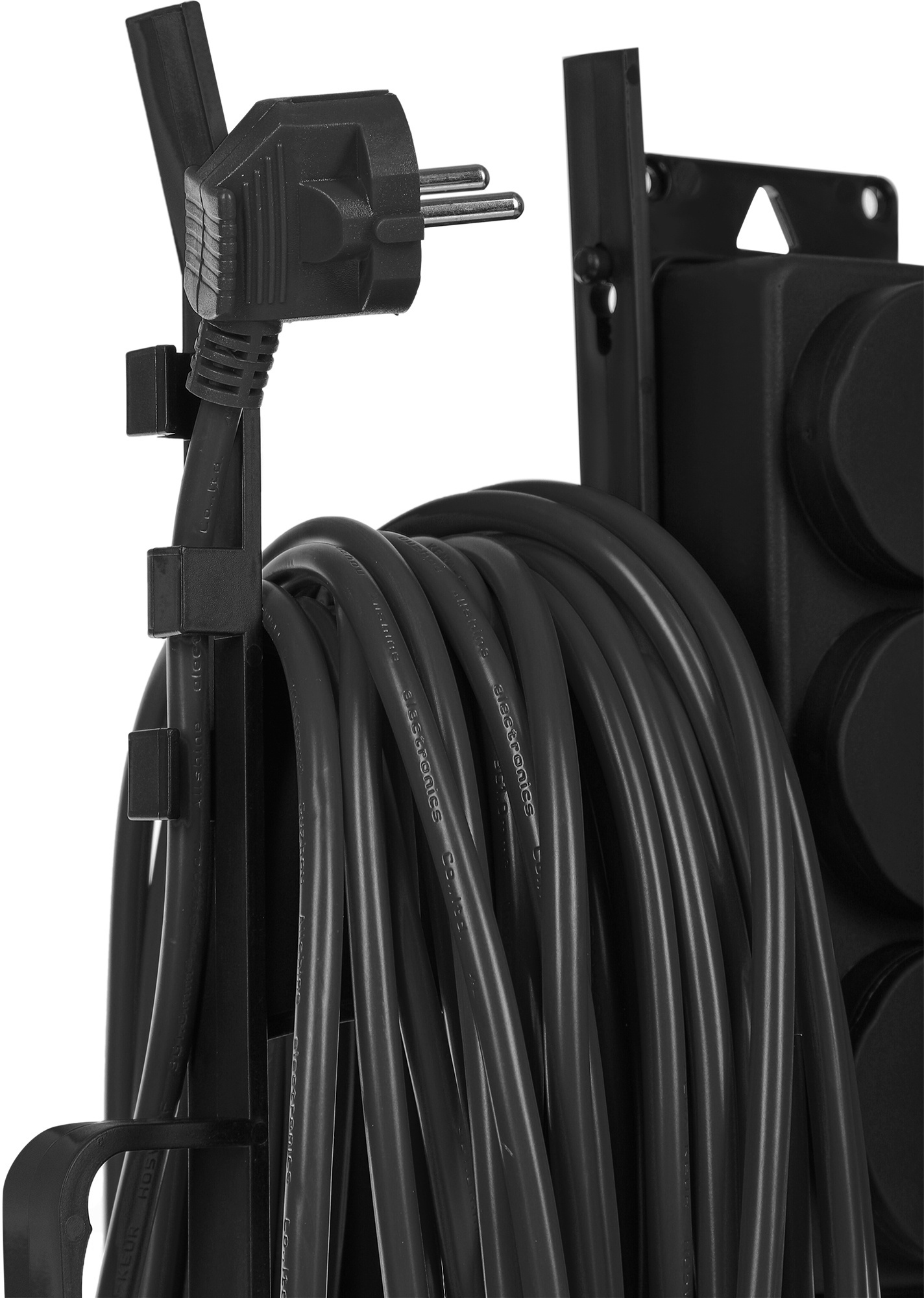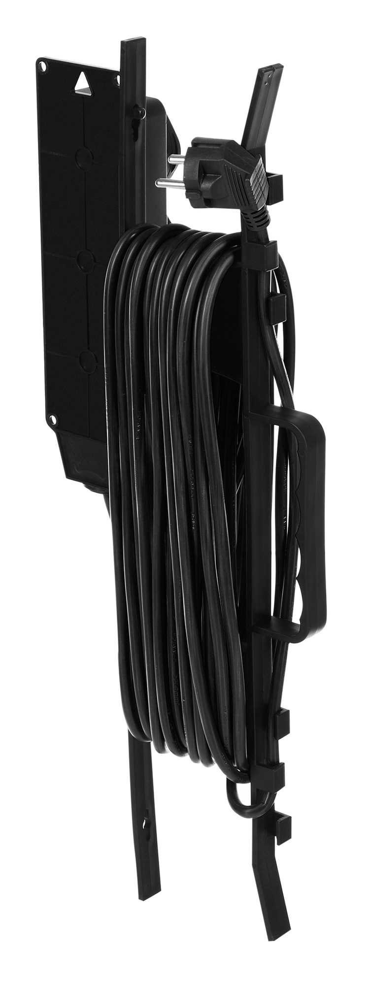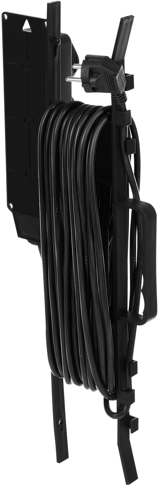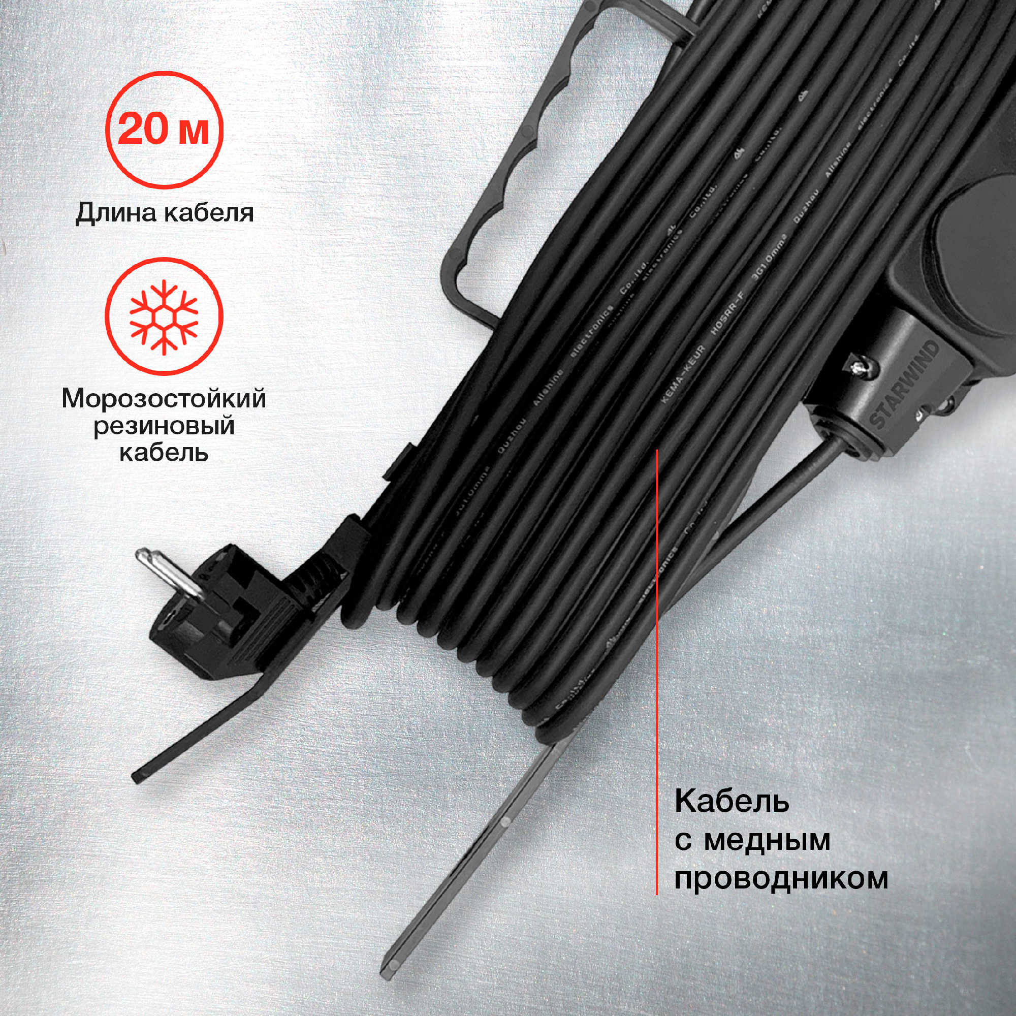 Катушка оборудована эргономичной рамкой ручкой для сматывания провода, а общая длина кабеля составляет 20 м.