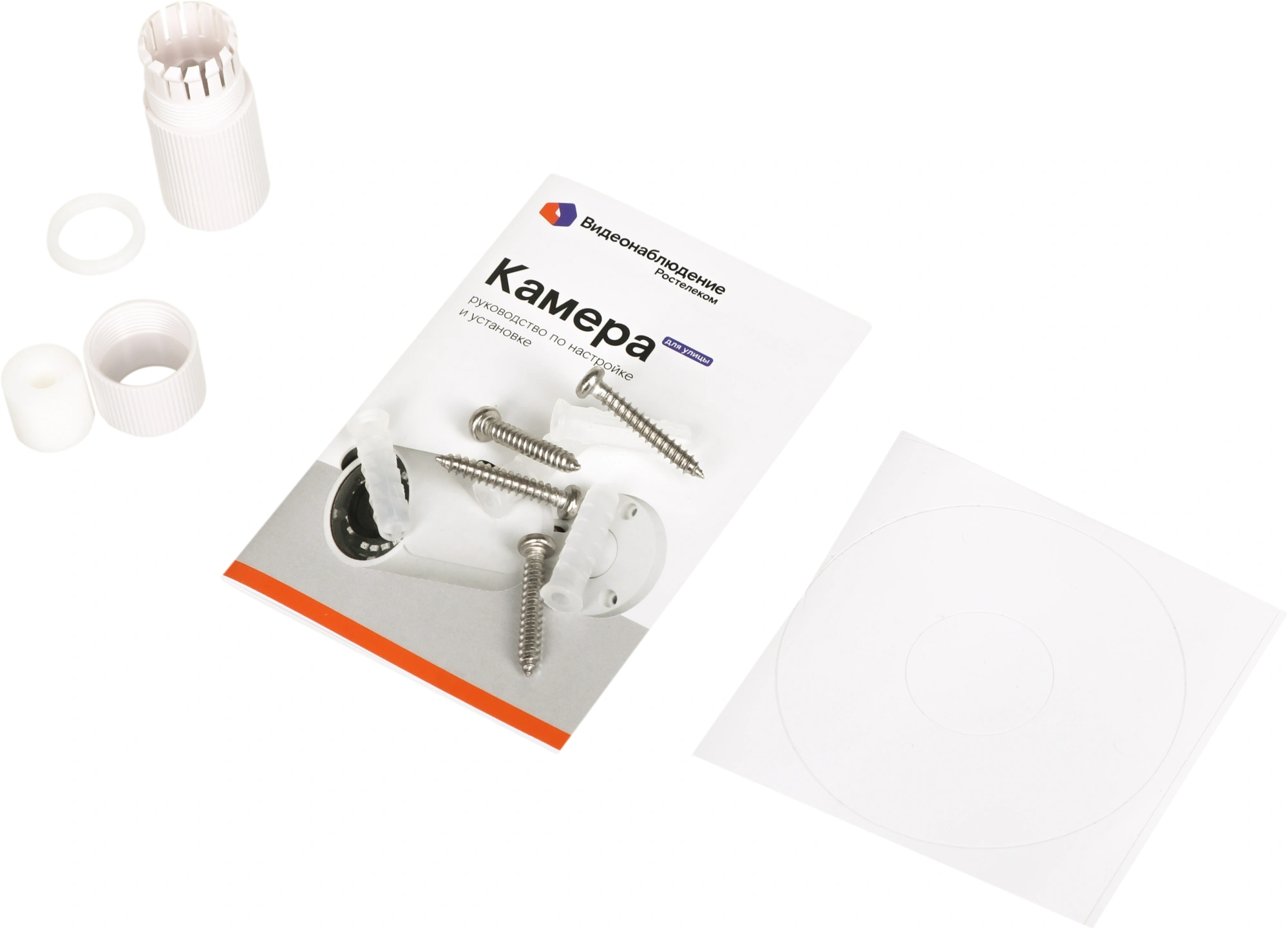 Камера, крепежный набор, защитный кожух для Ethernet кабеля, самоклеящийся шаблон крепления, краткое руководство пользователя и гарантийный талон.