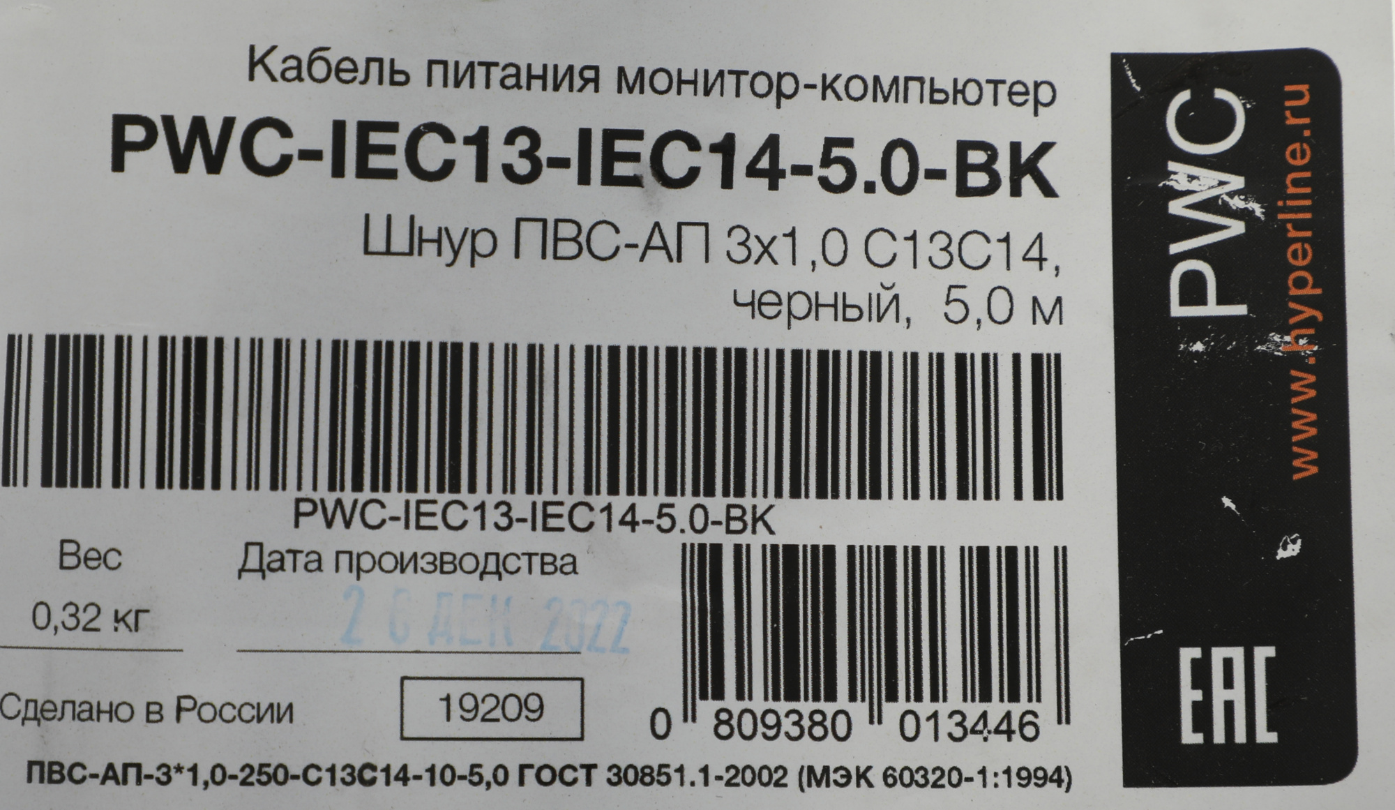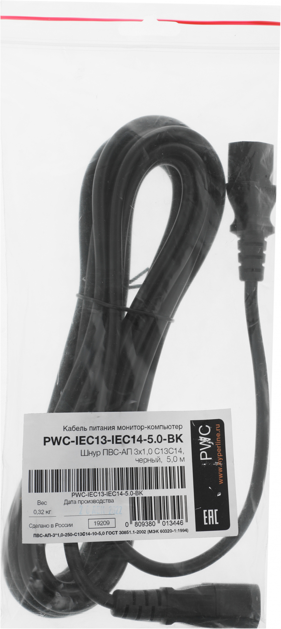 C13-С14 проводник.:3x1.0мм2 5м 230В 10А (упак.:1шт...