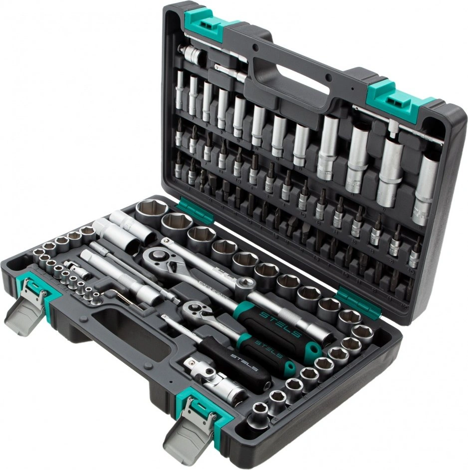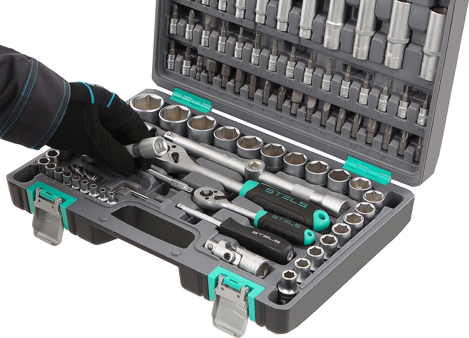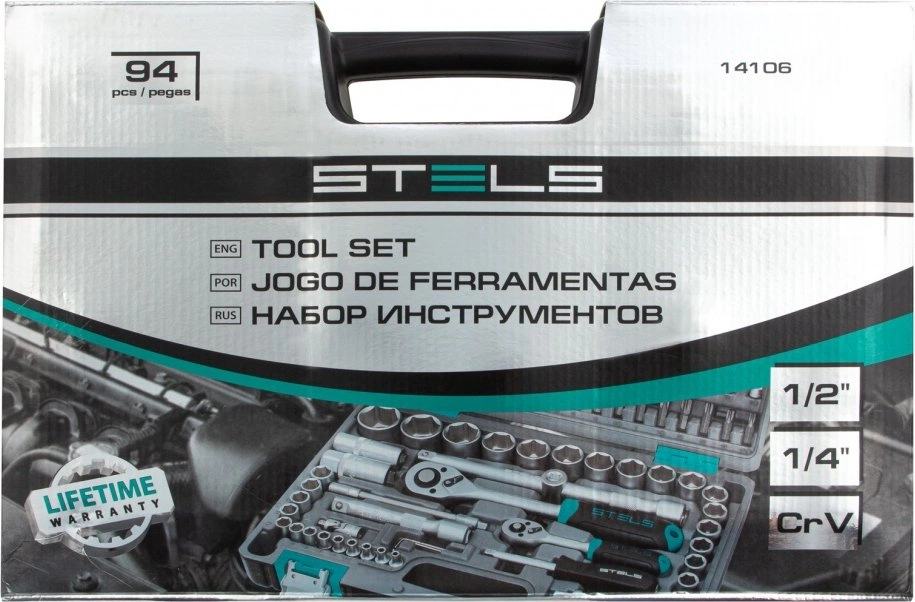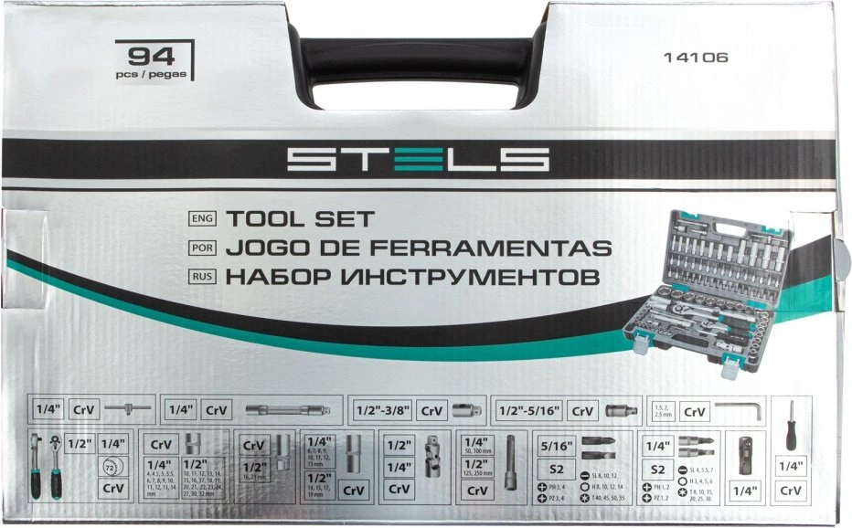 Набор инструментов Stels 14106 в пластиковом кейсе включает в себя 94 предмета с хвостовиком 1/2 и 1/4 дюйма из стали марки CrV. Он применяется для монтажа и демонтажа резьбовых соединений при обслуживании и ремонте авто, а также при выполнении бытовых задач.