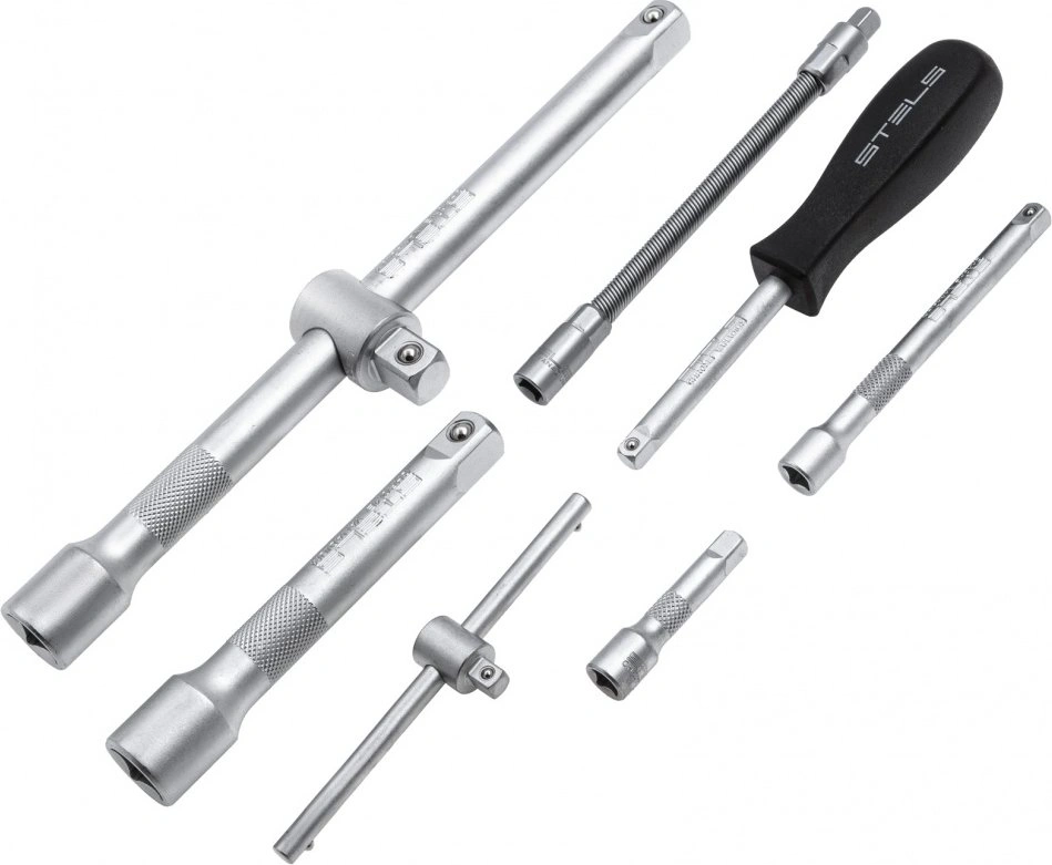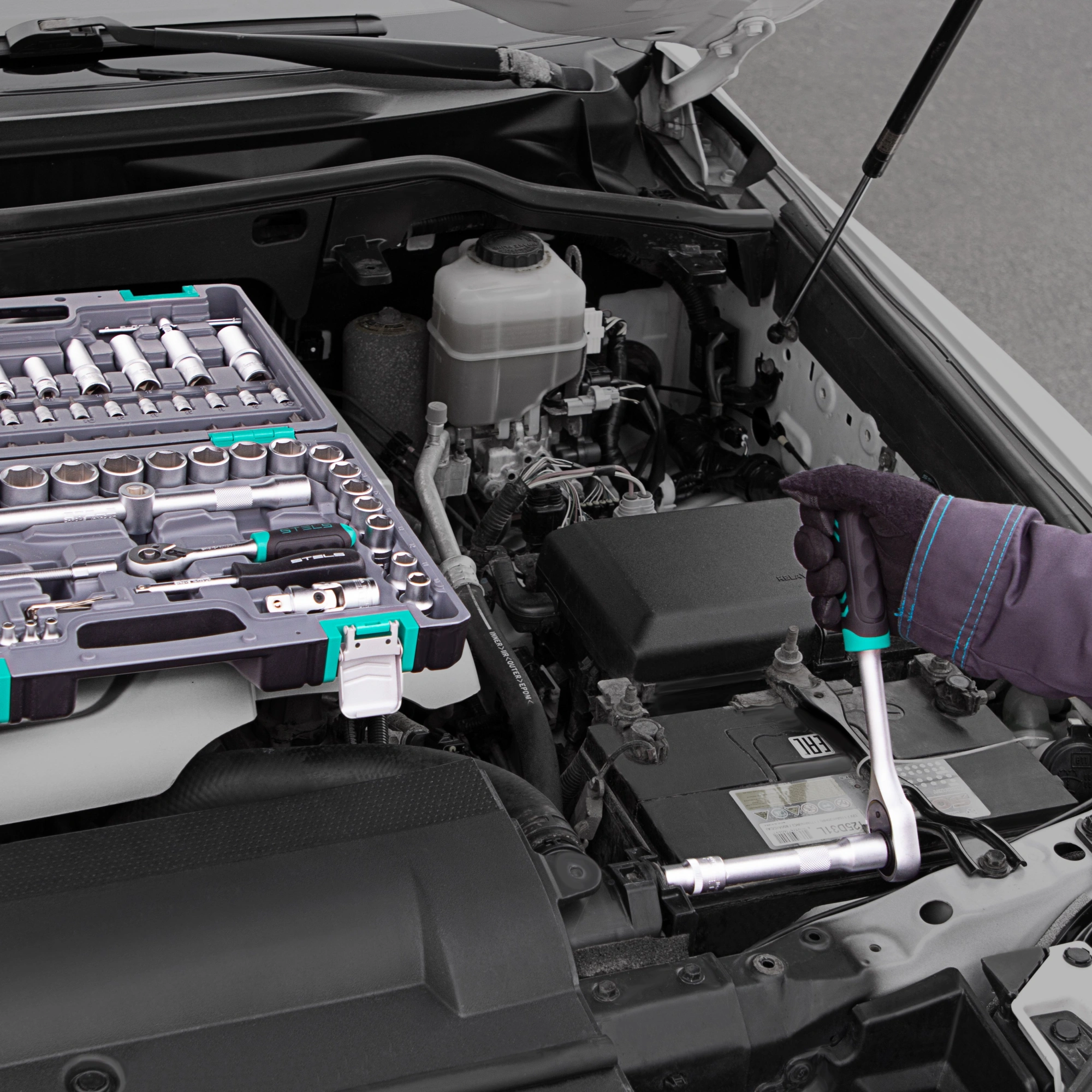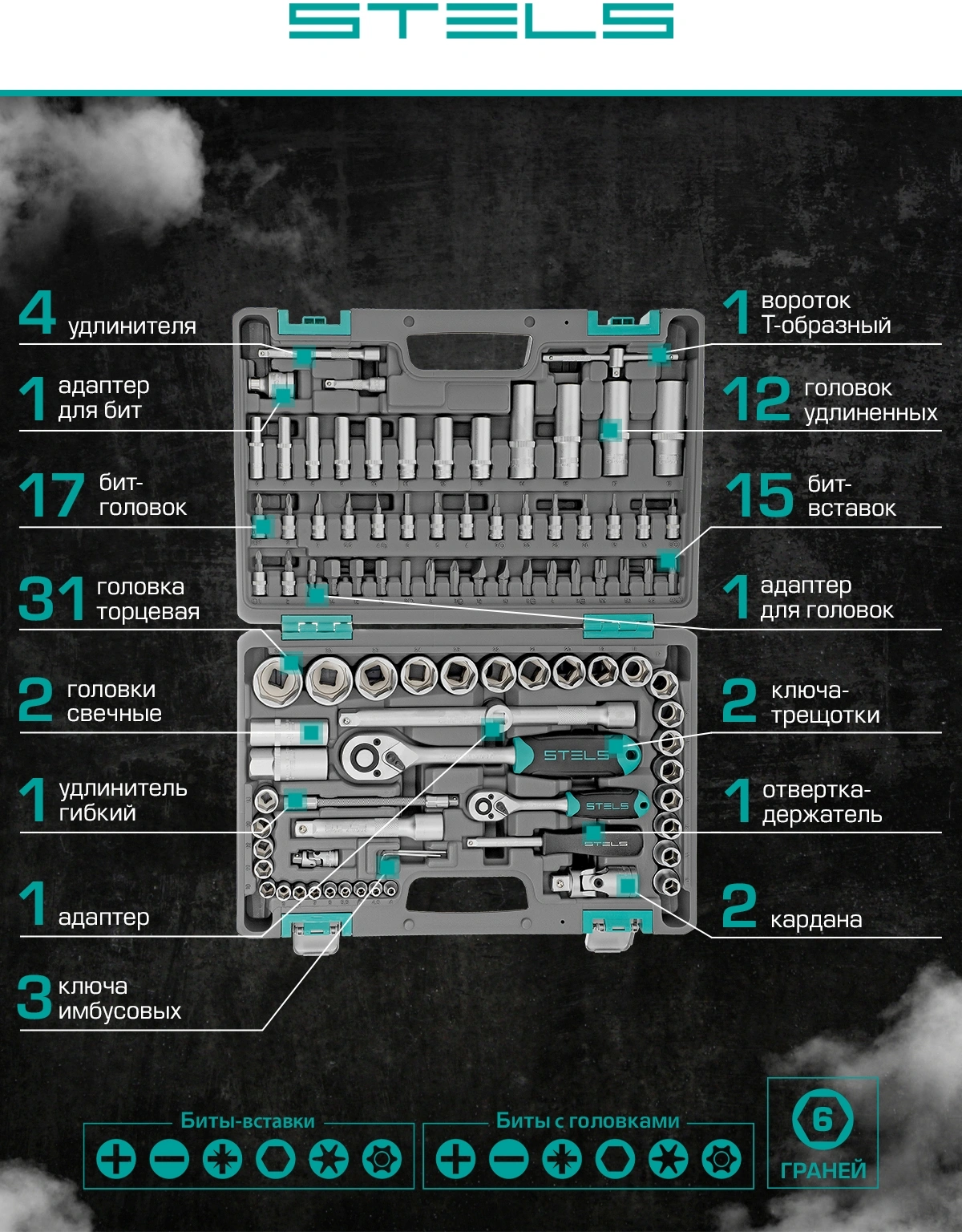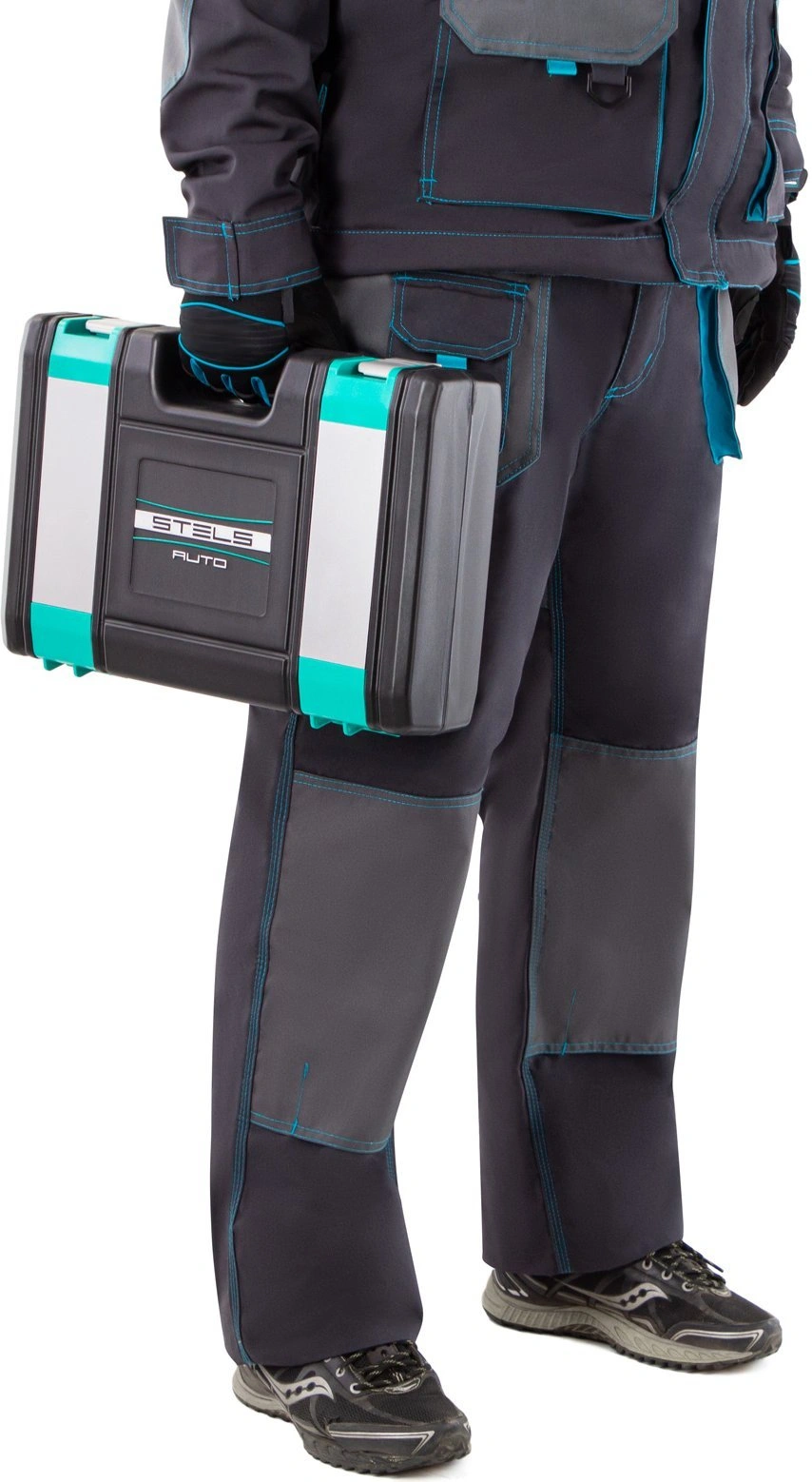 Набор инструментов Stels 14106 в пластиковом кейсе включает в себя 94 предмета с хвостовиком 1/2 и 1/4 дюйма из стали марки CrV. Он применяется для монтажа и демонтажа резьбовых соединений при обслуживании и ремонте авто, а также при выполнении бытовых задач.