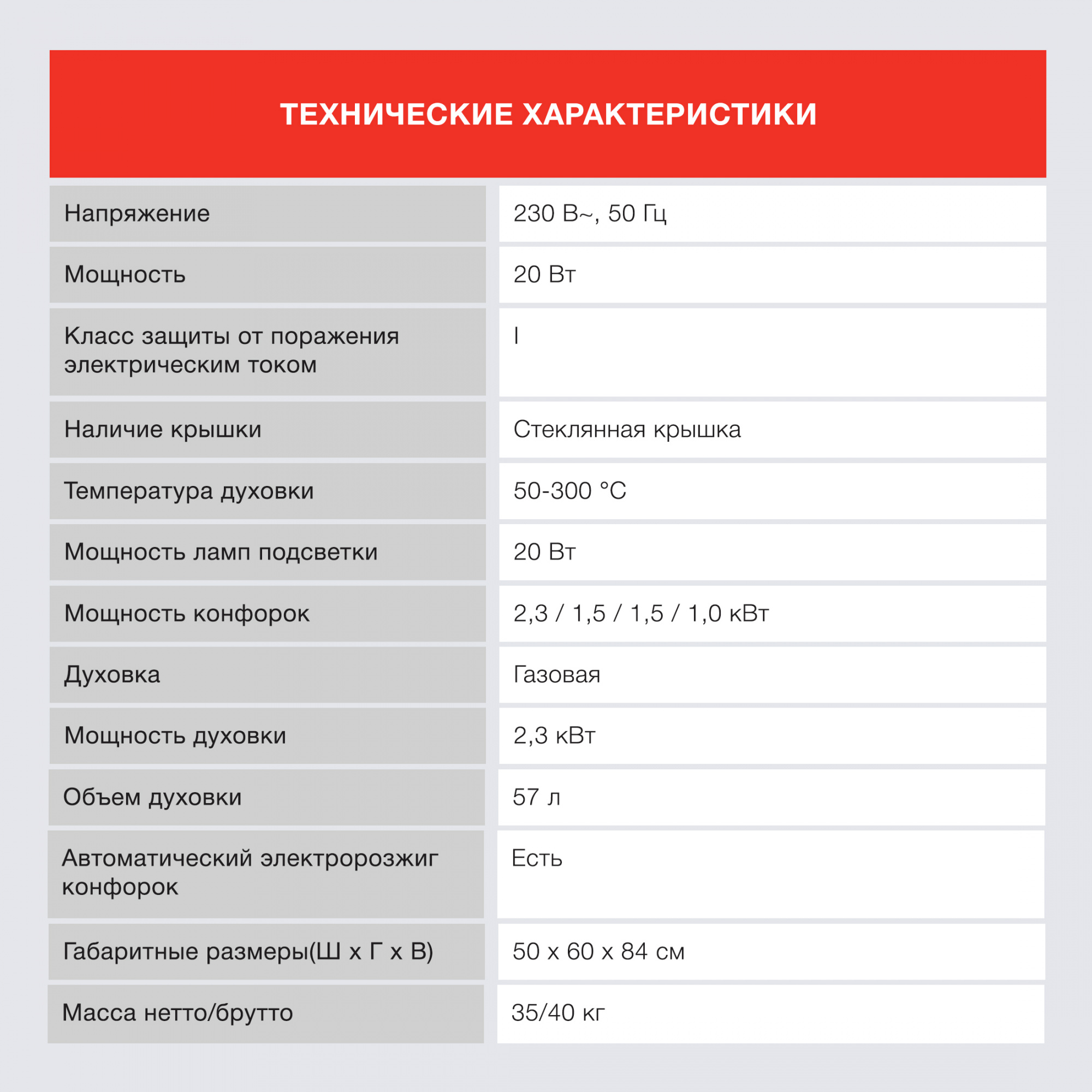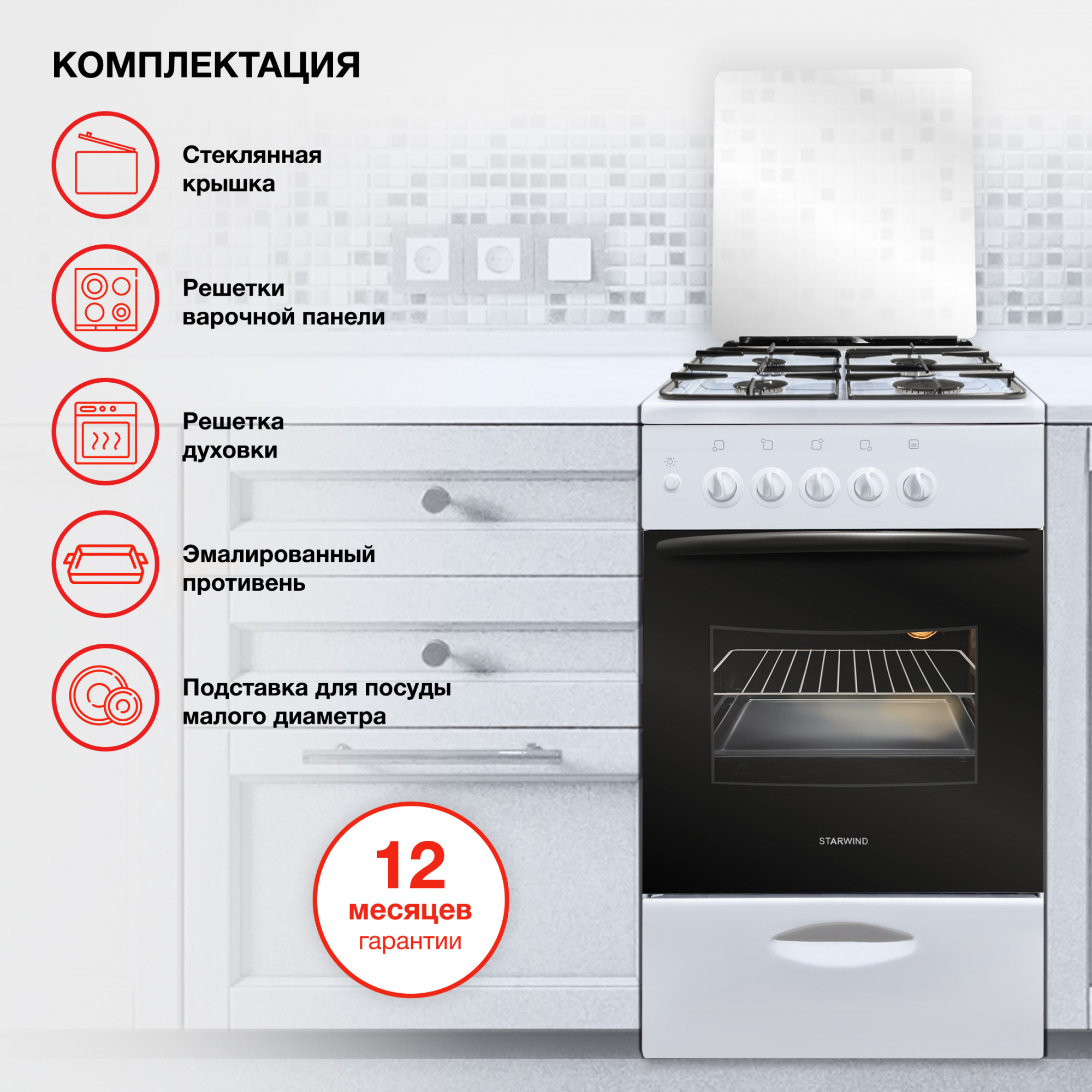 Плита газовая StarWind SRGG521 благодаря своим компактным размерам (ширина 50 см, глубина 60 см) легко разместится