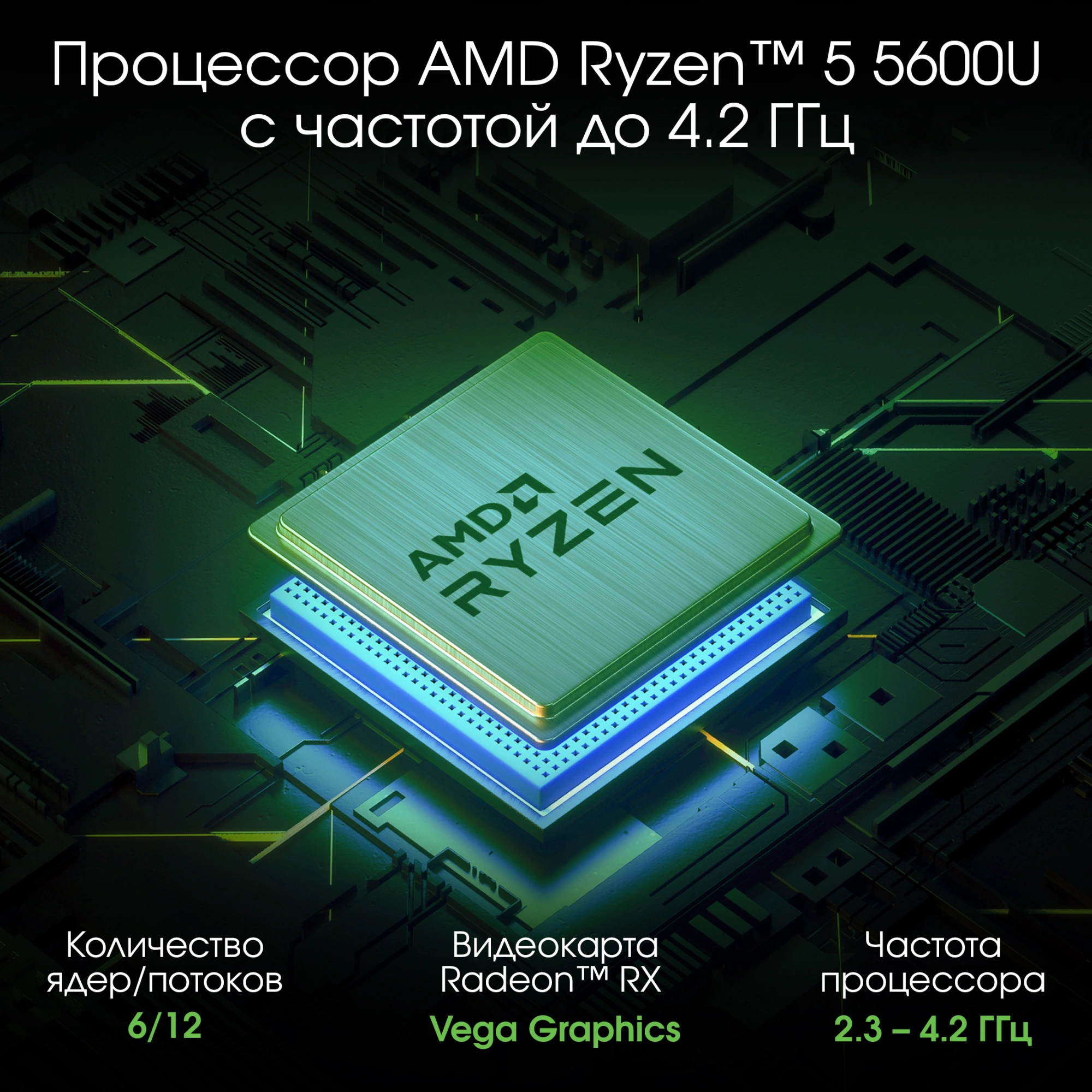 6-ядерный процессор AMD Ryzen 5 5600U с 12 активными цифровыми потоками обеспечивает моментальный отклик ноутбука на любые команды.