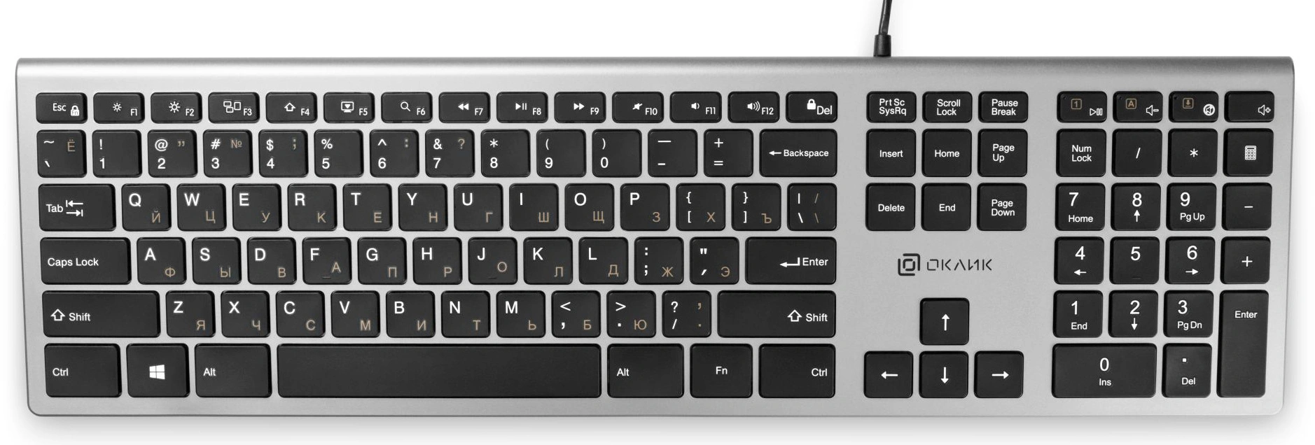 Девайс выполнен в строгом и элегантном Slim-дизайне и хорошо впишется в интерьер любого офиса. Oklick 890S не займет много места: размеры устройства – 44х12х2,3 см. Корпус изготовлен из высококачественного пластика, что делает его прочным и износостойким. Благодаря прорезиненным антифрикционным ножкам клавиатура устойчиво стоит на столе и не скользит во время быстрого набора текстов. Модель Oklick 890S совместима с ОС Windows и Linux и подключается к ПК с помощью 1,6-метрового USB-кабеля.