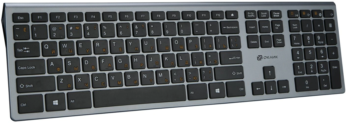 У модели Oklick 890S – 109 клавиш, из них 12 – для выполнения разных мультимедийных команд. Особенности этой клавиатуры – долговечность и эргономика. Благодаря ножничному механизму нажатия устройство работает практически бесшумно и отличается долгим сроком службы: выдержит до 10 млн кликов. Низкий профиль клавиш позволяет быстрее вводить текст.