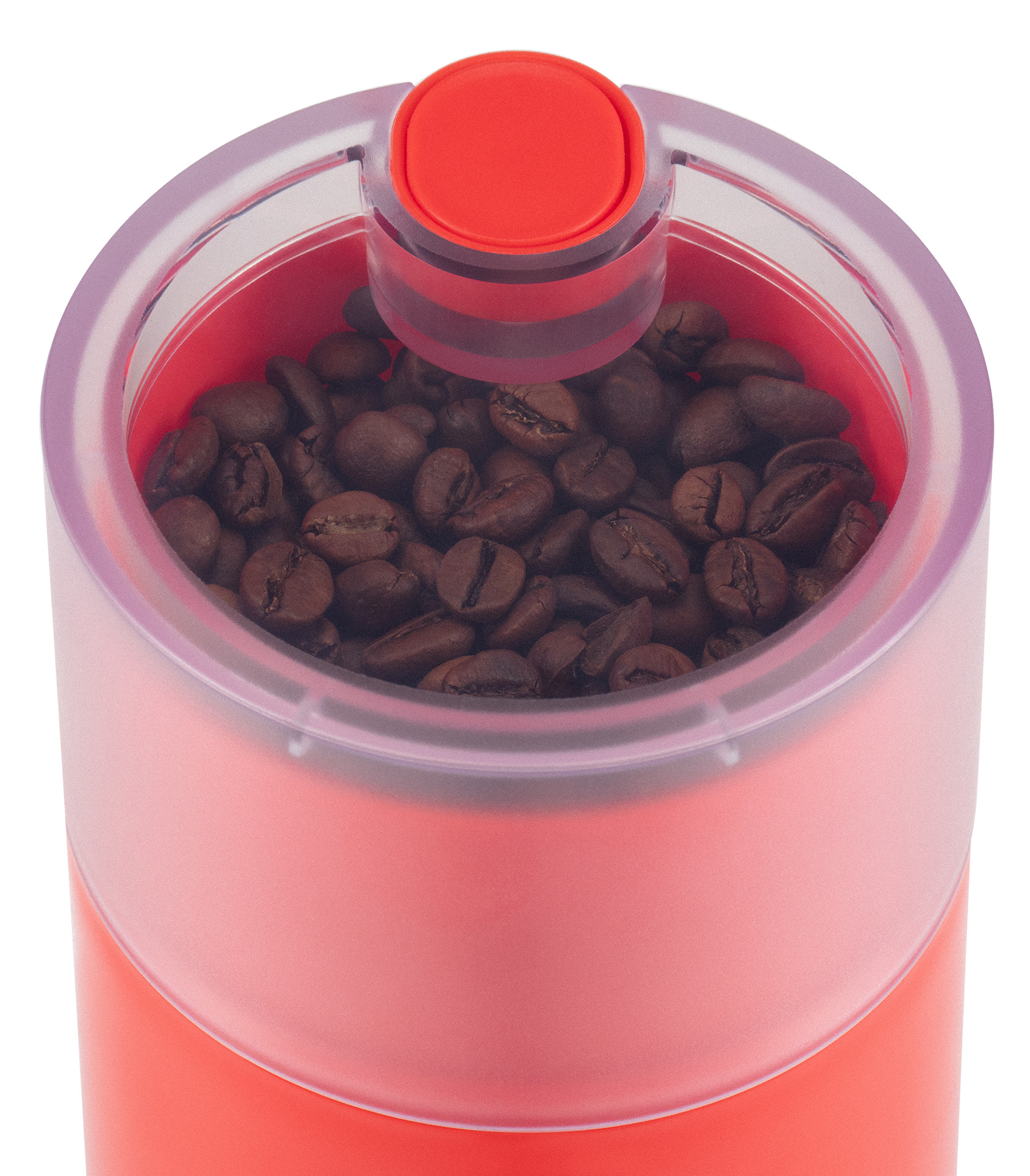 Активируется прибор плотным закрытием крышки и нажатием на соответствующую кнопку. Его корпус выполнен из стильного красного пластика, а верхняя часть прозрачна, чтобы давать возможность пристально следить за процессом перемалывания. Кофемолка мало весит и имеет скромные габаритные размеры, так что её вполне можно взять с собой в поездку для приготовления напитка привычной конфигурации.