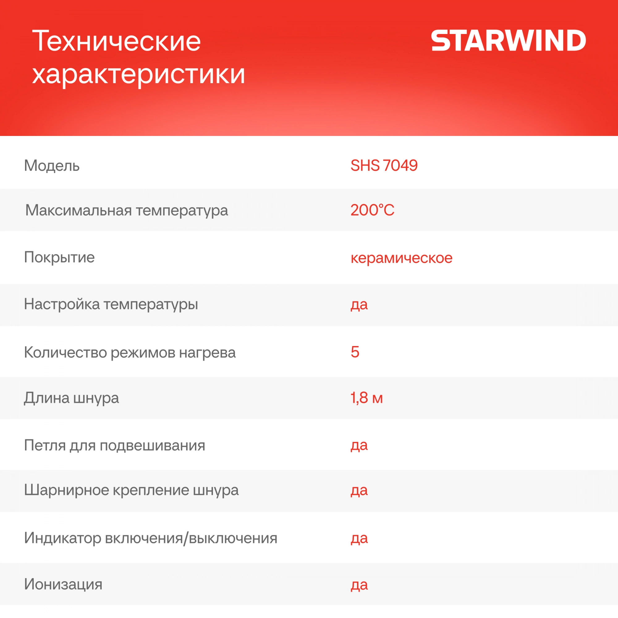 Starwind SHS 7049 – это эргономичная современная плойка, выполненная из самых подходящих для бережного ухода за волосами материалов.