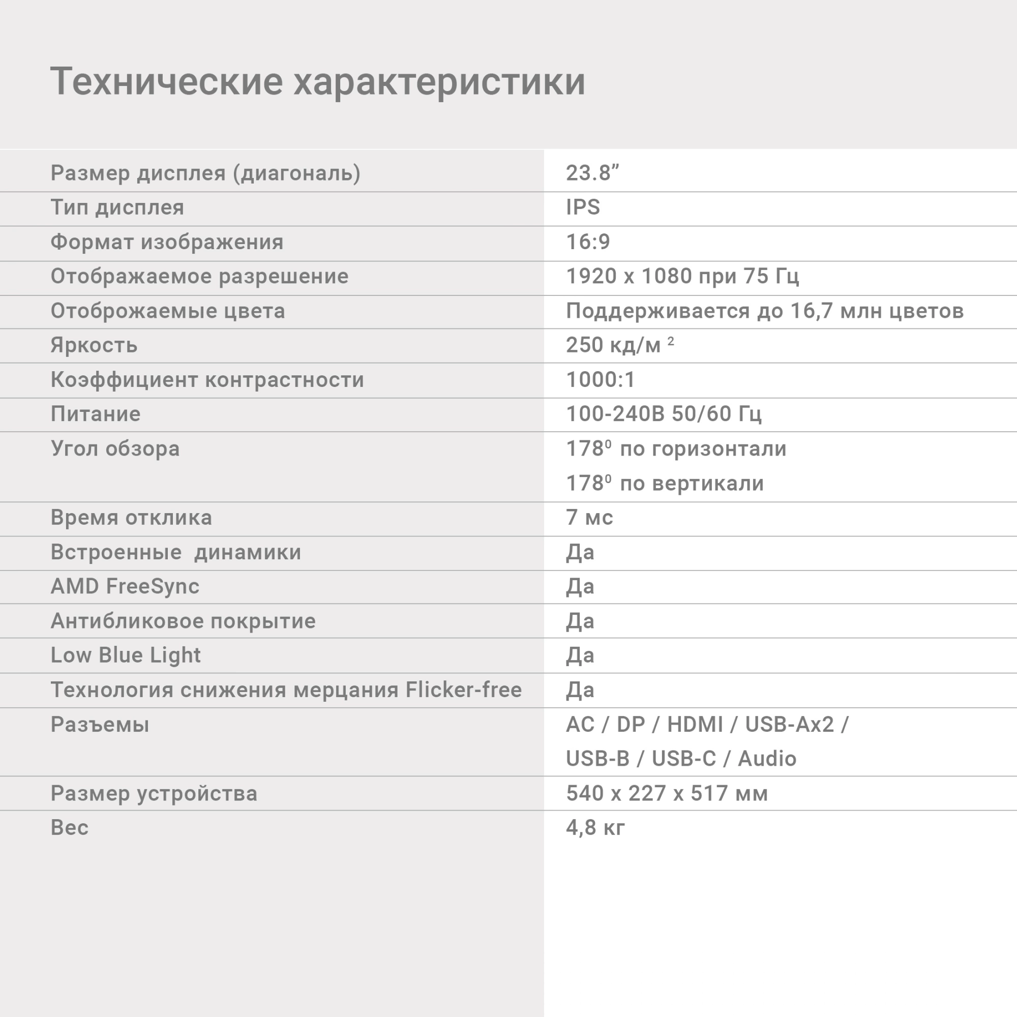 Благодаря разрешению Full HD (1920?1080) и IPS-матрице монитор передает яркое, четкое и реалистичное изображение. Частота обновления экрана 75 Гц оптимальна не только для офисных задач, но и для просмотра фильмов. Дополнительно монитор поддерживает технологию AMD FreeSync, которая помогает устранить задержки и рывки при воспроизведении видеоконтента.