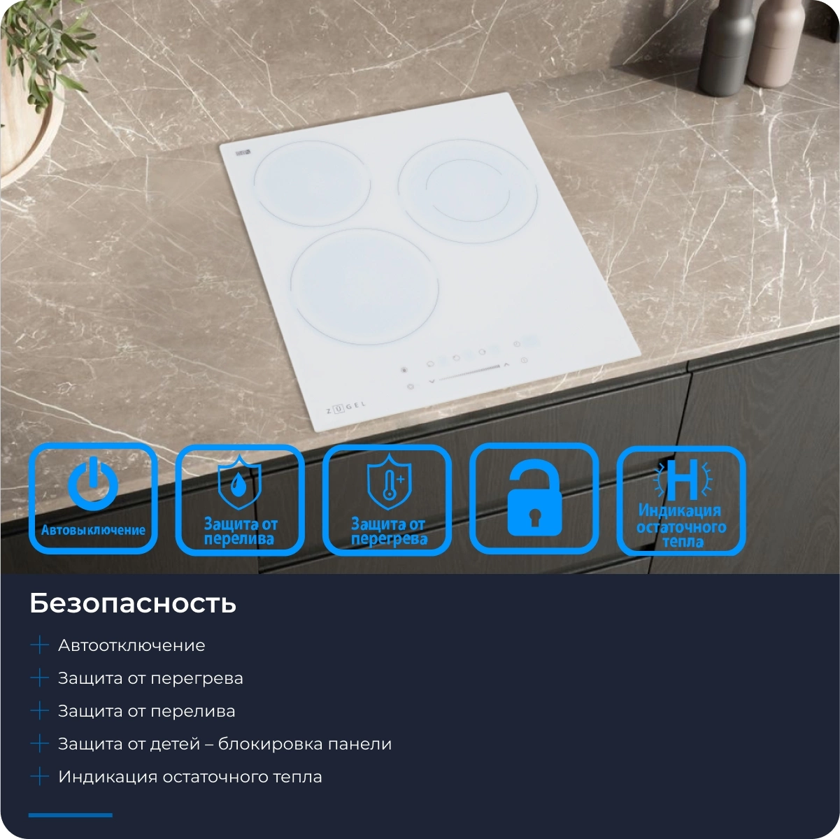 блокировка управления (защита от детей), защитное отключение, отключение при проливе жидкости