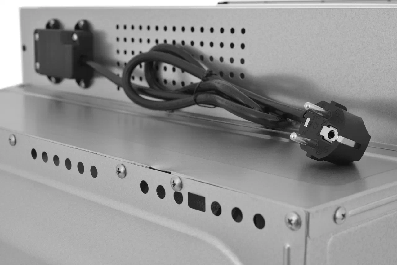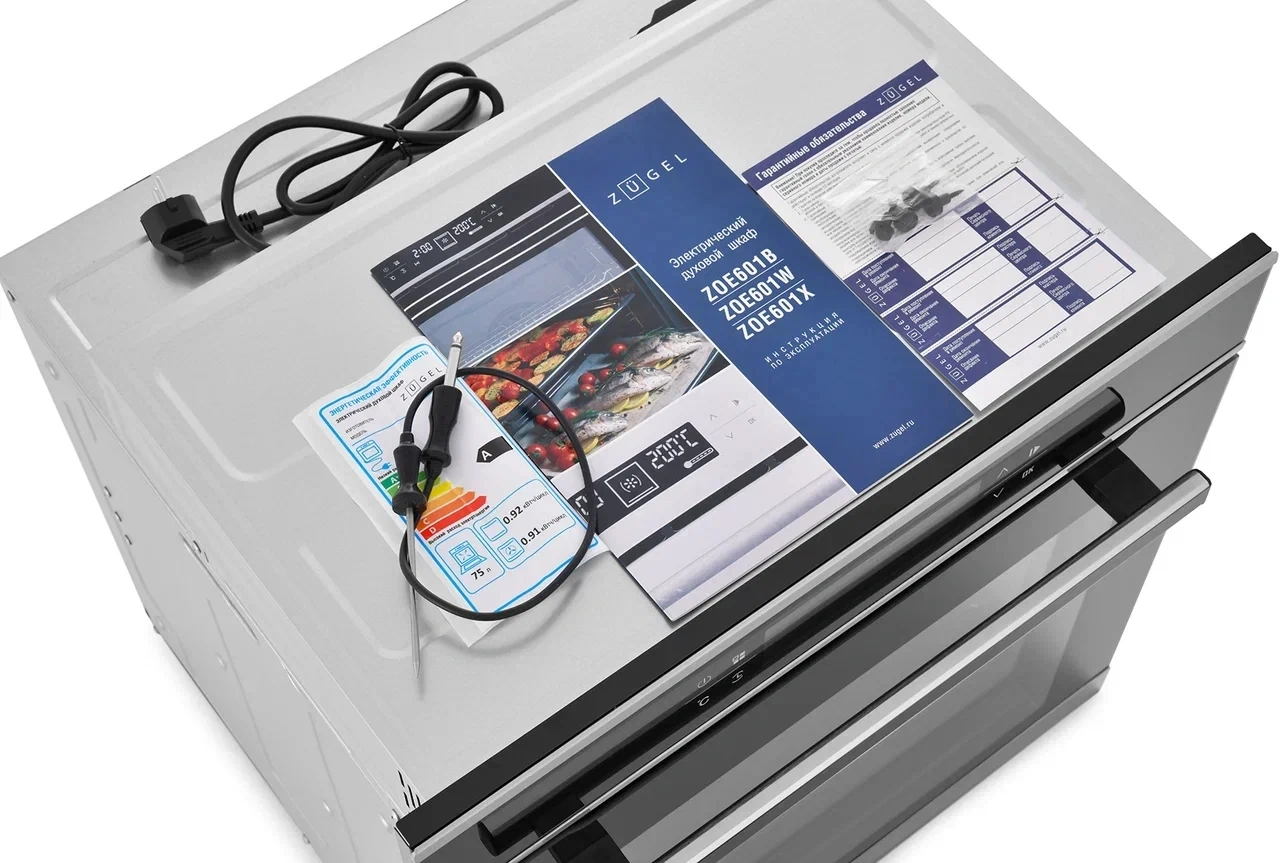 вентилятор охлаждения, дисплей, полностью стеклянная внутренняя поверхность дверцы духовки, телескопические направляющие, электронный программатор