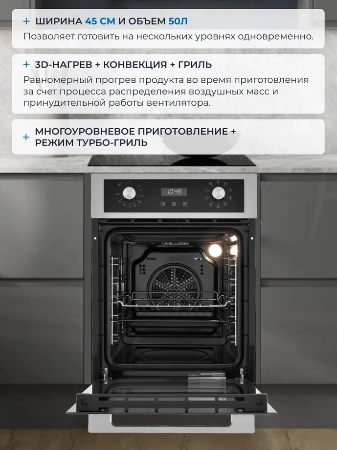 LED-дисплей, 3D-нагрев, многоуровневое приготовление, температура приготовления 50-250°С, время приготовления 1-10 часов, таймер отключения 24 часа, часы, будильник, конвекционный нагрев, тангенциальное охлаждение