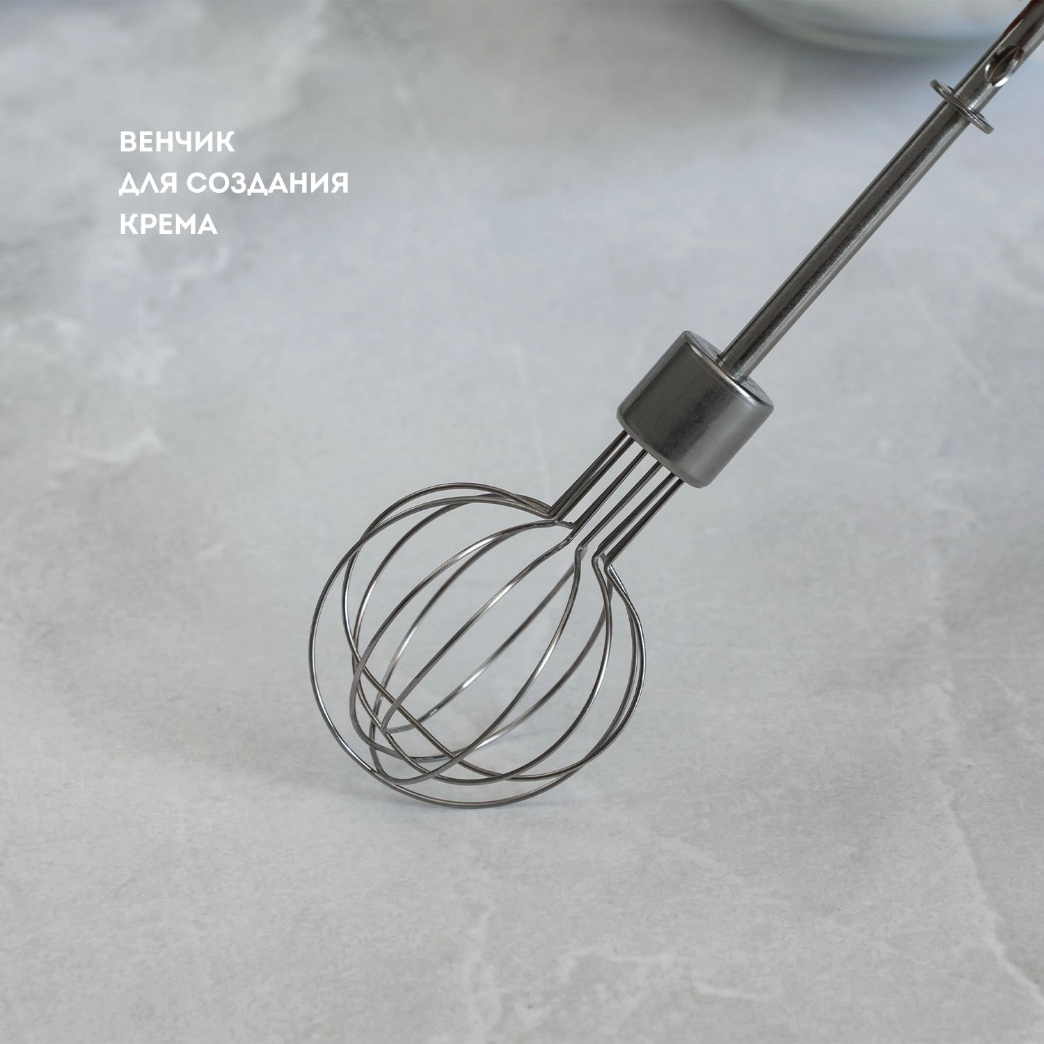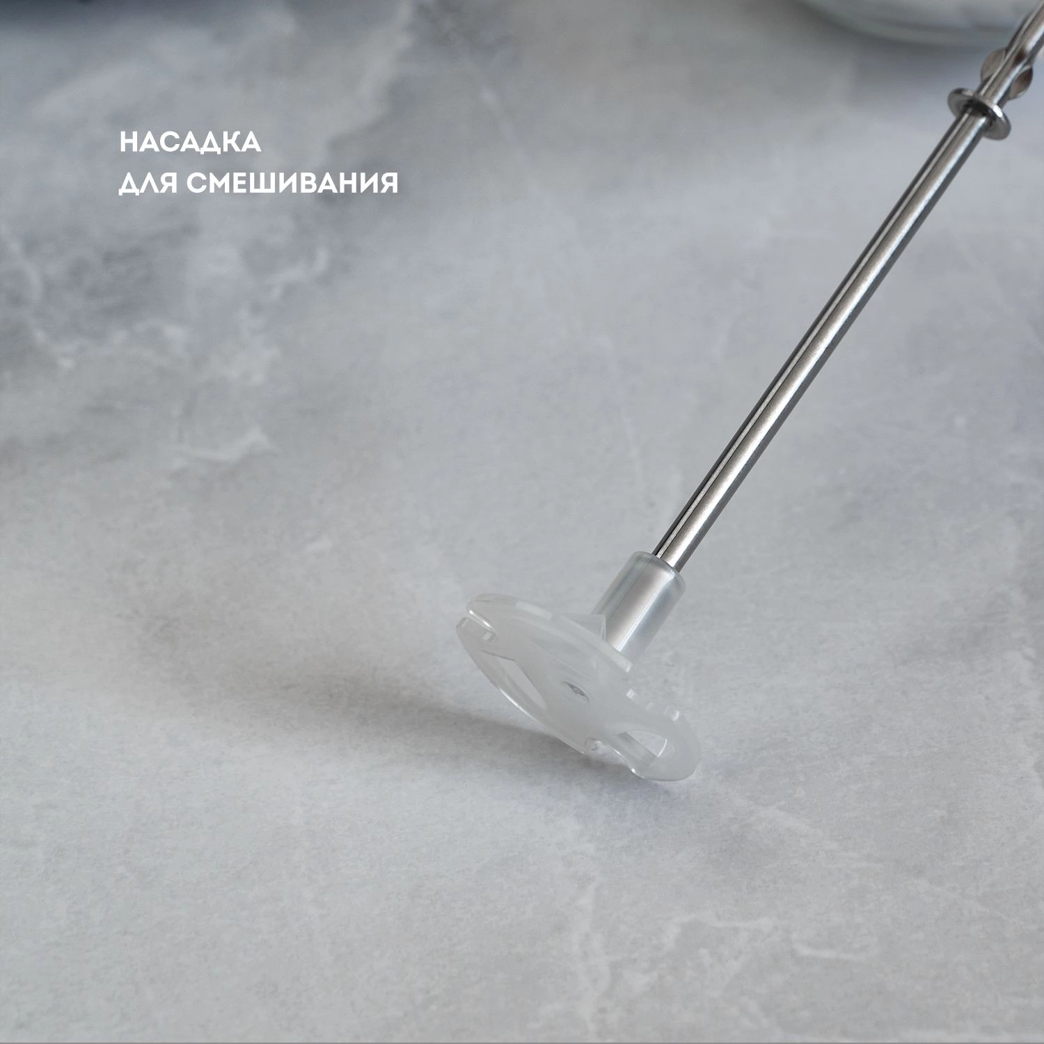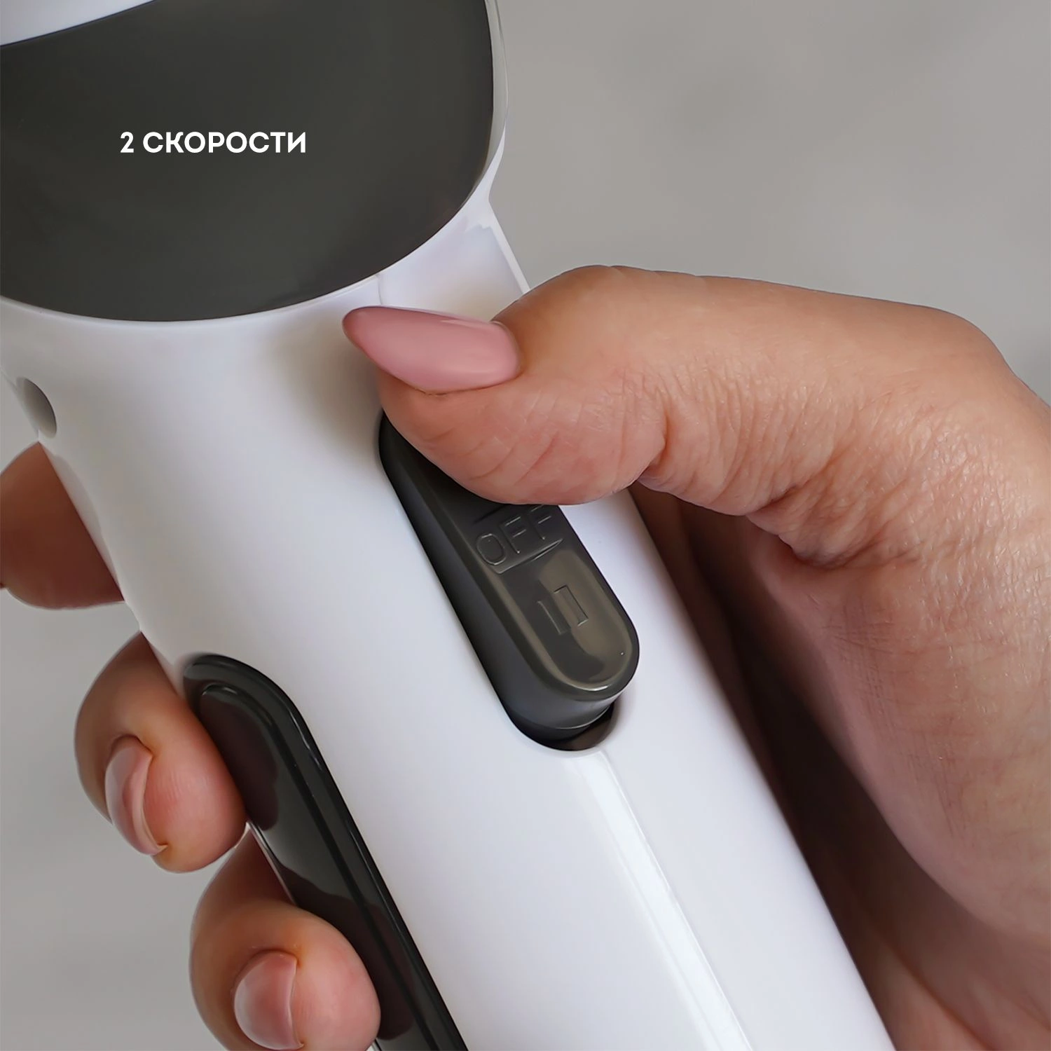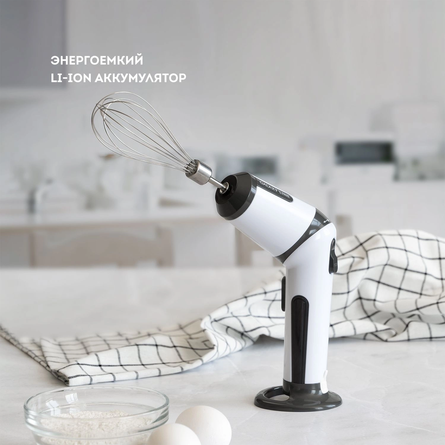 Энергоемкий Li-ion аккумулятор 2200 мА*ч. Время работы после полной зарядки 45-90 минут. Время зарядки до 4 часов. Индикатор зарядки аккумулятора. 3 положения корпуса. USB-кабель длиной 80 см. Насадка для смешивания. Насадка для взбивания крема. Книга рецептов в комплекте.
