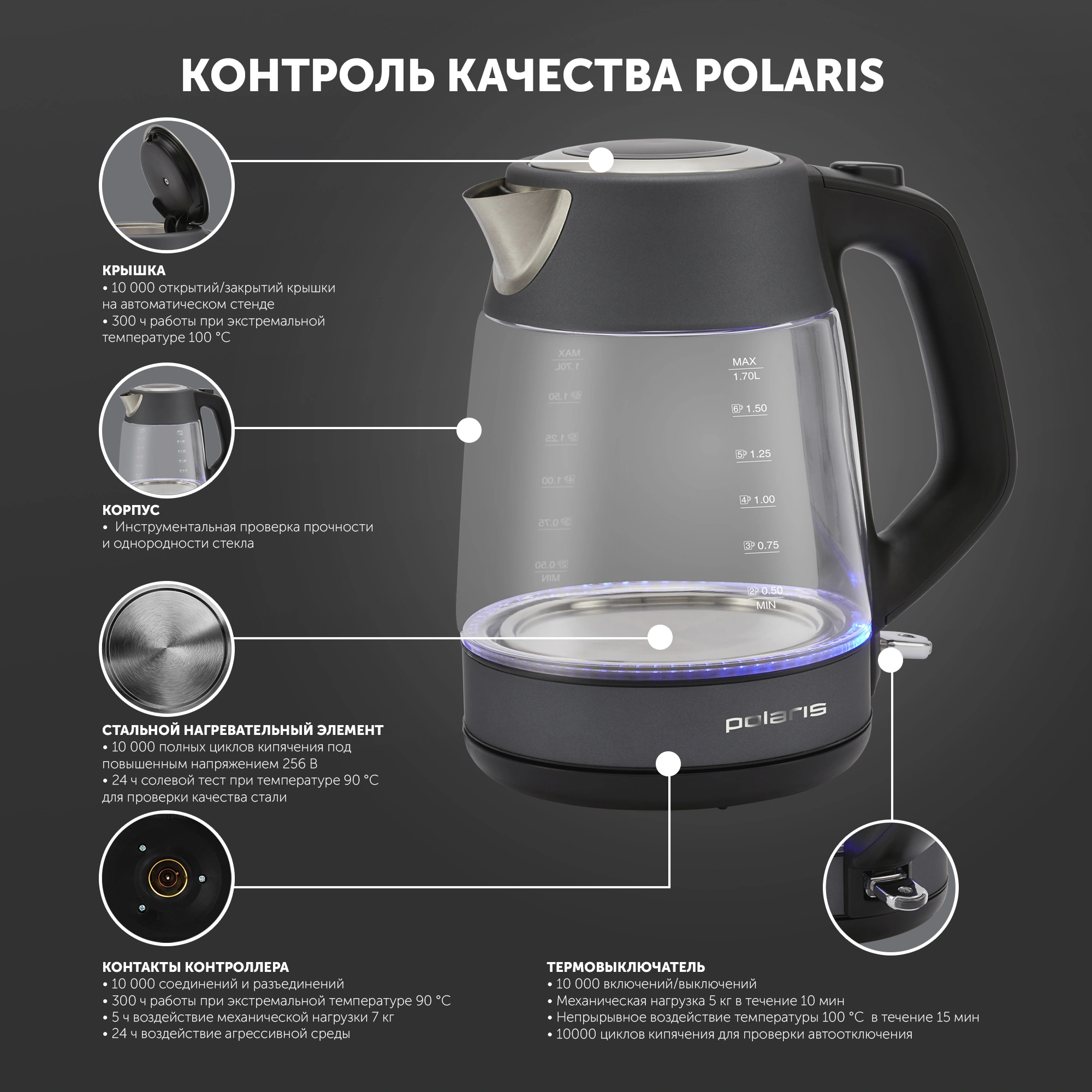 Корпус электрического чайника PWK 1760CGL выполнен из нержавеющей стали и прочного термостойкого стекла. Мощность 2150 Вт позволяет стеклянному чайнику быстро выкипятить воду. Английский контроллер* Strix, отвечающий за отключение чайника, обеспечивает 15 000 циклов кипячения.