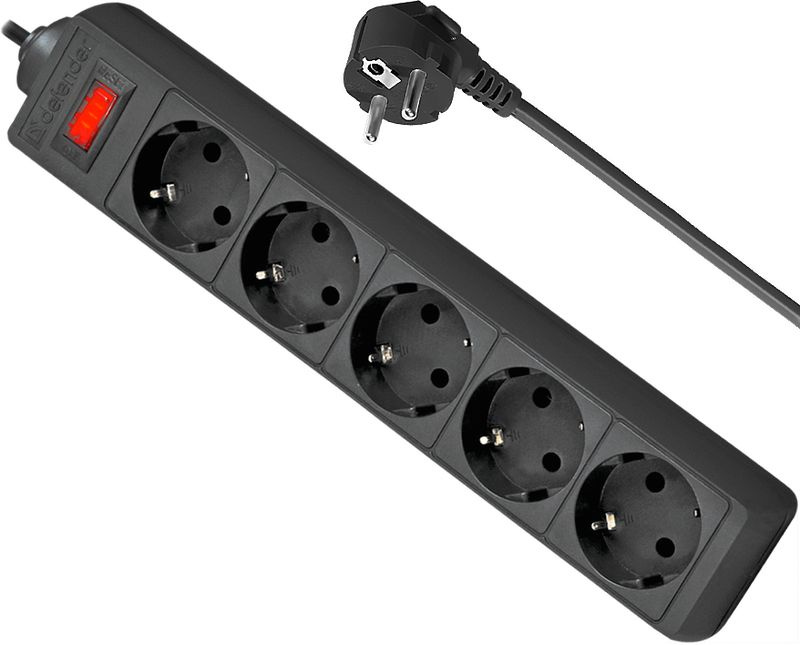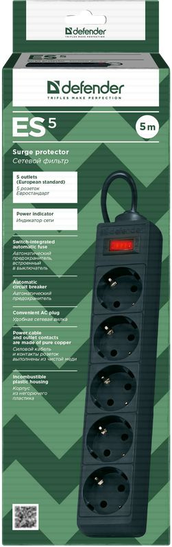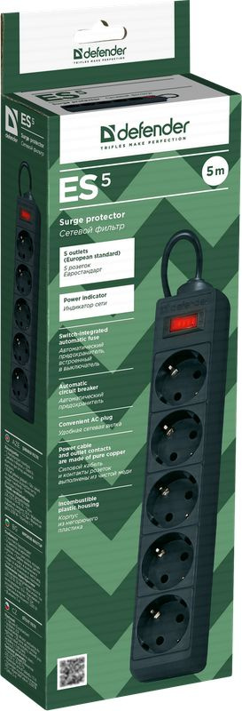 Автоматический предохранитель, встроенный в выключатель. Индикатор сети. 5 розеток с заземлением. Защита от перегрузки и короткого замыкания. Защита от импульсных помех. Корпус из негорючего пластика. Крепление на стену.