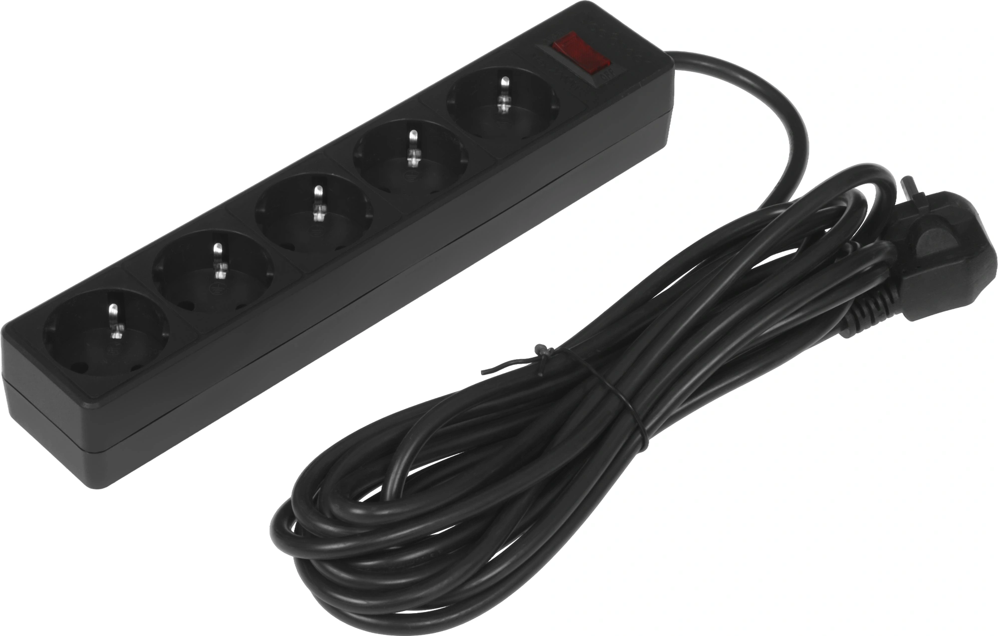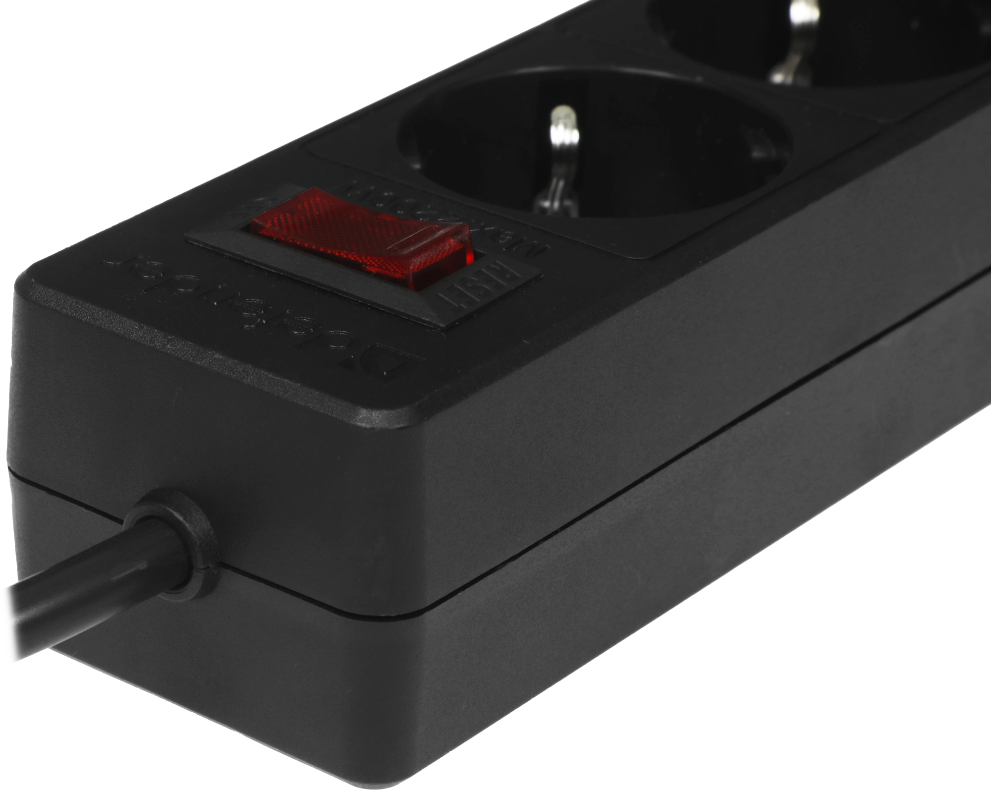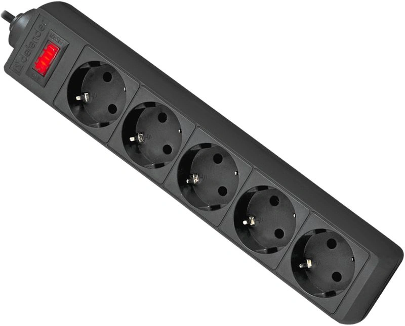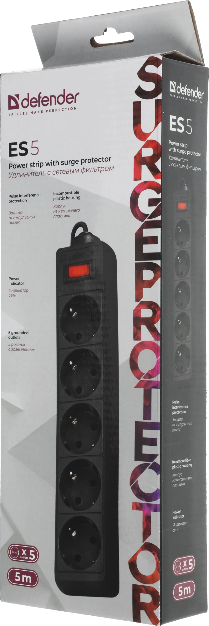 Автоматический предохранитель, встроенный в выключатель. Индикатор сети. 5 розеток с заземлением. Защита от перегрузки и короткого замыкания. Защита от импульсных помех. Корпус из негорючего пластика. Крепление на стену.