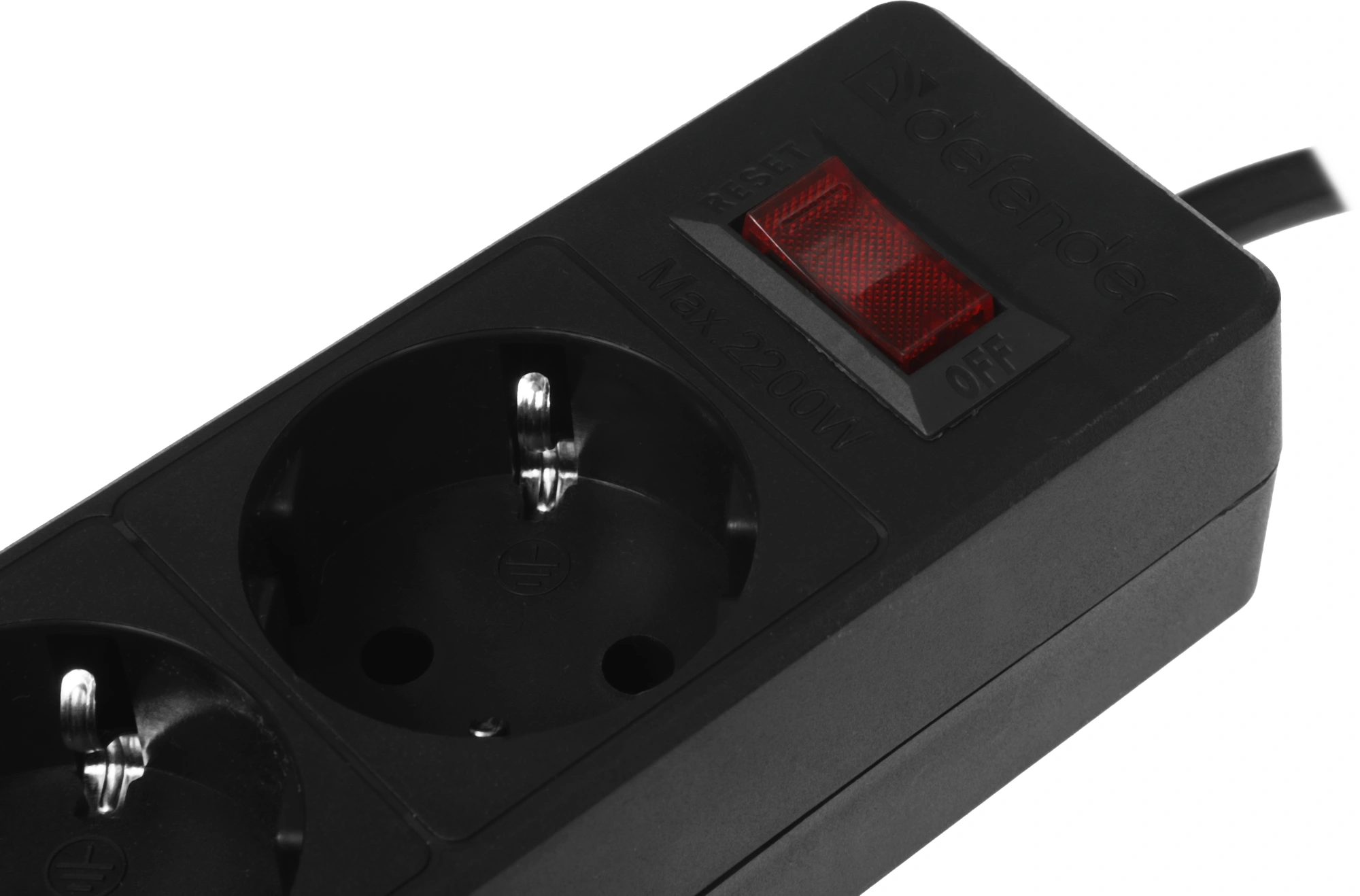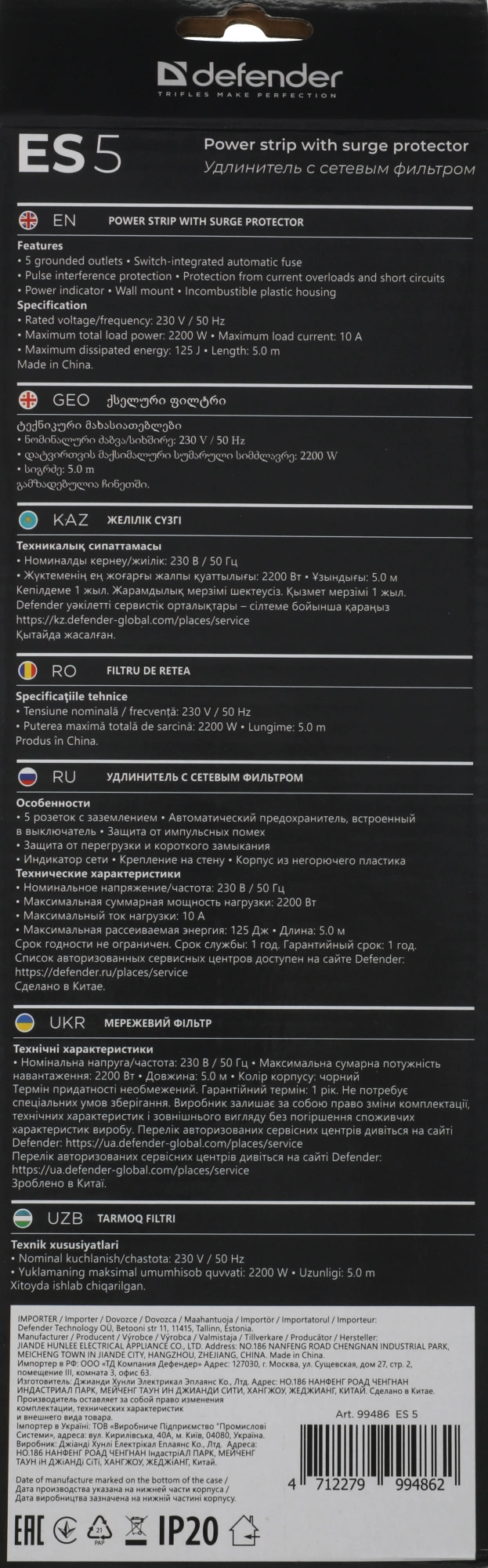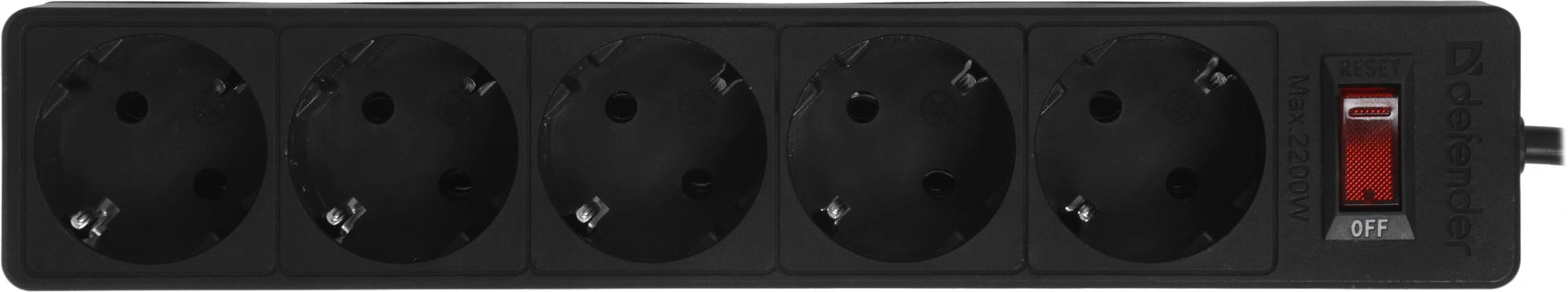 Автоматический предохранитель, встроенный в выключатель. Индикатор сети. 5 розеток с заземлением. Защита от перегрузки и короткого замыкания. Защита от импульсных помех. Корпус из негорючего пластика. Крепление на стену.
