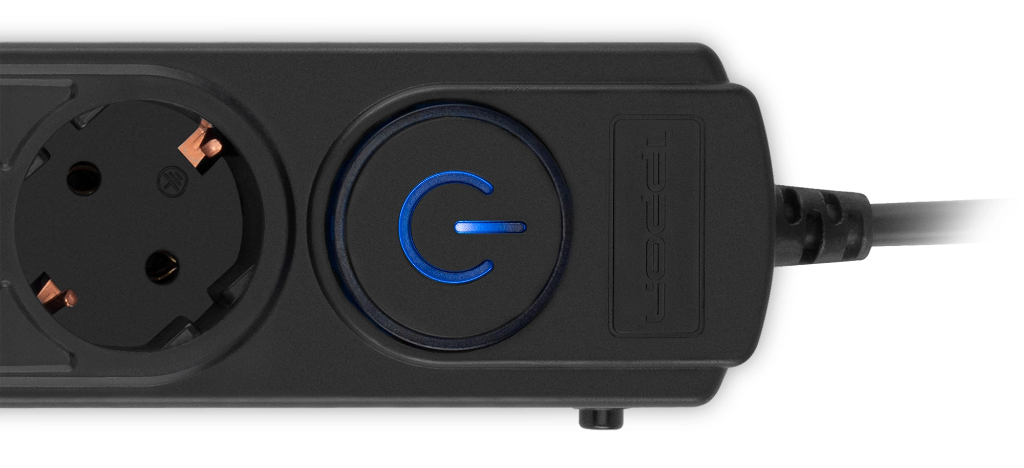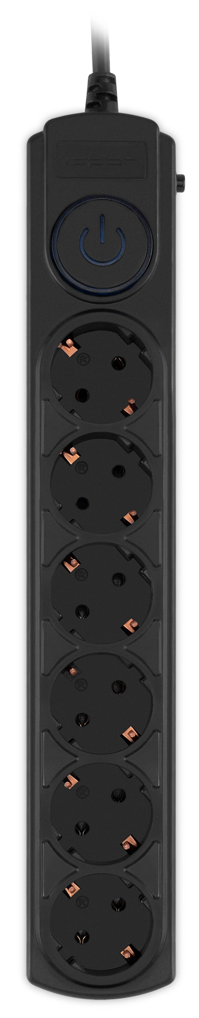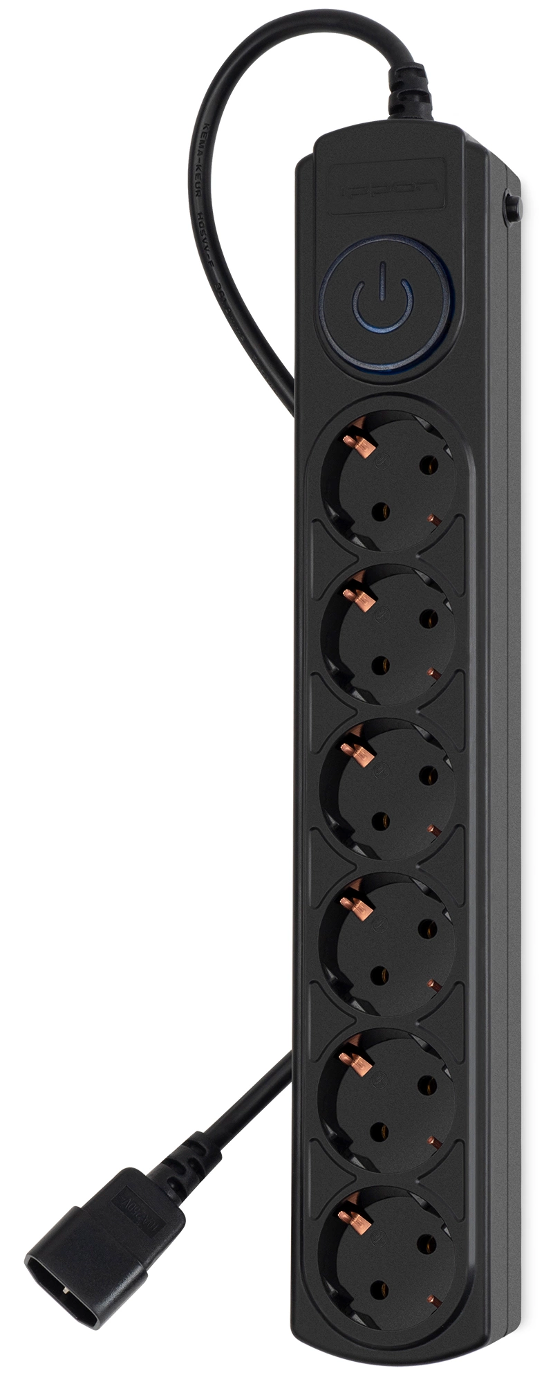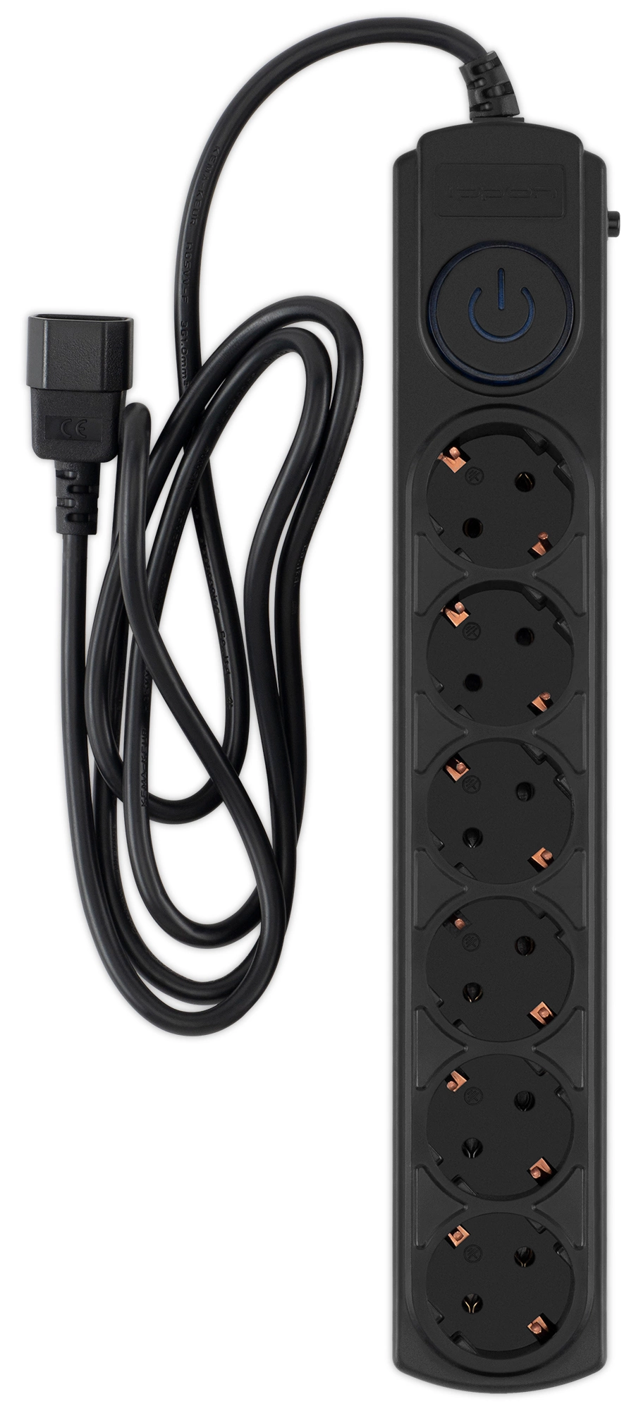6 евророзеток с заземлением. Входная вилка IEC 320 (для подключения к ИБП). Защита от перегрузки. Защита от импульсов высокого напряжения. Защита от перетирания провода в месте входа в корпус фильтра. Ударопрочный негорючий корпус. Кнопка питания с индикатором сети.