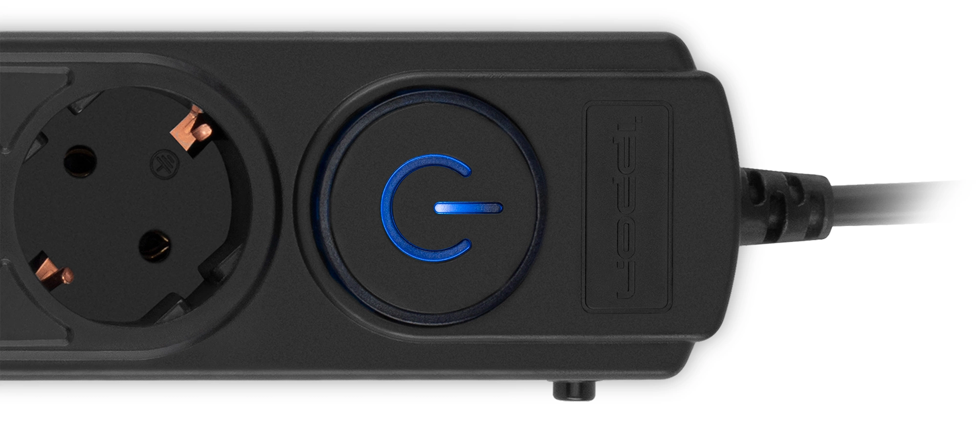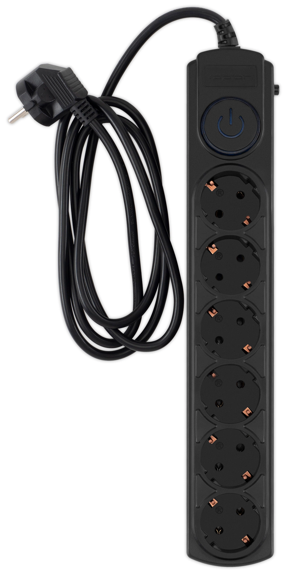 6 евророзеток с заземлением. Входная вилка Schuko. Защита от перегрузки. Защита от импульсов высокого напряжения. Защита от перетирания провода в месте входа в корпус фильтра. Ударопрочный негорючий корпус. Кнопка питания с индикатором сети. Отверстия на корпусе сзади для удобного монтажа на стену.