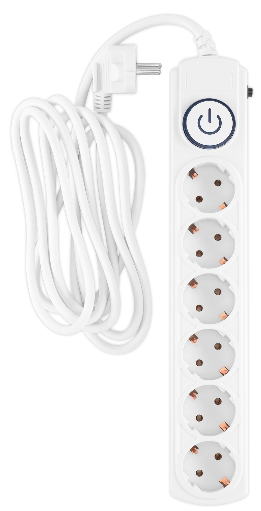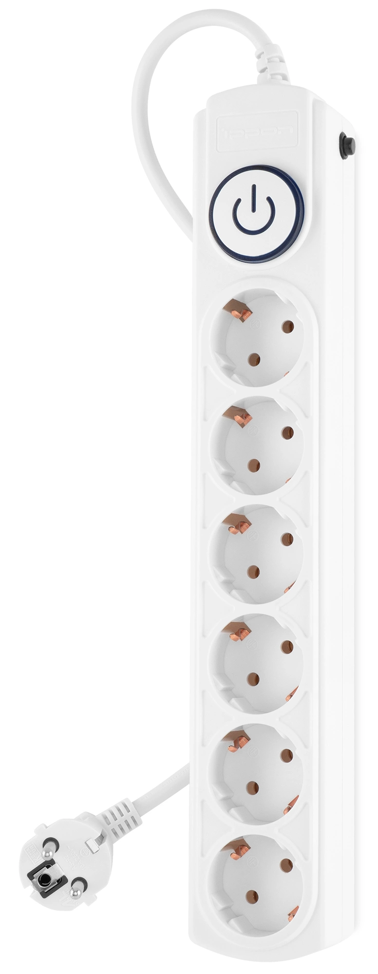 6 евророзеток с заземлением. Входная вилка Schuko. Защита от перегрузки. Защита от импульсов высокого напряжения. Защита от перетирания провода в месте входа в корпус фильтра. Ударопрочный негорючий корпус. Кнопка питания с индикатором сети.