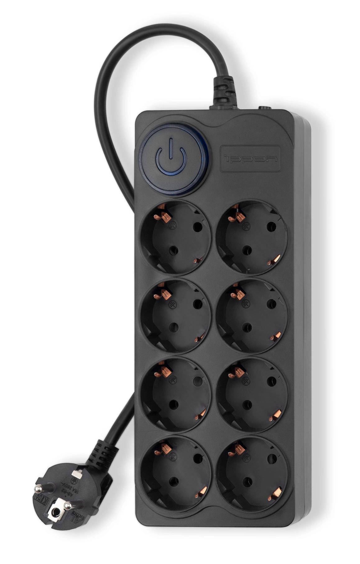8 евророзеток с заземлением. Входная вилка Schuko. Защита от перегрузки. Защита от импульсов высокого напряжения. Защита от перетирания провода в месте входа в корпус фильтра. Ударопрочный негорючий корпус. Кнопка питания с индикатором сети.