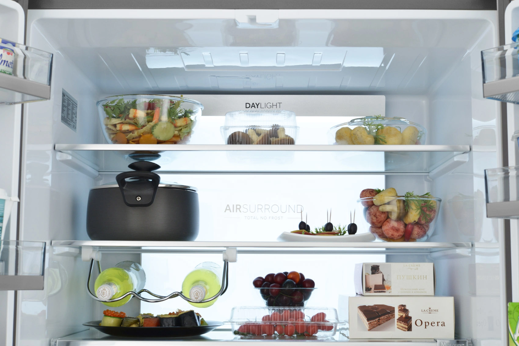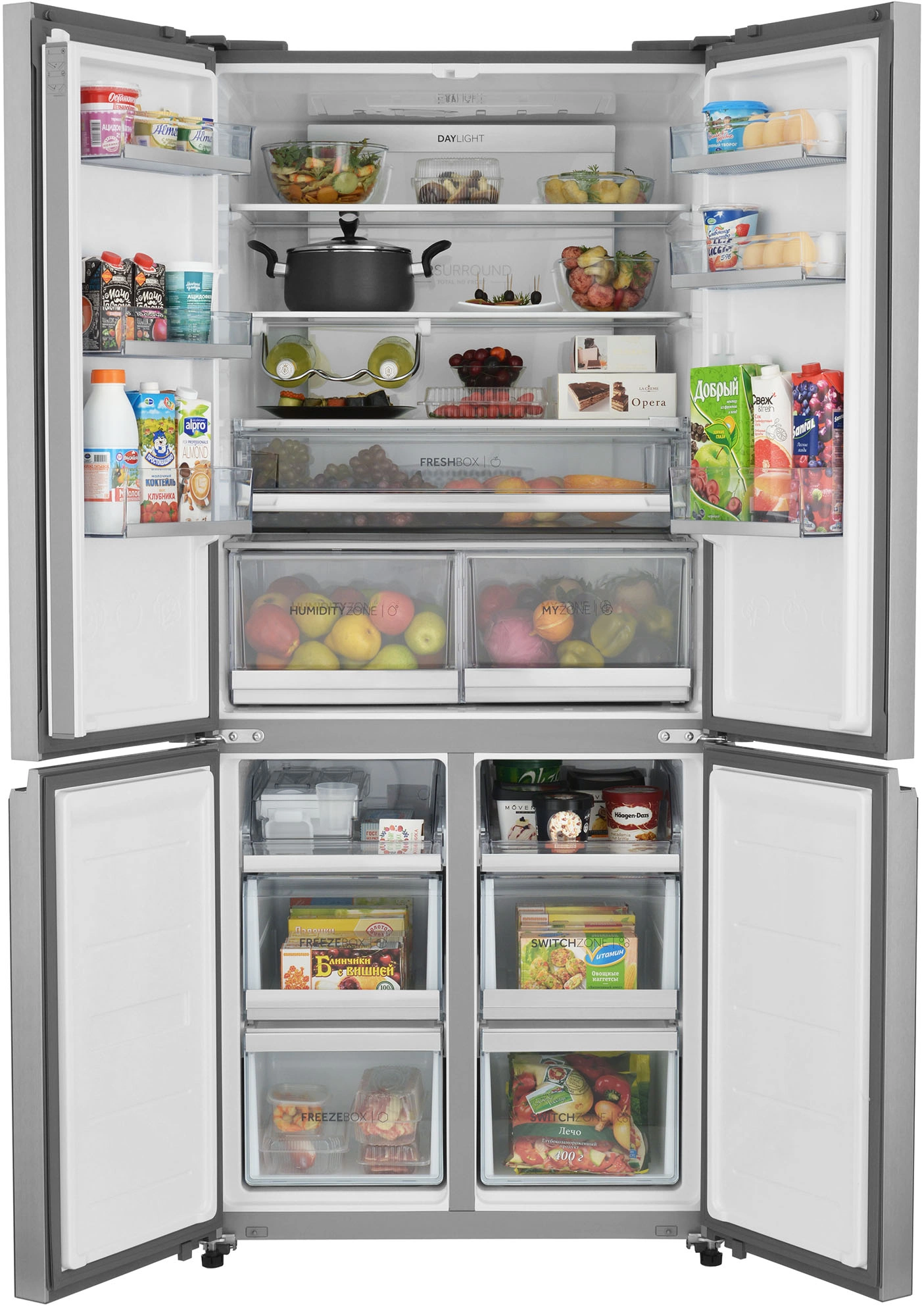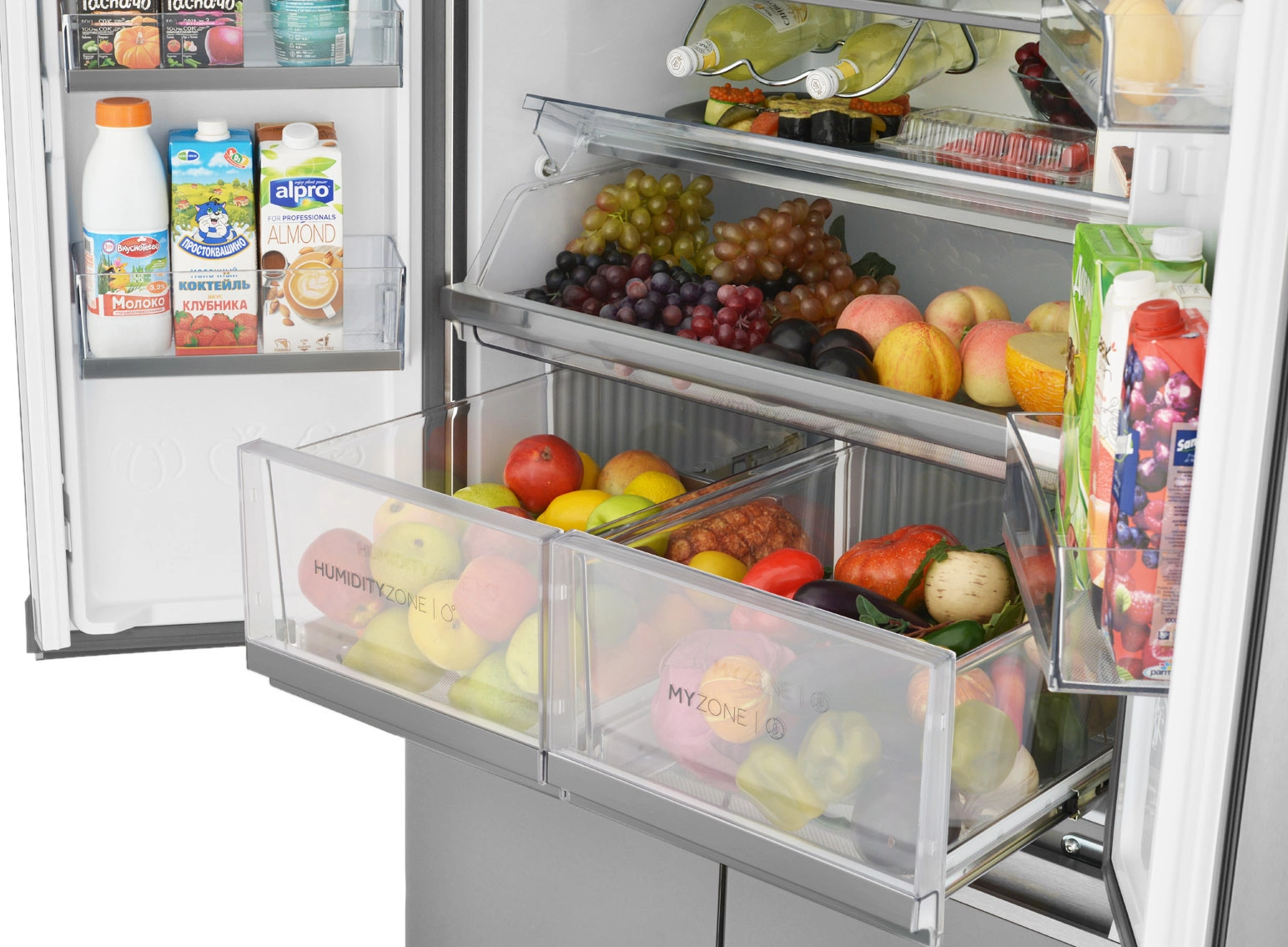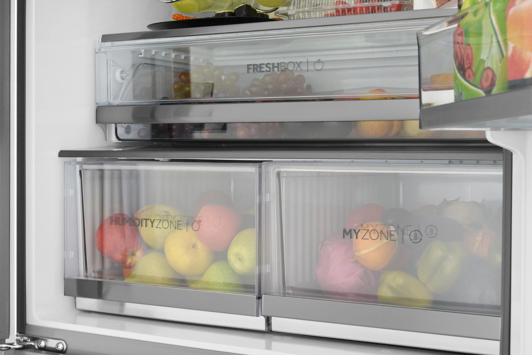 Оптимальные условия для разных продуктов в контейнерах с автоматической регулировкой влажности — Dry Zone и Humidity. Мясо или рыба, овощи или фрукты — всё будет бережно сохранено.