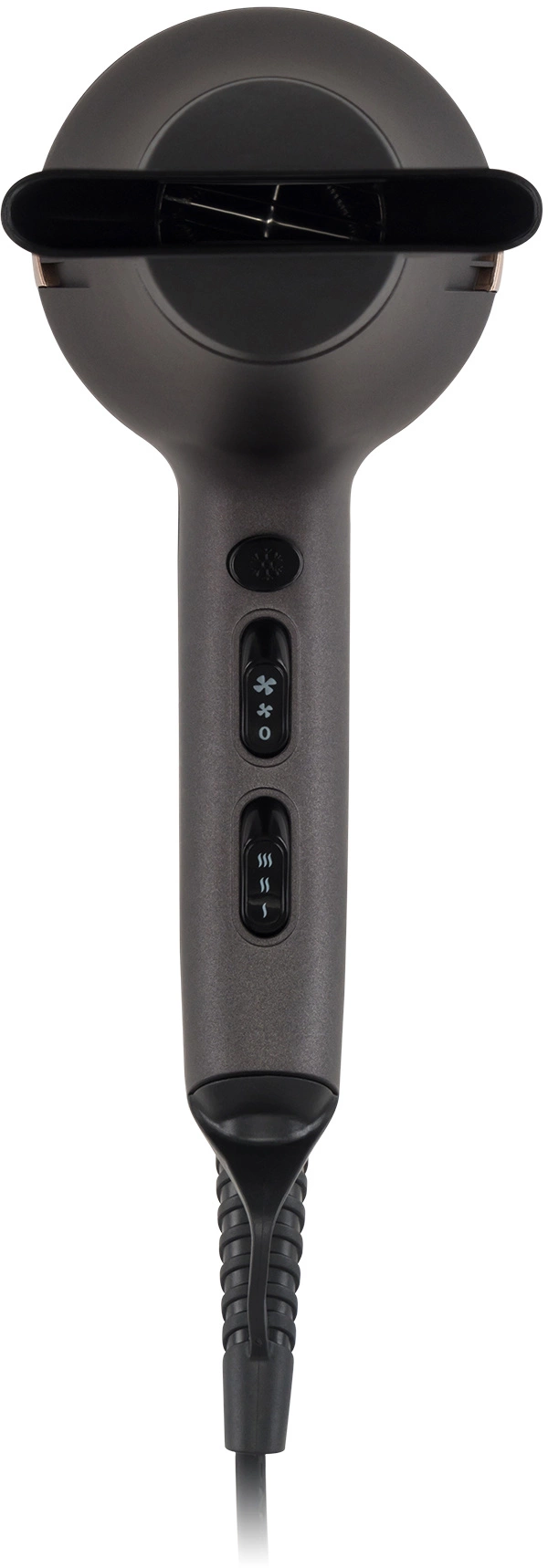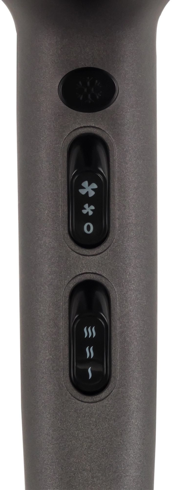 Максимальная мощность устройства составляет 2200 Ватт. Однако она разделена по двум показателям – скорости и уровню нагрева. Дело в том, что каждому типу волос требуется особый уход с учётом индивидуальных особенностей. Благодаря гибкой настройке из двух скоростных режимов и трёх температурных данная модель подойдёт для ухода за любой причёской. Для переключения режимов предусмотрено два регулятора и кнопка. Двухпозиционный ползунок отвечает за скорость подачи воздуха, трёхпозиционный – за температуру. Кнопка наверху по нажатию отключает нагрев и позволяет фену обдувать волосы воздухом комнатной температуры.