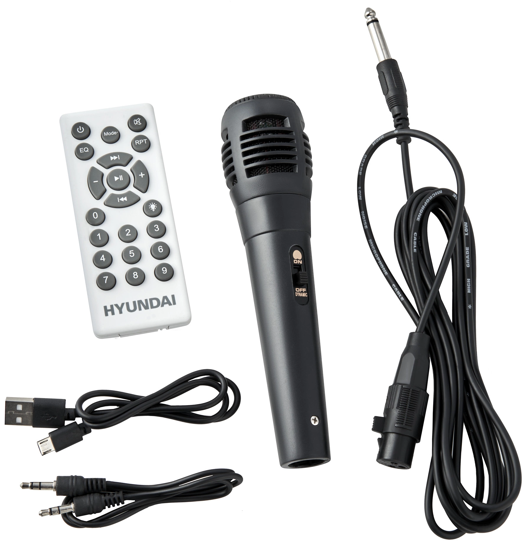 Прибор поддерживает как проводные, таки беспроводные методы подключения. В нём предусмотрен слот под карту micro SD, USB-разъём для флешек, классический AUX и микрофонный вход. Последний обязательно оценят ведущие мероприятий и шоу-программ, а также любители вечеров караоке. В комплекте с Hyundai H-MC1220 поставляется микрофон и многофункциональный пульт дистанционного управления.