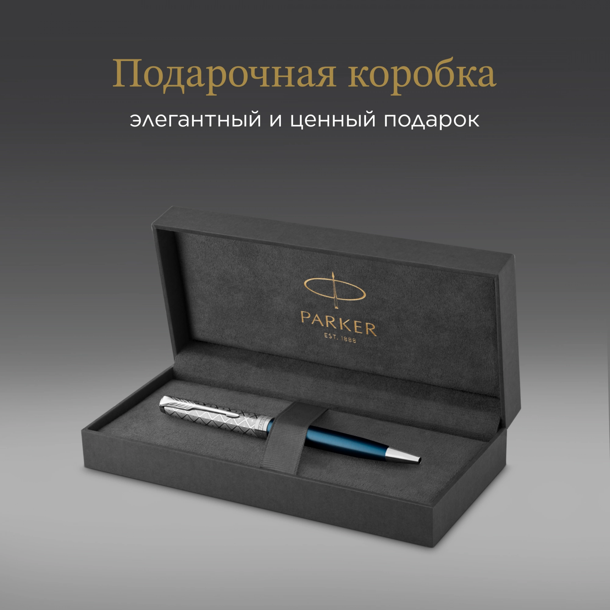Корпус ручки покрыт синим матовым лаком, а детали отделки – никеле-палладиевым покрытием; серебристый колпачок с гравировкой подчеркнут замысловатым ромбовидным узором, который придает еще больше изысканности этому пишущему инструменту. Наслаждайтесь более гладким, чистым и аккуратным письмом с шариковой ручкой PARKER Sonnet. Не подвластная времени, элегантная шариковая ручка с поворотным механизмом. Она тщательно собрана вручную и проверена на безупречное качество, обеспечивая тем самым высокую точность и исключительное удобство письма. Внешний вид этой ручки отличает ряд дизайнерских находок, а совершенство исполнения даже самых мелких деталей создает ощущение легкости и изысканности во время использования в любой ситуации. Символ мастерства PARKER, ручка, придающая изысканный стиль любому случаю письма, поставляется в подарочной упаковке премиум-класса PARKER, в комплекте со сменным стержнем Parker Quinkflow® для шариковых ручек (вставлен в ручку), со средним размером пишущего узла и черными чернилами, который обеспечивает неизменно гладкое, чистое и аккуратное письмо. Так же совместима с гелевыми стержнями Parker.