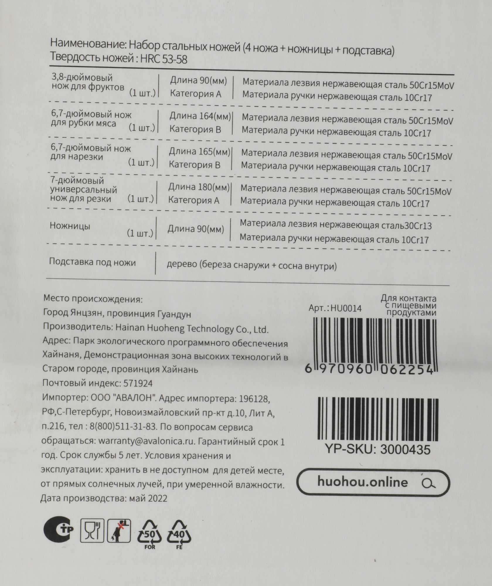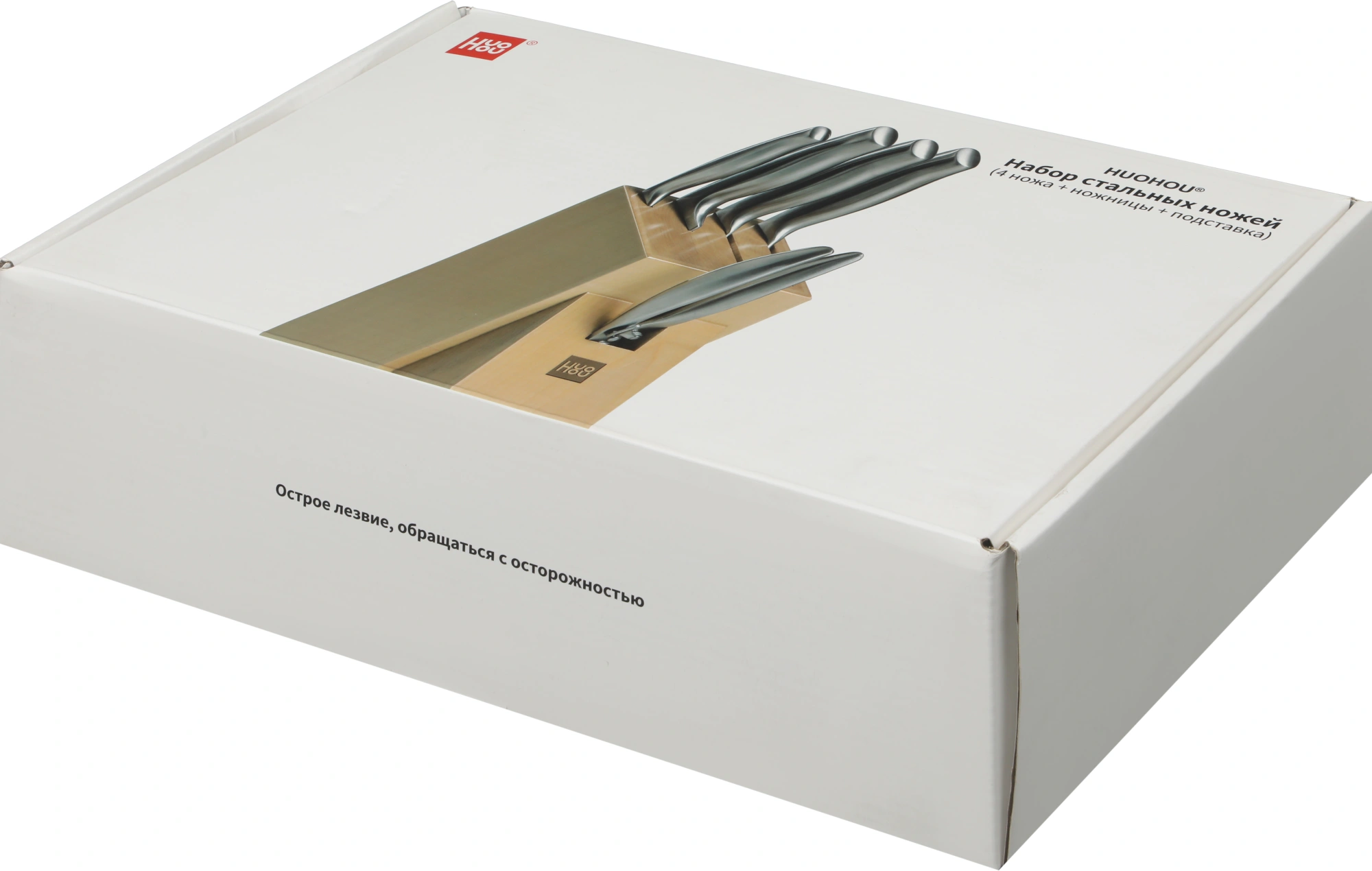Материал лезвий ножей: немецкая молибден-ванадиевая нержавеющая сталь Krupp 1.4116. Материал рукоятей ножей и ножниц: нержавеющая сталь 10Cr17. Материал лезвий ножниц: нержавеющая сталь 30Cr13. Материал подставки: дерево (береза снаружи, сосна внутри).