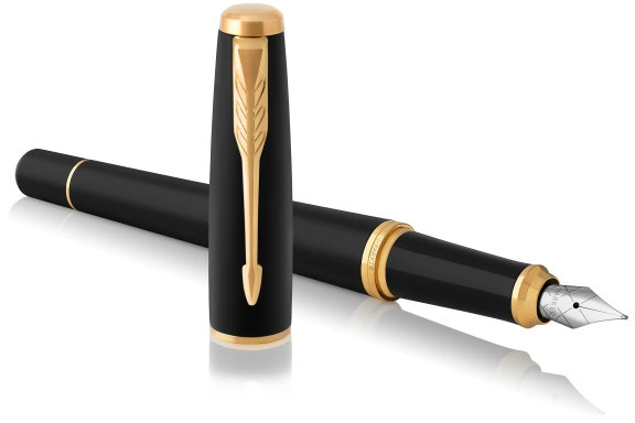 Перьевая и шариковая ручки элегантной модели Muted Black Lacquer GT. Корпус и колпачок пишущих инструментов необычной формы покрыты лаком приглушенного черного цвета с эффектом пудры, дополненные золотой отделкой и фирменными зажимами Parker в виде стрелок. Обе ручки выглядят строго и презентабельно.