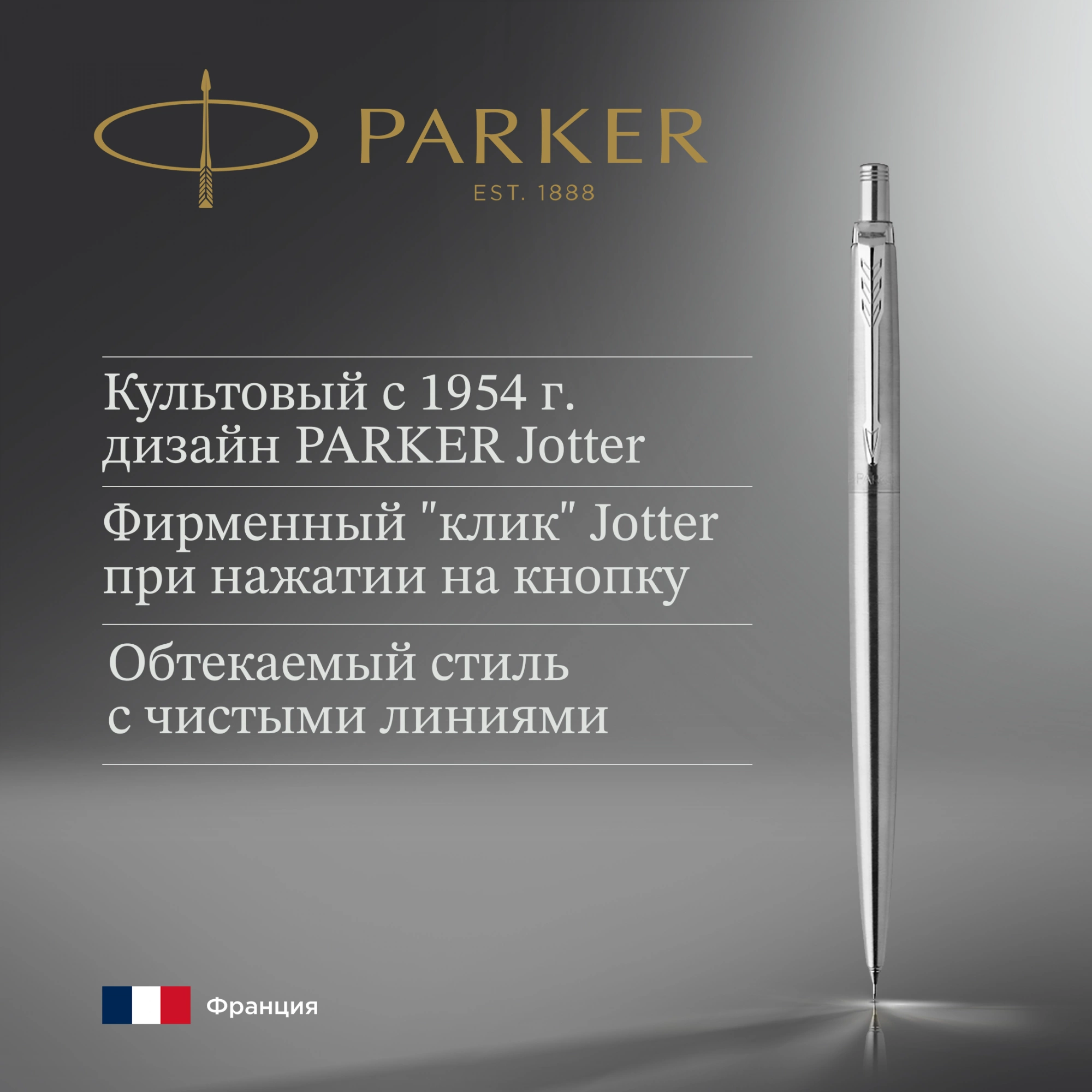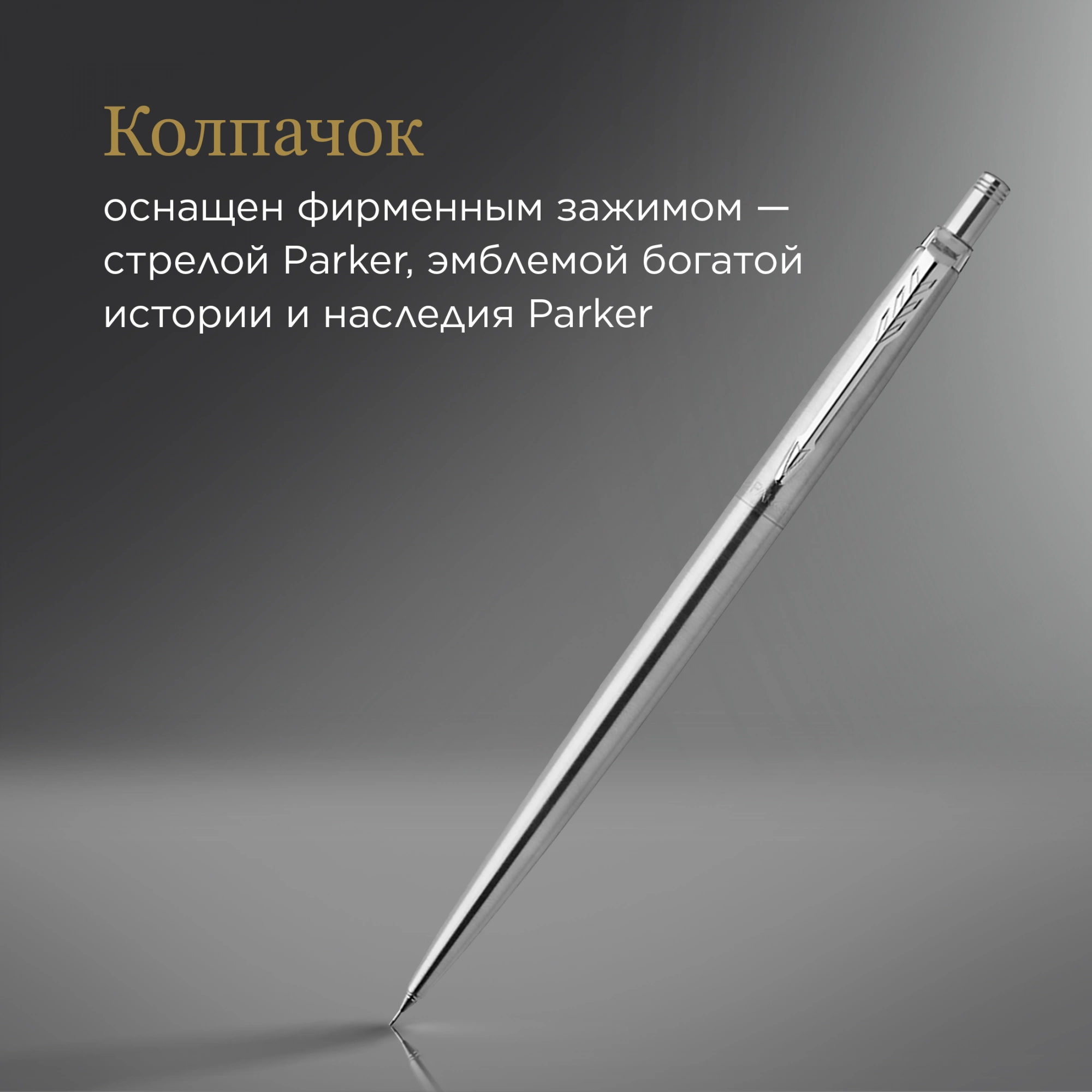 Корпус выполнен из нержавеющей стали с блестящей хромированной отделкой и клипом в виде стрелы, толщина грифеля 0,5 мм, HB, элегантная фирменная подарочная коробка PARKER. Фирменная выдвижная конструкция механизма подачи грифеля, подает больше грифеля одним кликом.