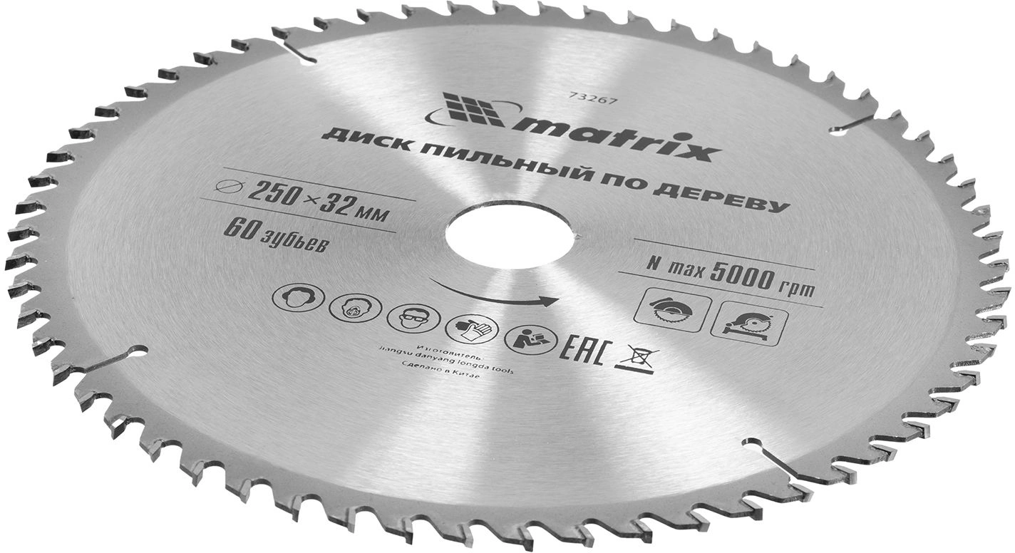 ильный диск по дереву Matrix ф250 х 32 мм. 73267 с 60 зубьями применяется в качестве оснастки на циркулярных и торцовочных пилах с соответствующим внутренним и внешним диаметром.