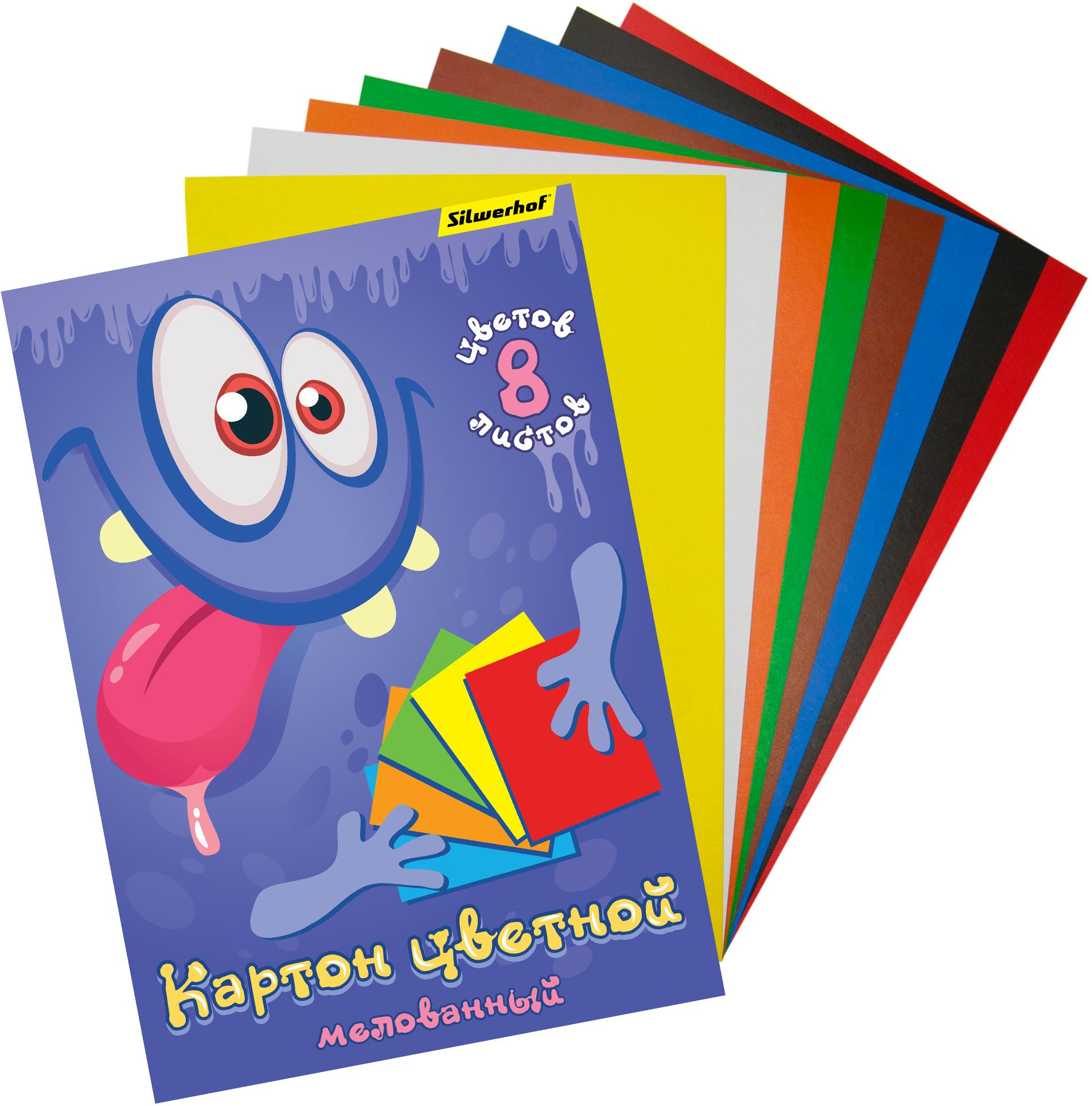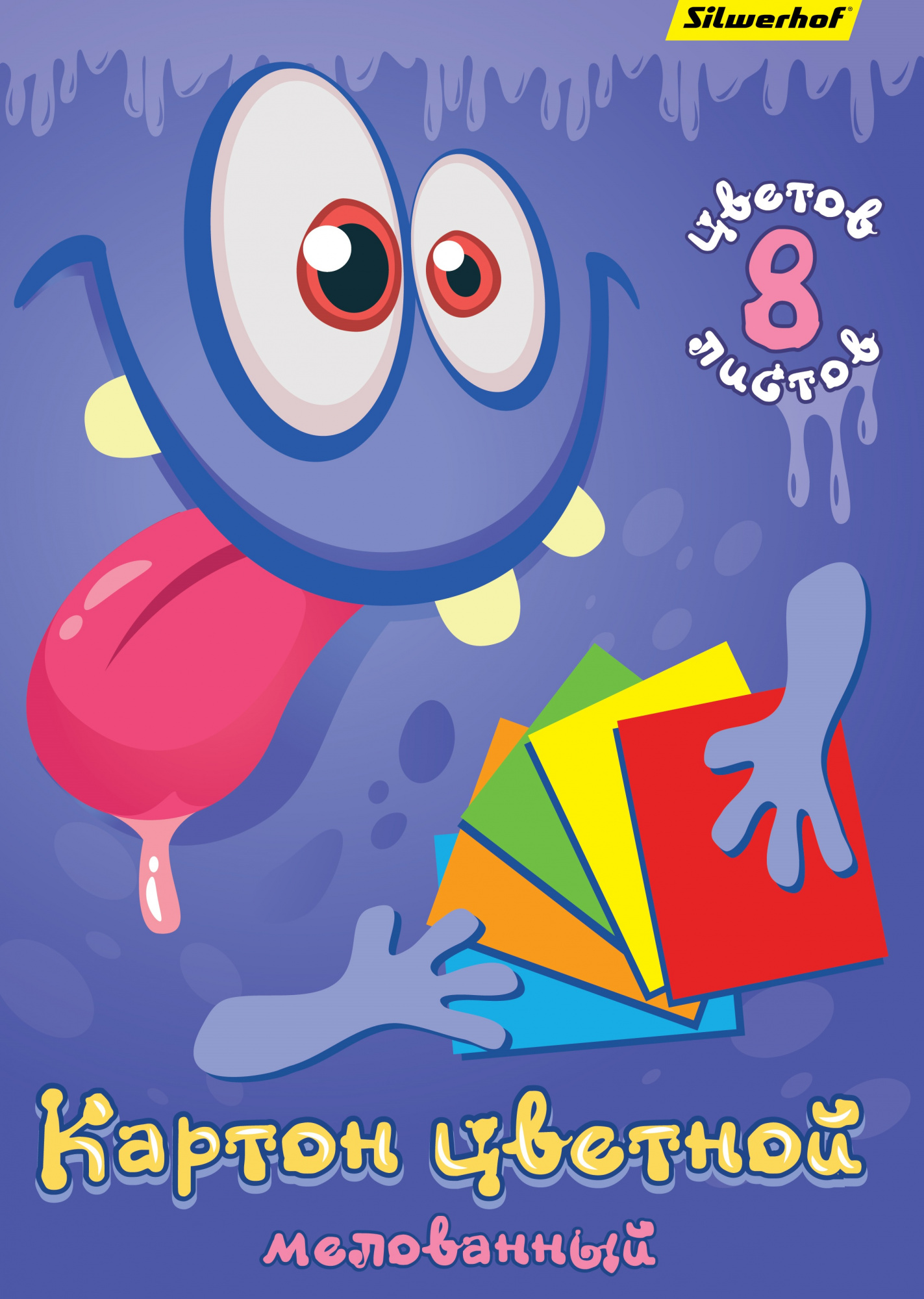 Картон цветной Silwerhof мелов. 8л. 8цв. A4 Монстрики 230г/м2 1диз. обл.мел.картон папка