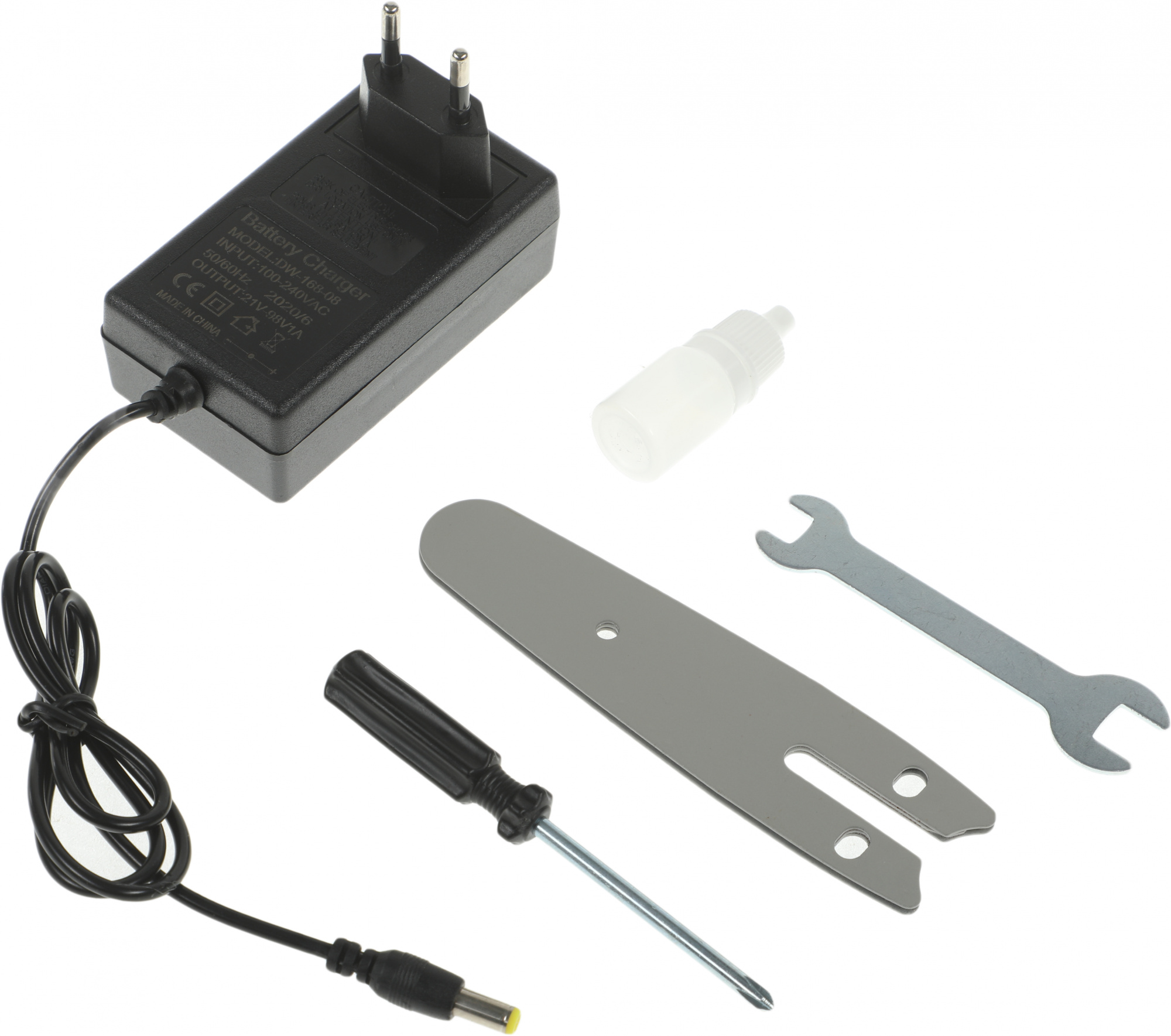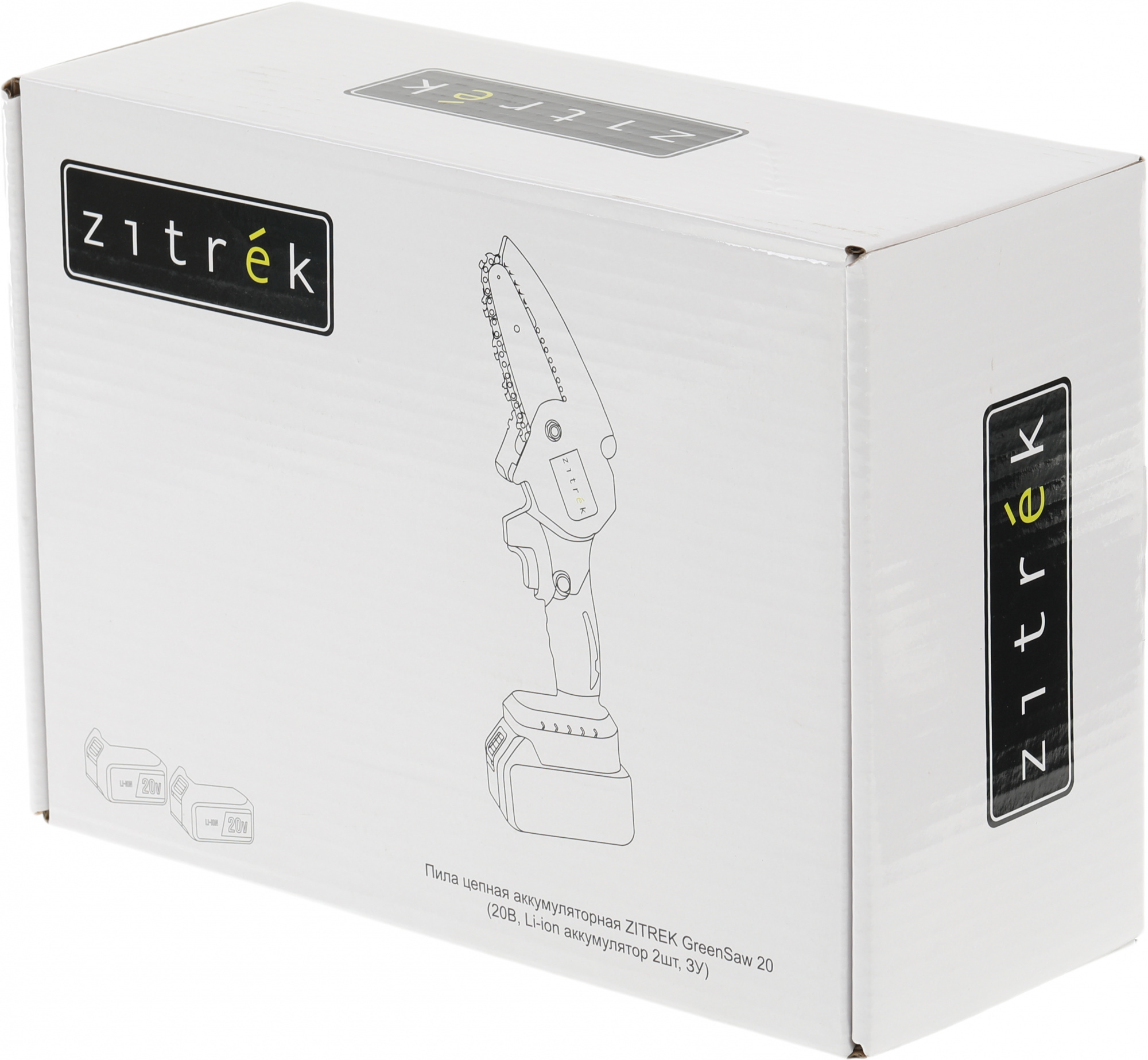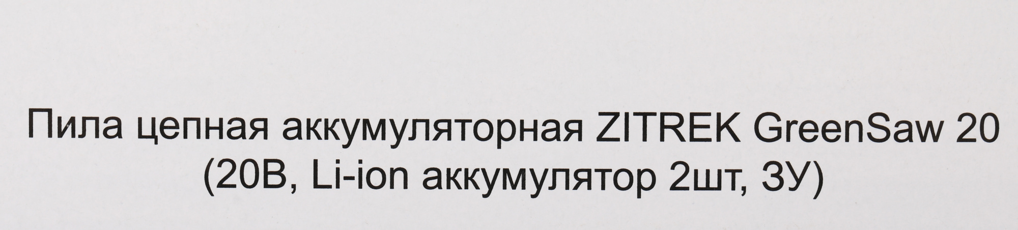 Цепная аккумуляторная пила. Шина. Цепь. Зарядное устройство. Аккумулятор 20 В, 1.5 А*ч - 2 шт. Отвертка. Гаечный ключ. Масленка. Инструкция. Упаковка