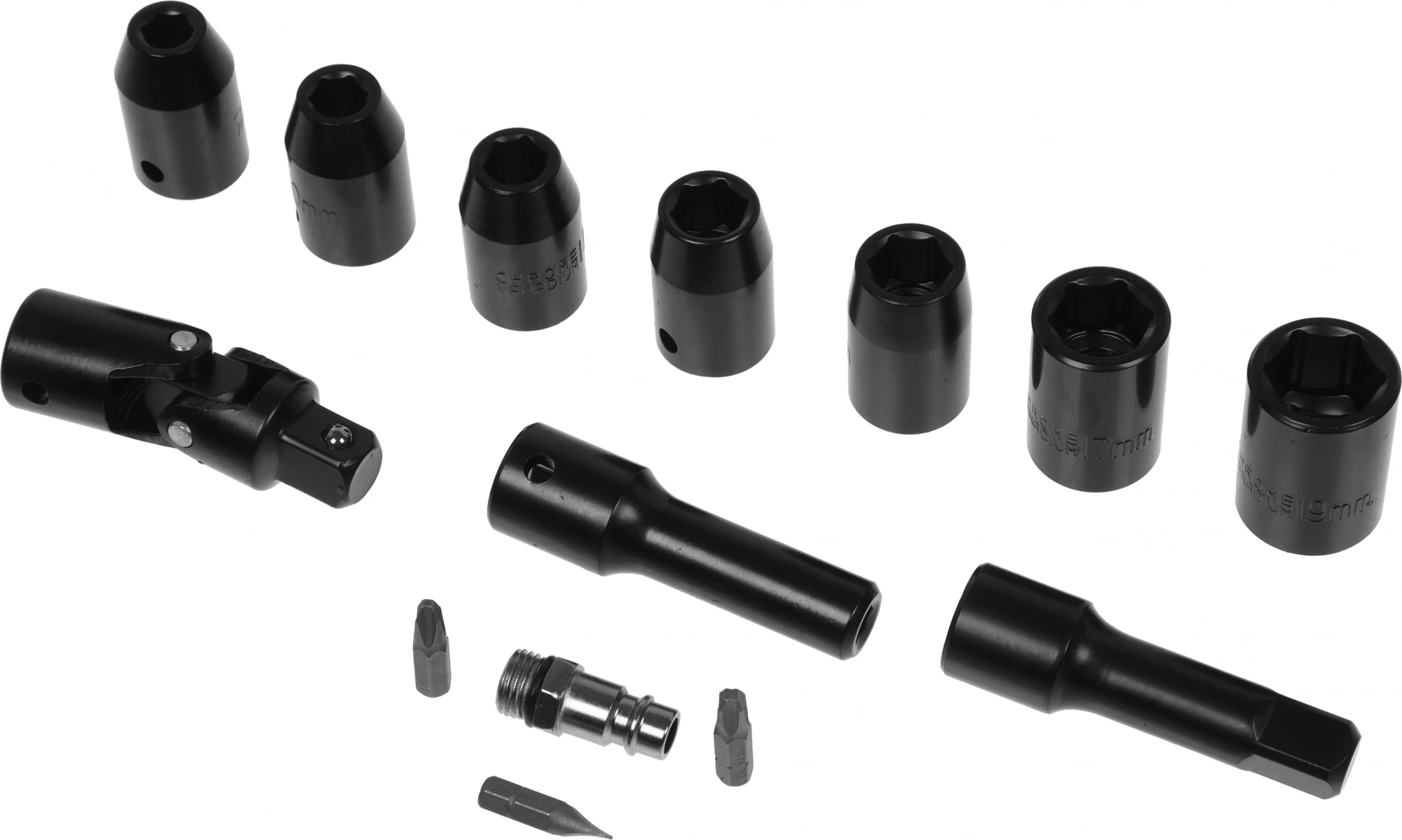 1/2 " ключ с трещоткой, 7 шт. 1/2 " головки 9,10,11,13,14,17,19 мм., 1/2" удлинитель, 1/2" универсальный шарнир, 1/2 " держатель для бит, 2 шт. биты Ph2,3, бита SL5.5, ниппель.