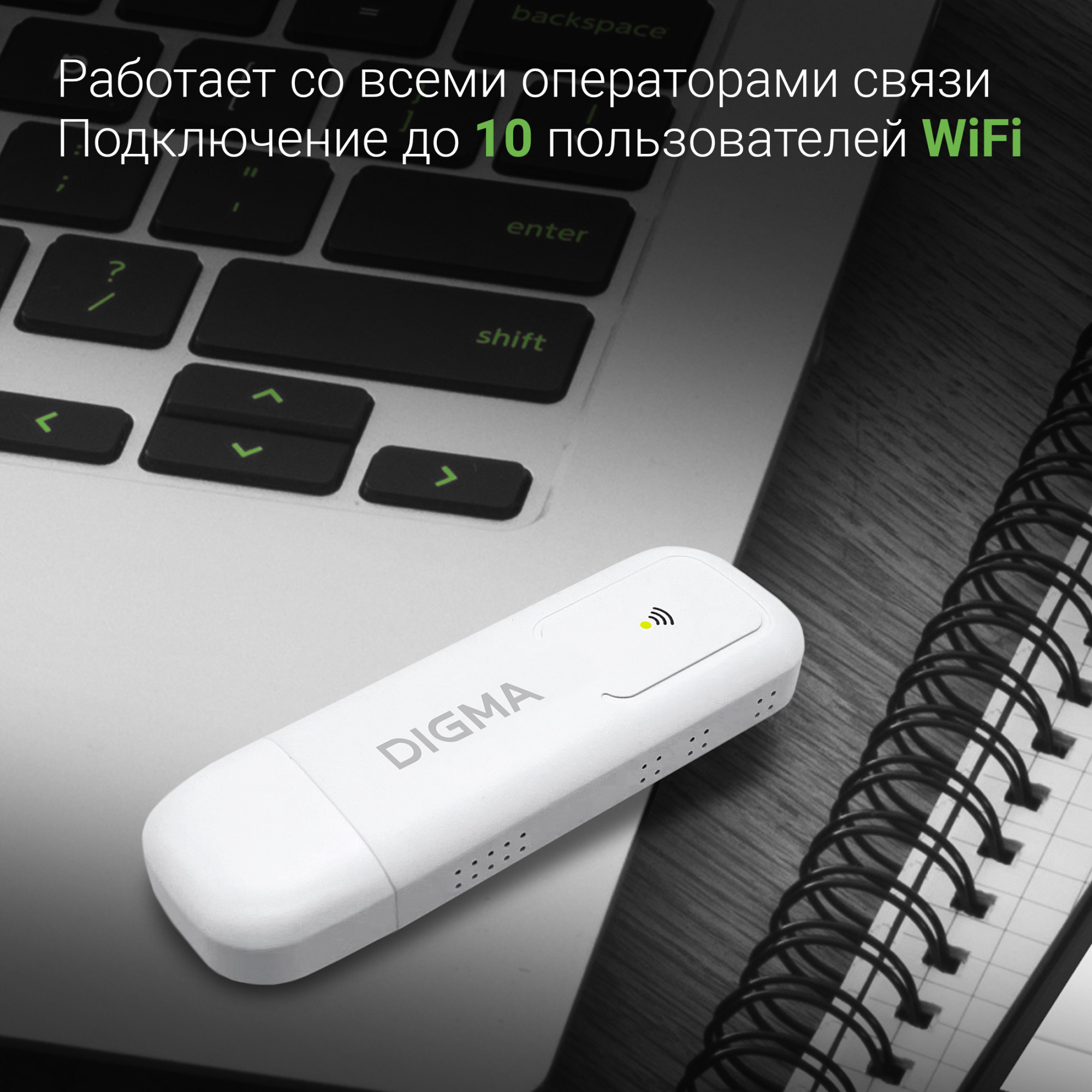 USB модем 3G/4G Digma Dongle DW1960 обеспечит доступ к Интернету везде, где есть мобильная связь и источник питания, в качестве которого могут выступать сетевой адаптер, пауэрбанк или устройство с USB портом. К встроенному роутеру по Wi-Fi могут подключиться одновременно до 10 гаджетов.
