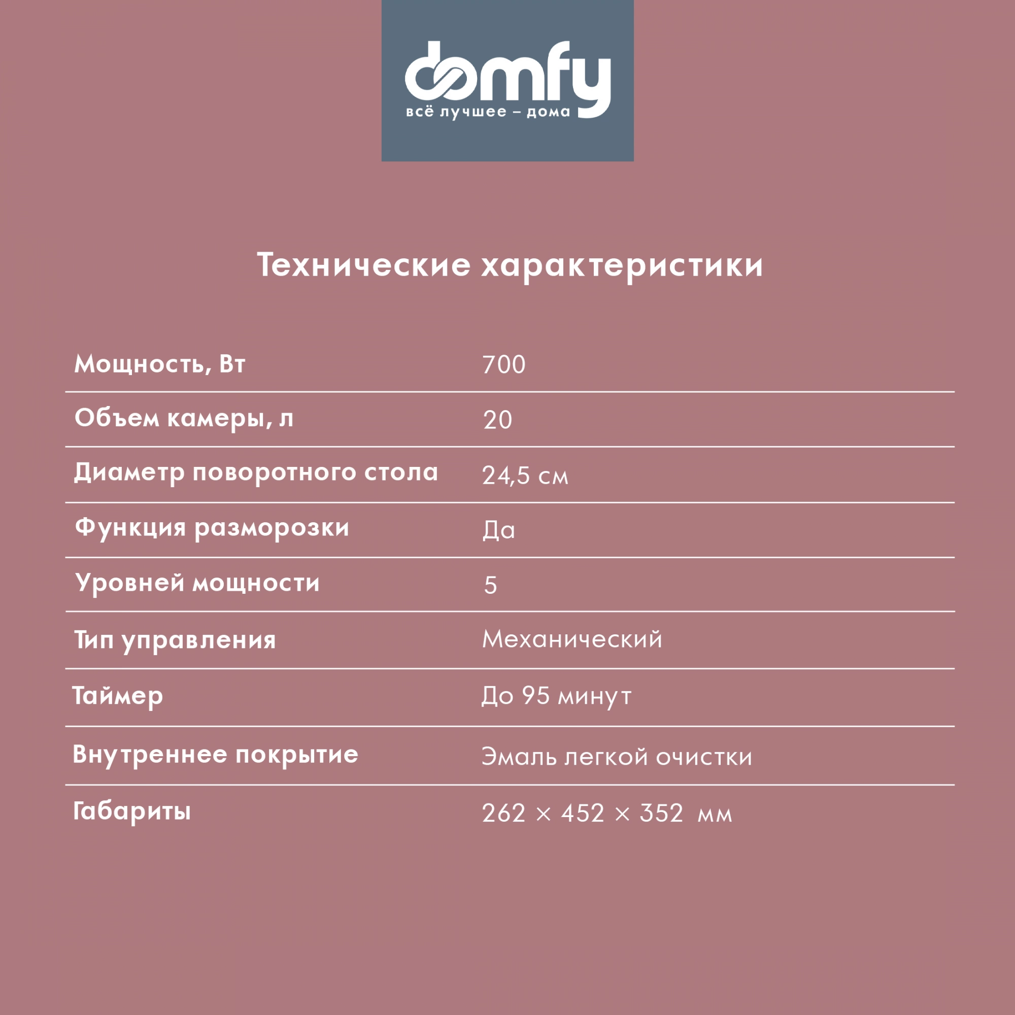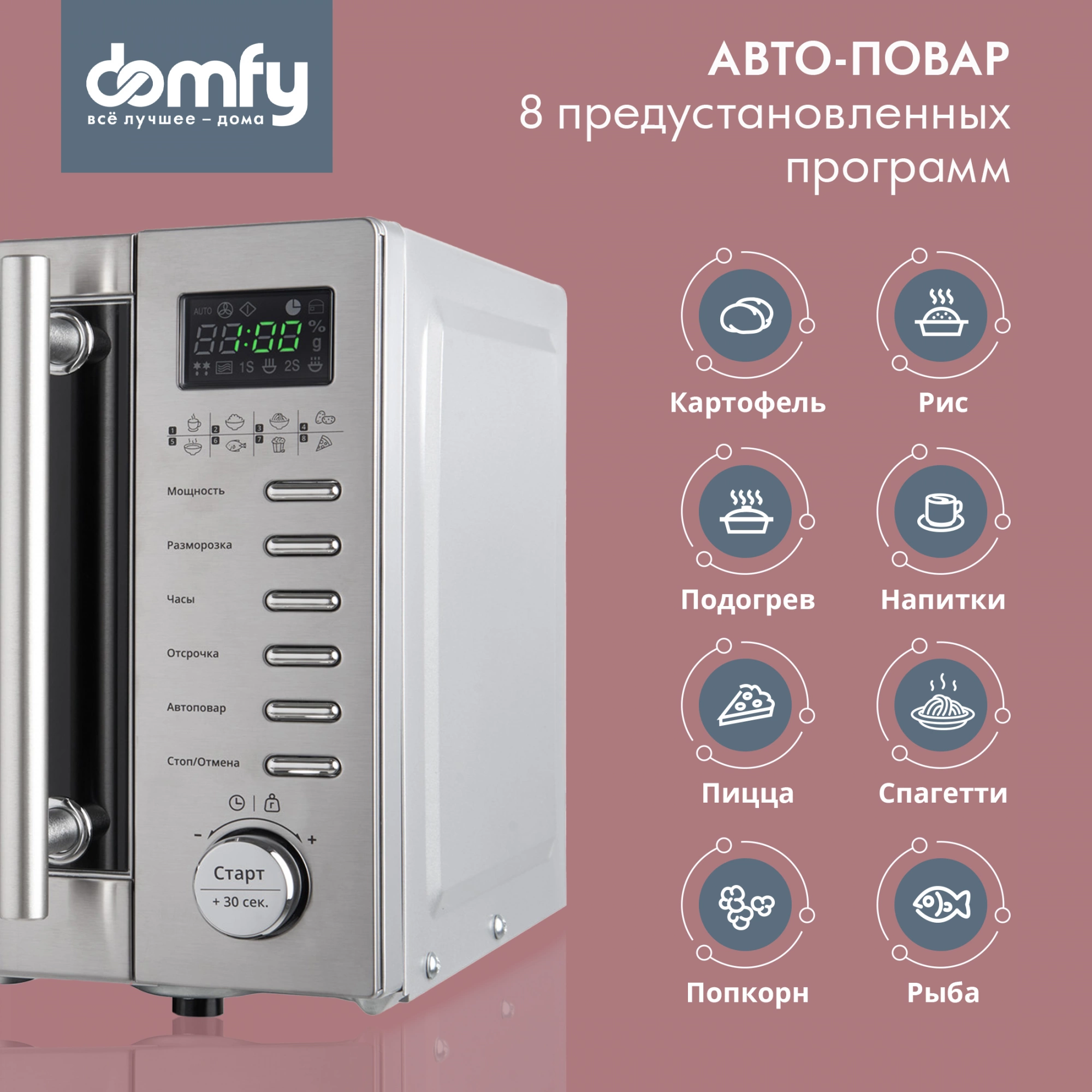 Микроволновая печь DOMFY DSS-MW301 отлично подходит для домашнего использования. Она позволит сэкономить время и быстро приготовить простые блюда, а также разогреть их точно к назначенному времени.