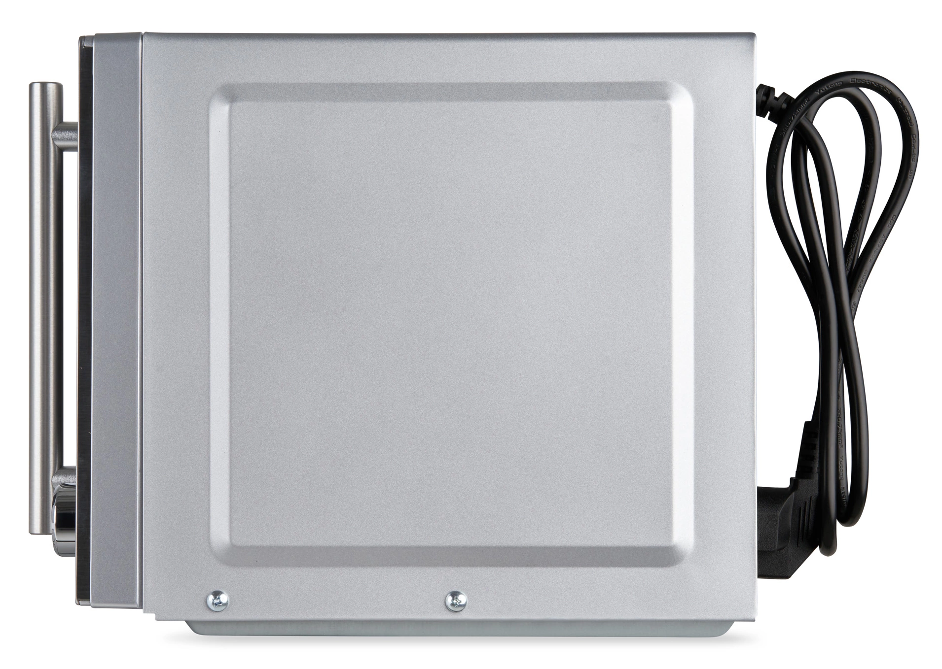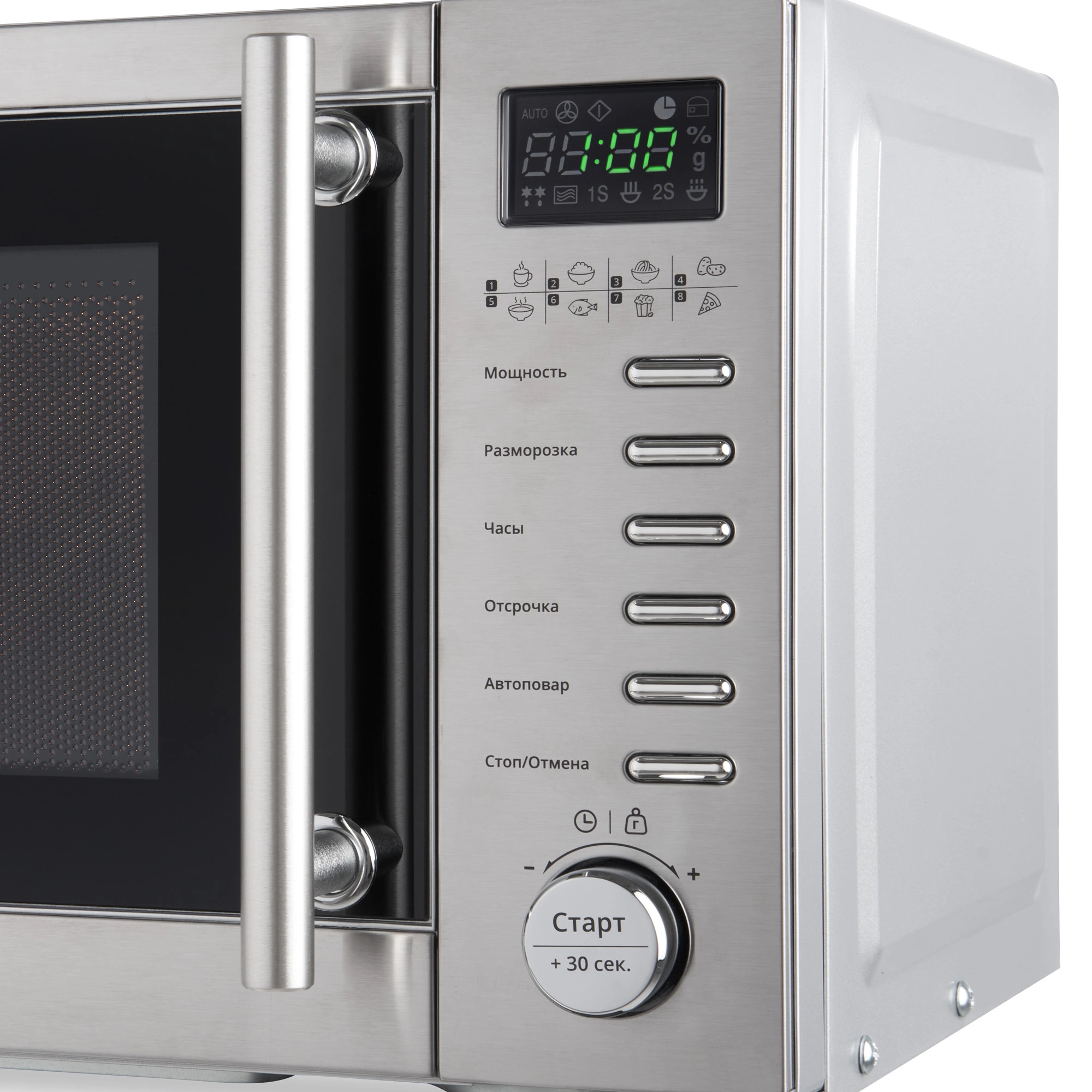 • Современный дизайн. Корпус цвета металлик, отделка дверцы и панели управления элементами из нержавеющей стали, хромированные кнопки и ручка придают микроволновке стильный и технологичный внешний вид.