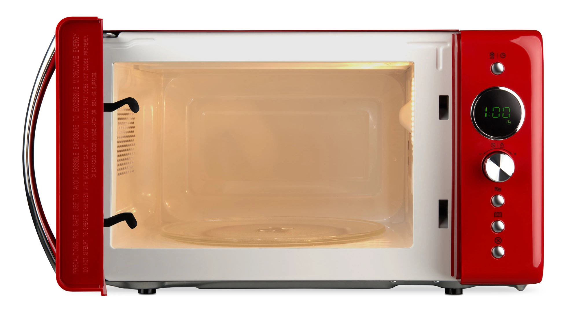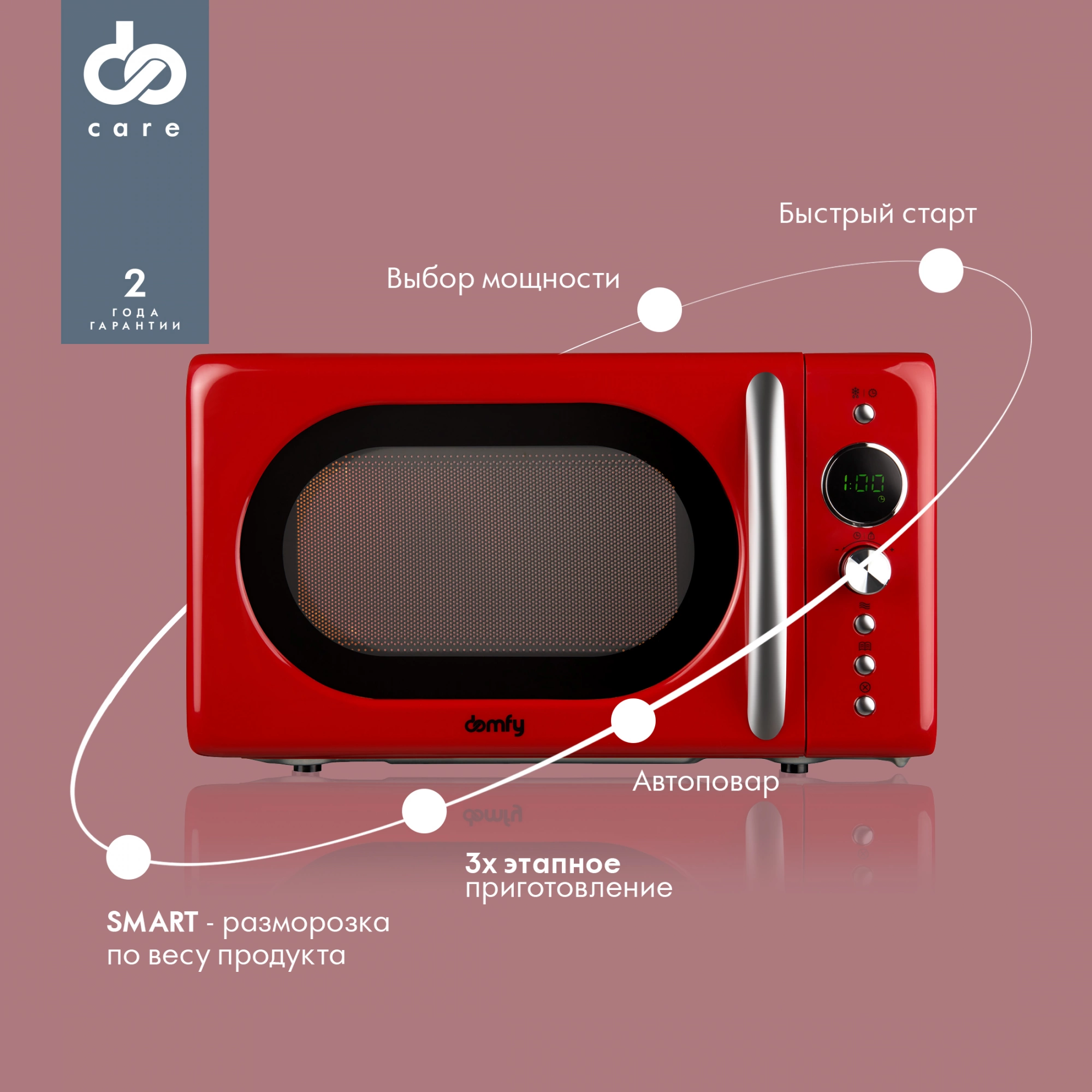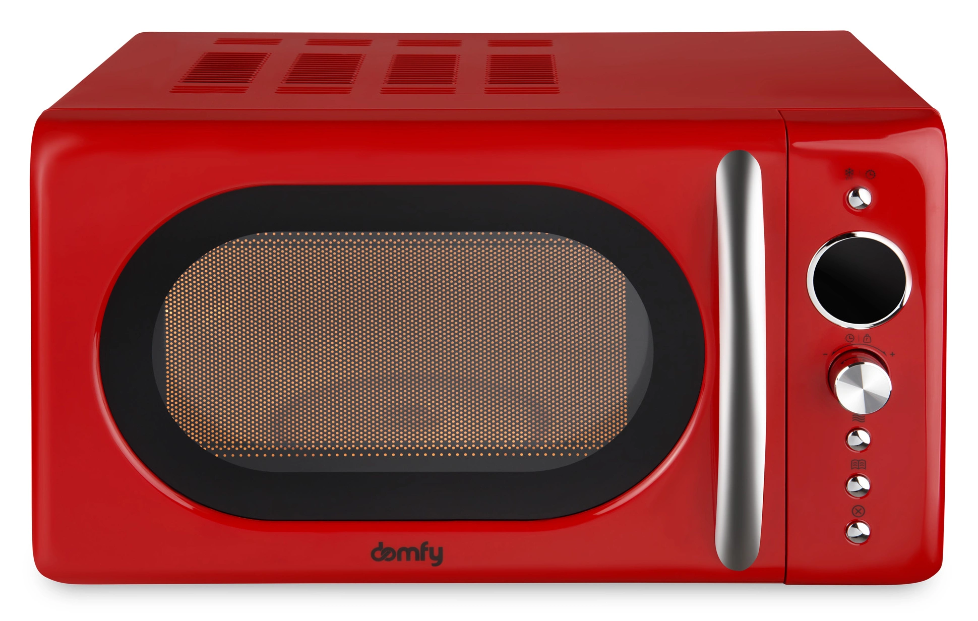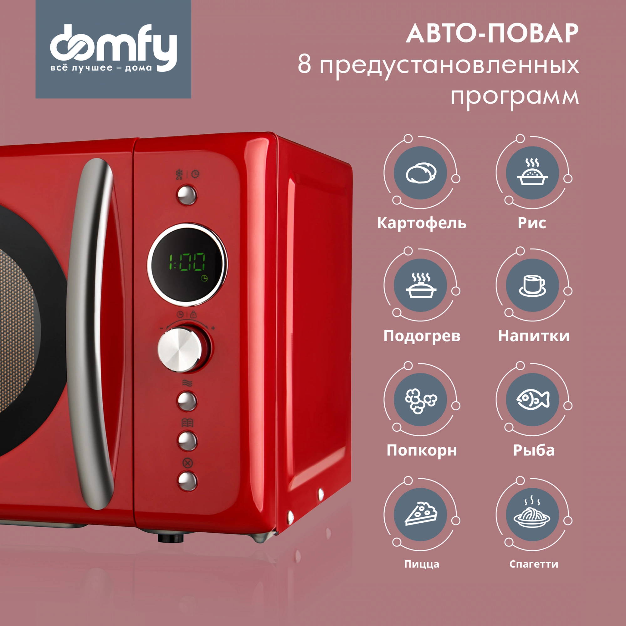 Стильная ярко красная микроволновая печь DOMFY DSR-MW601 объемом 20 л и мощностью 700 Вт с поворотным столом диаметром 24,5 см станет одним из самых заметных и функциональных элементов на кухне. Характерные особенности этой модели – яркий винтажный дизайн в сочетании со встроенными алгоритмами приготовления некоторых блюд и широкими возможностями для ручных настроек.