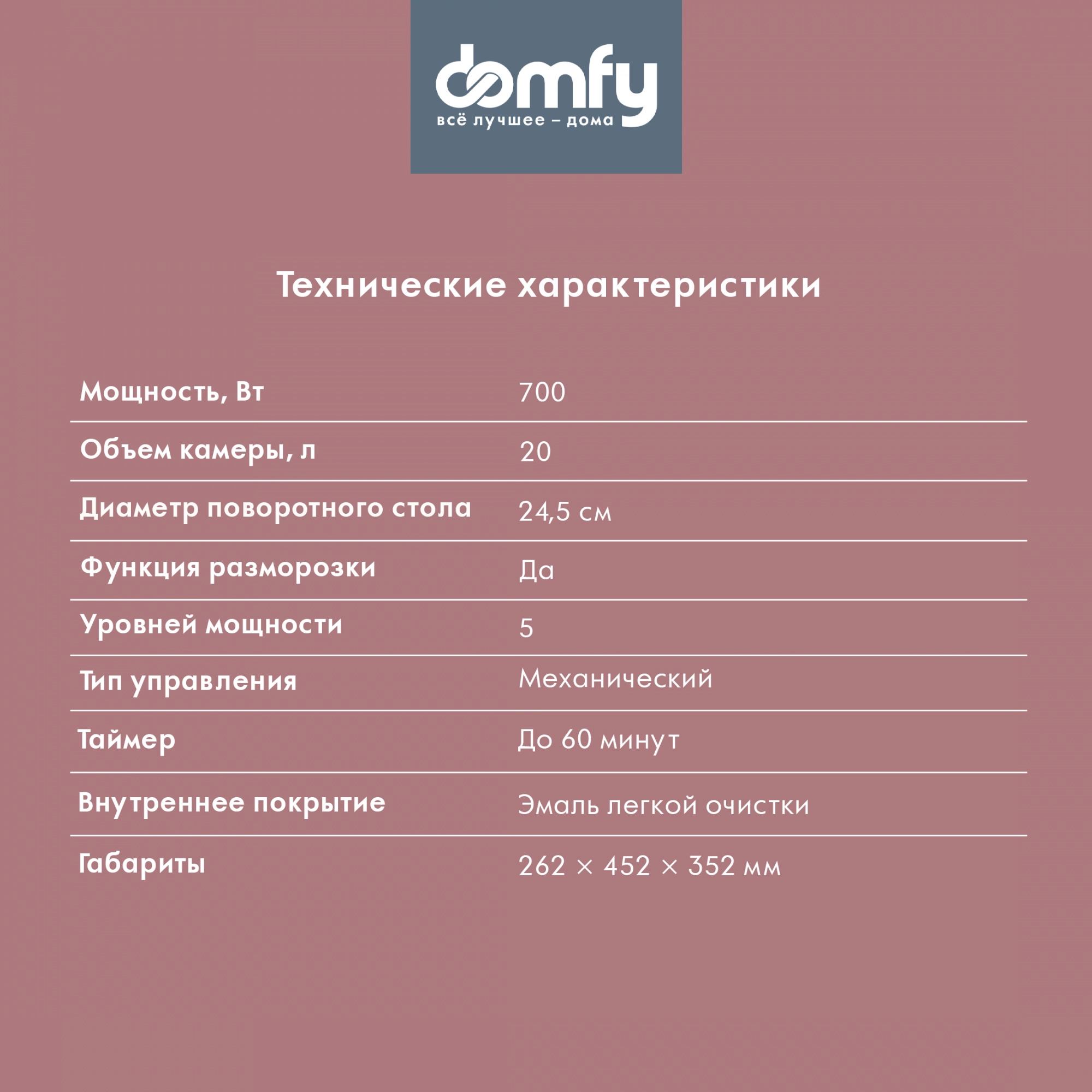 Микроволновая печь DOMFY DSR-MW601 идеально подойдет ценителям функциональной и оригинальной кухонной техники. Она позволит получать удовольствие от процесса приготовления пищи и будет радовать своим неординарным внешним видом владельцев и их гостей.