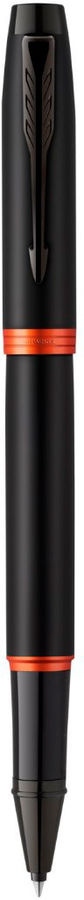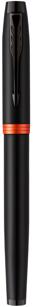 Ручка Parker с полностью черной отделкой корпуса, а также акцентами в виде ярко-оранжевых колец.