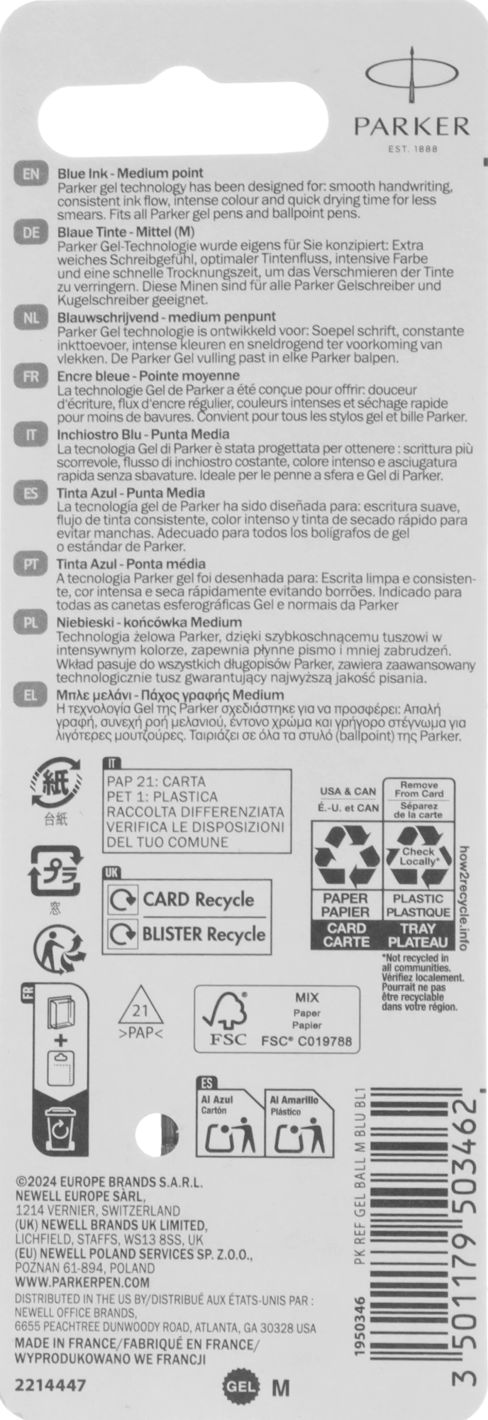 Упаковка включает: 1 стержень с гелевыми чернилами, которые подходят для всех шариковых и гелевых ручек Parker.