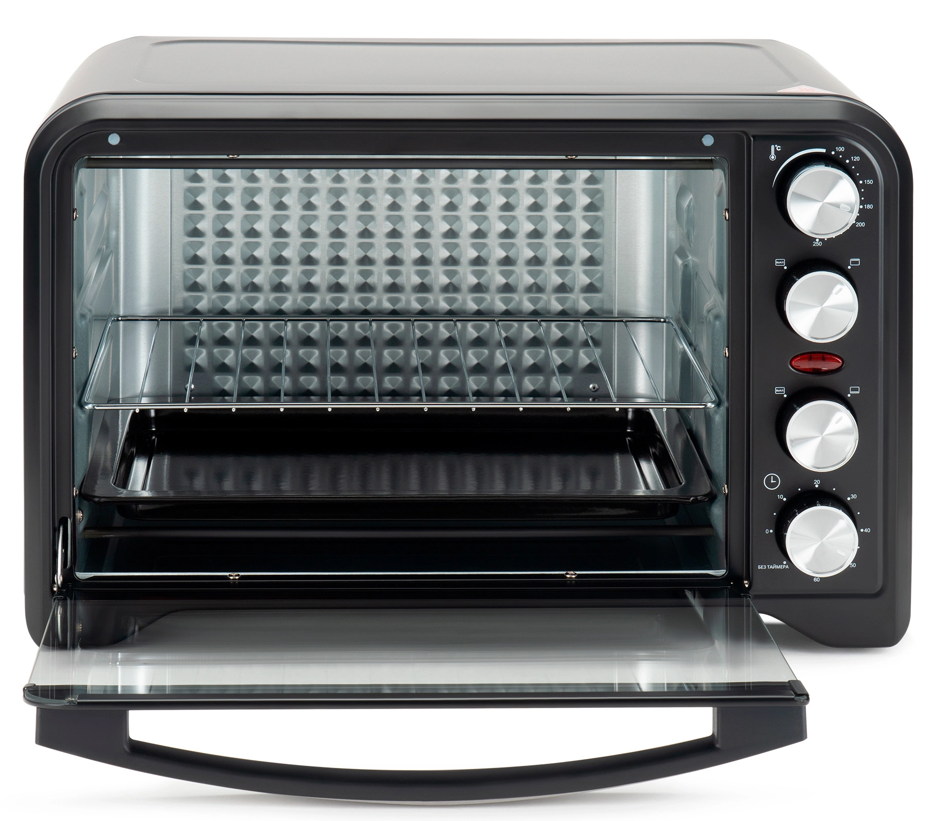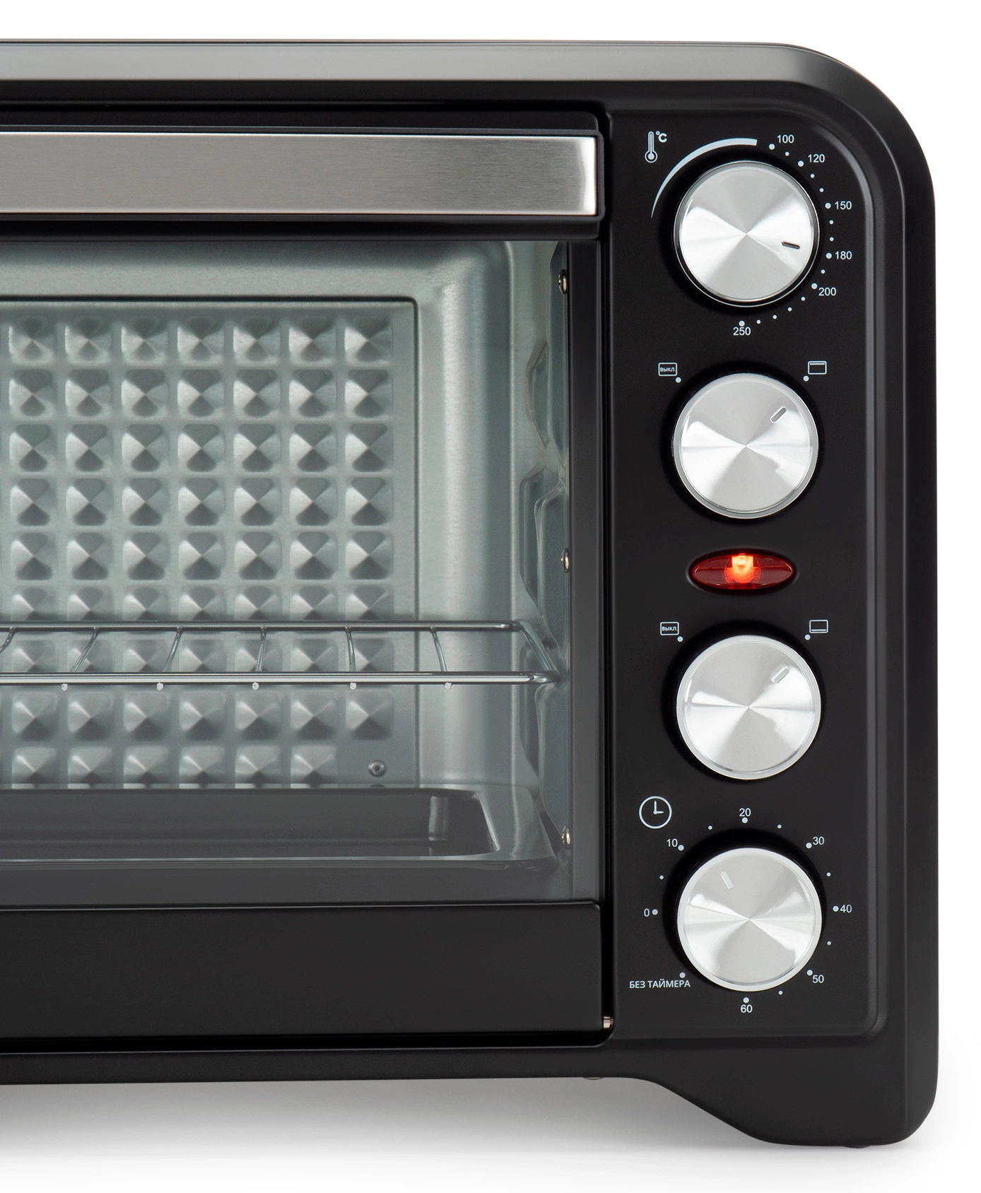 Таймер с автоотключением. Мини-печь автоматически отключится по прошествии времени, установленного при помощи таймера. Максимальная продолжительность 60 минут, шаг – 5 минут. Если для приготовления требуется более часа, достаточно выбрать режим «Без таймера», а когда блюдо будет готово, перевести регулятор таймера на значение «0».