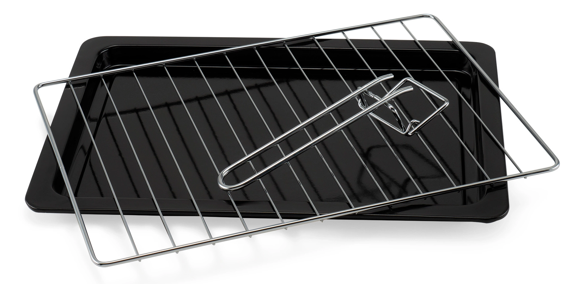 Решетка-гриль, противень и ухват в комплекте. В комплектацию ростера входит никелированная решетка для гриля, эмалированный противень и ухват для его извлечения.