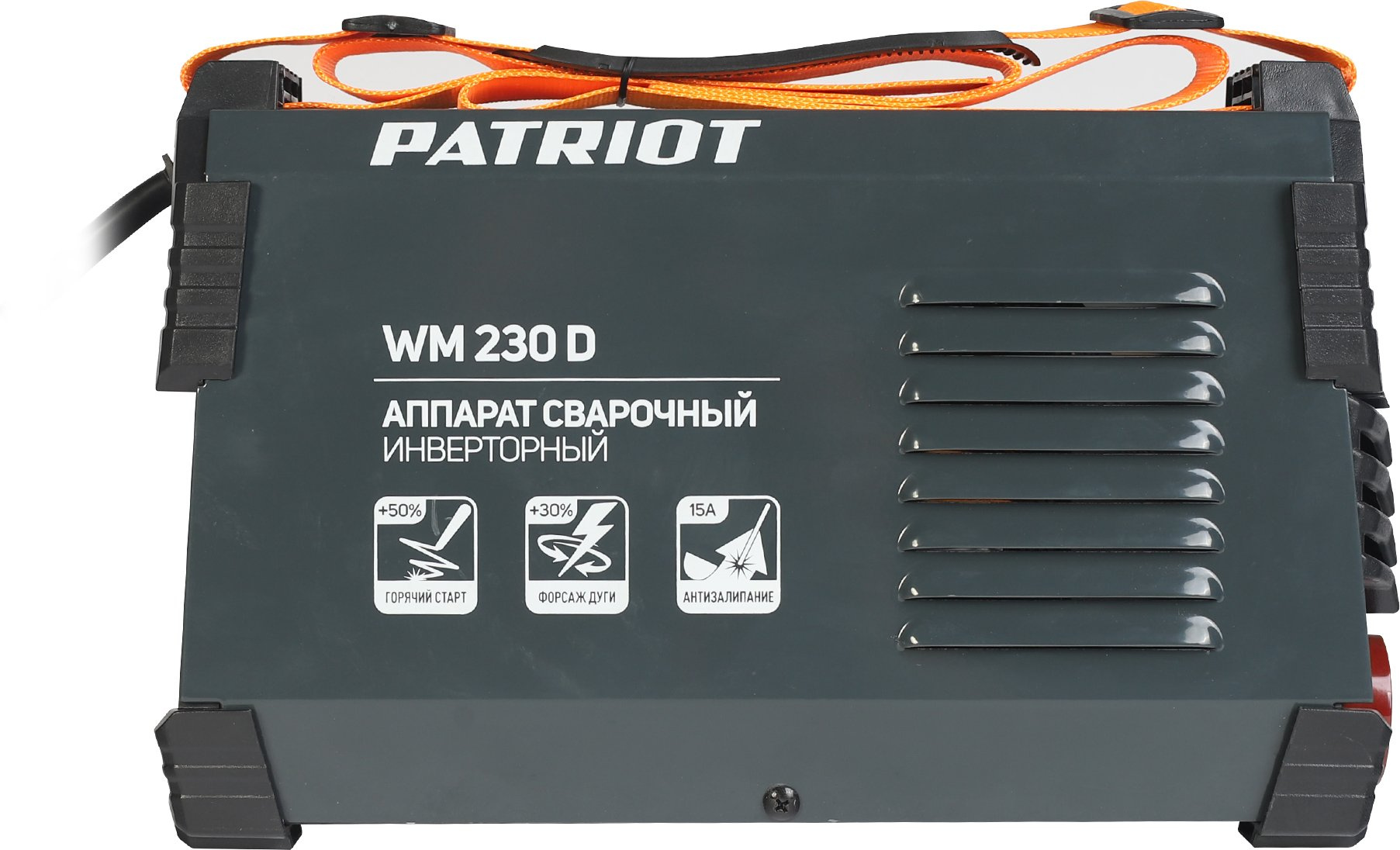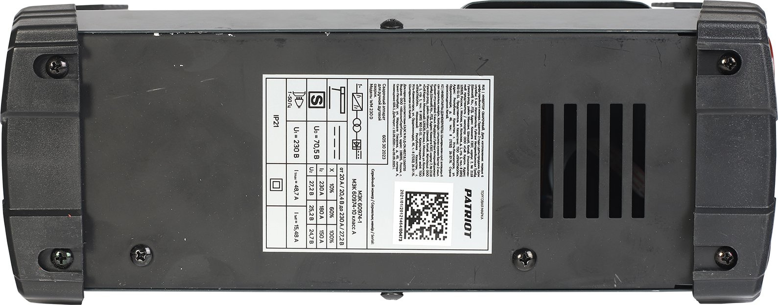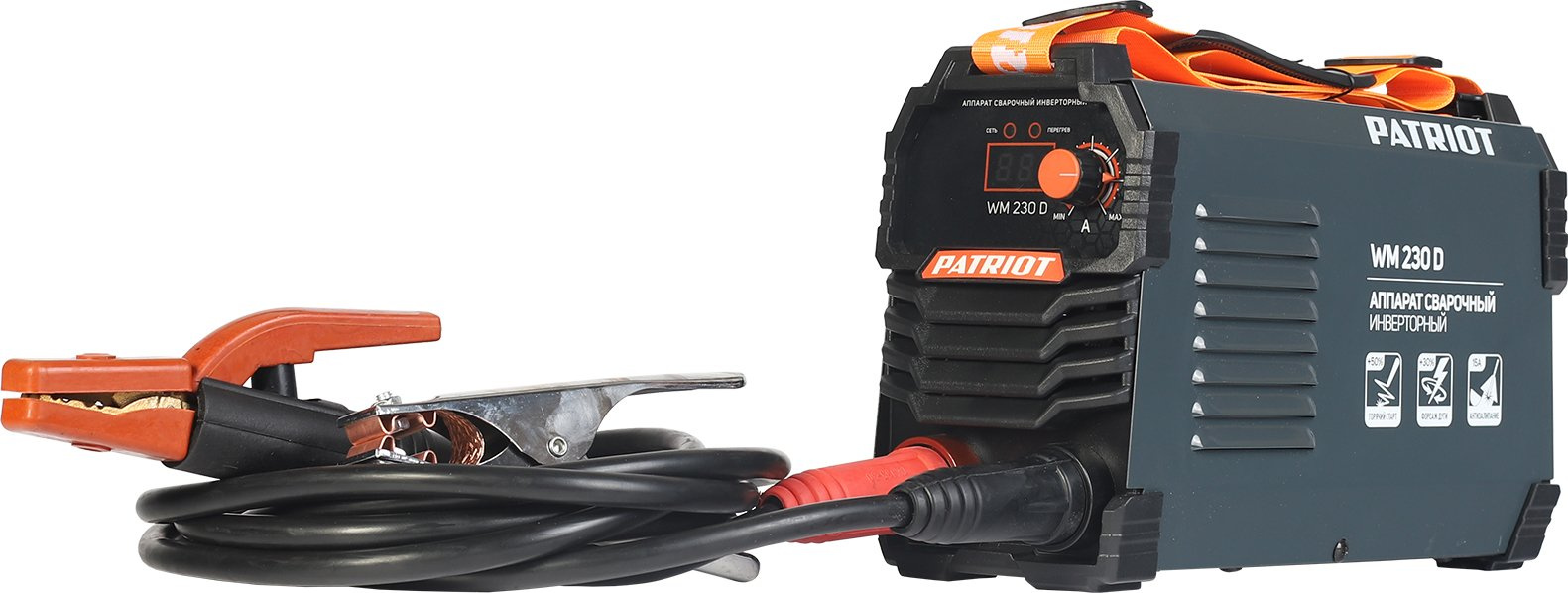 Сварочный аппарат, держатель электрода с кабелем 2,5 м. сечение 25 кв. мм.; клемма «земля» с кабелем 2 м. сечение 25 кв. мм.; регулируемый ремень для переноски; эектроды Patriot ЭР46, 3 мм., 1 кг.; инструкция.