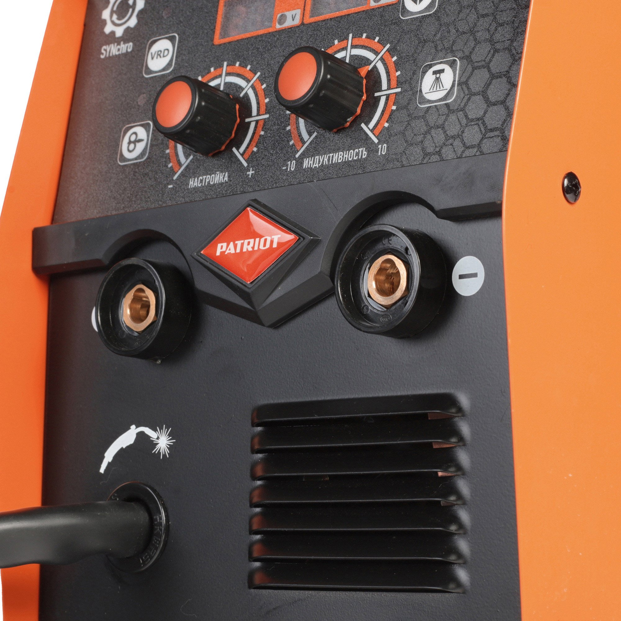 Синергетическая настройка тока и напряжения. Регулировка индуктивности. Переключатель режимов MIG/MAG- MMA. Кнопка протяжки проволоки. 2 дисплея. Индикаторы питания и перегрева.